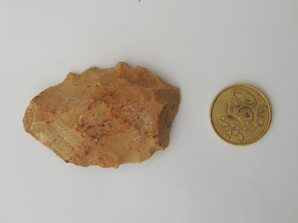 et pour cette autre pièce, je pence à: Petit biface avec cassure d'usage et petit fossile Crétacé(oursin?).