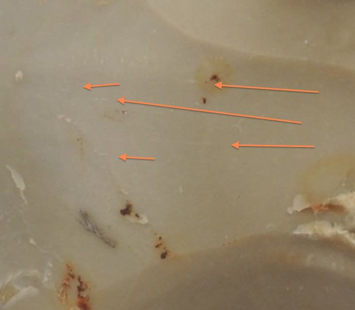 et, sur cette même face, ces petites stries parallèles qui sont peut être des traces d'un polissage ultérieur:gratte-tete: