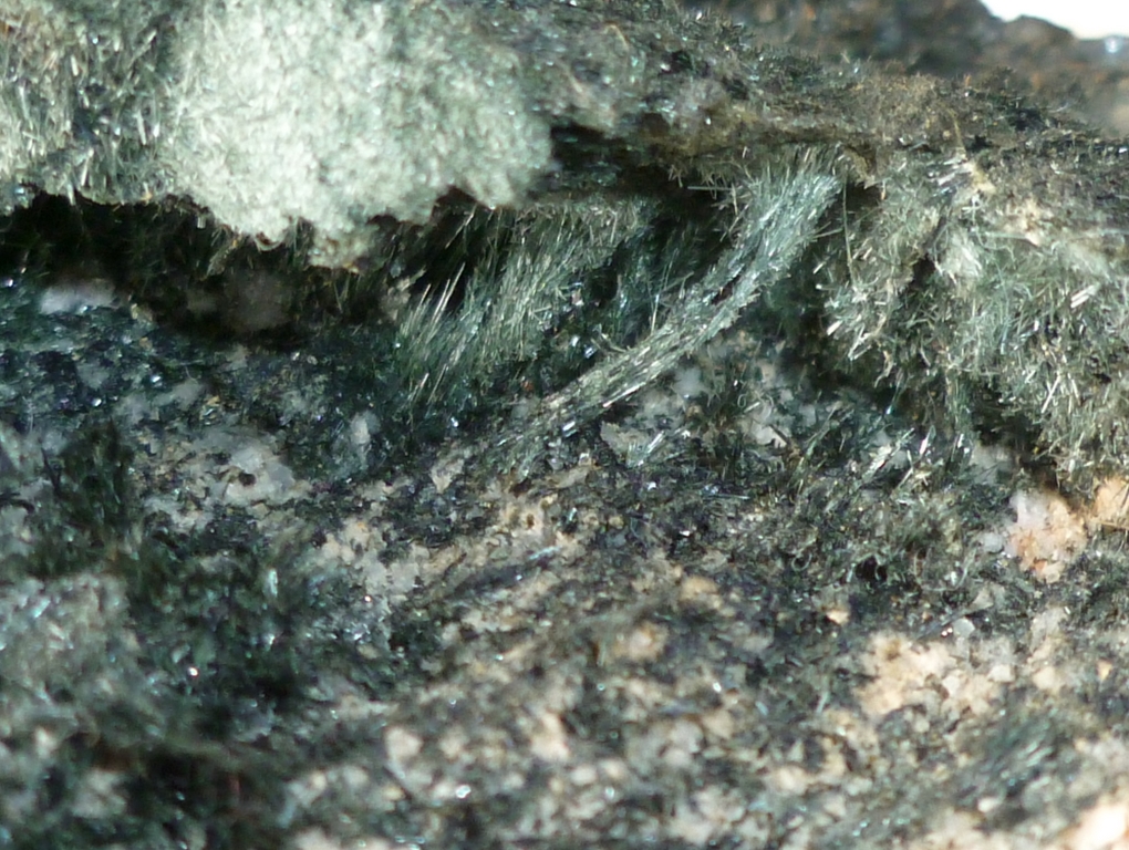 on a ça aussi on pensait épidote mais de mémoire vu que mes deux neurones restants ne se croisent plus beaucoup .... ce serait plus vers actinote amiante ... à confirmer par le frangin qui a tous ses neurones lui ! on avait d'autres trucs plus pulvérulents aussi dans les remplissages de ces minis géodes bizarres mais bon à  identifier c'est plus chaud et surtout quasi inutile pour une pincé de poudre au fond d'un tube ....