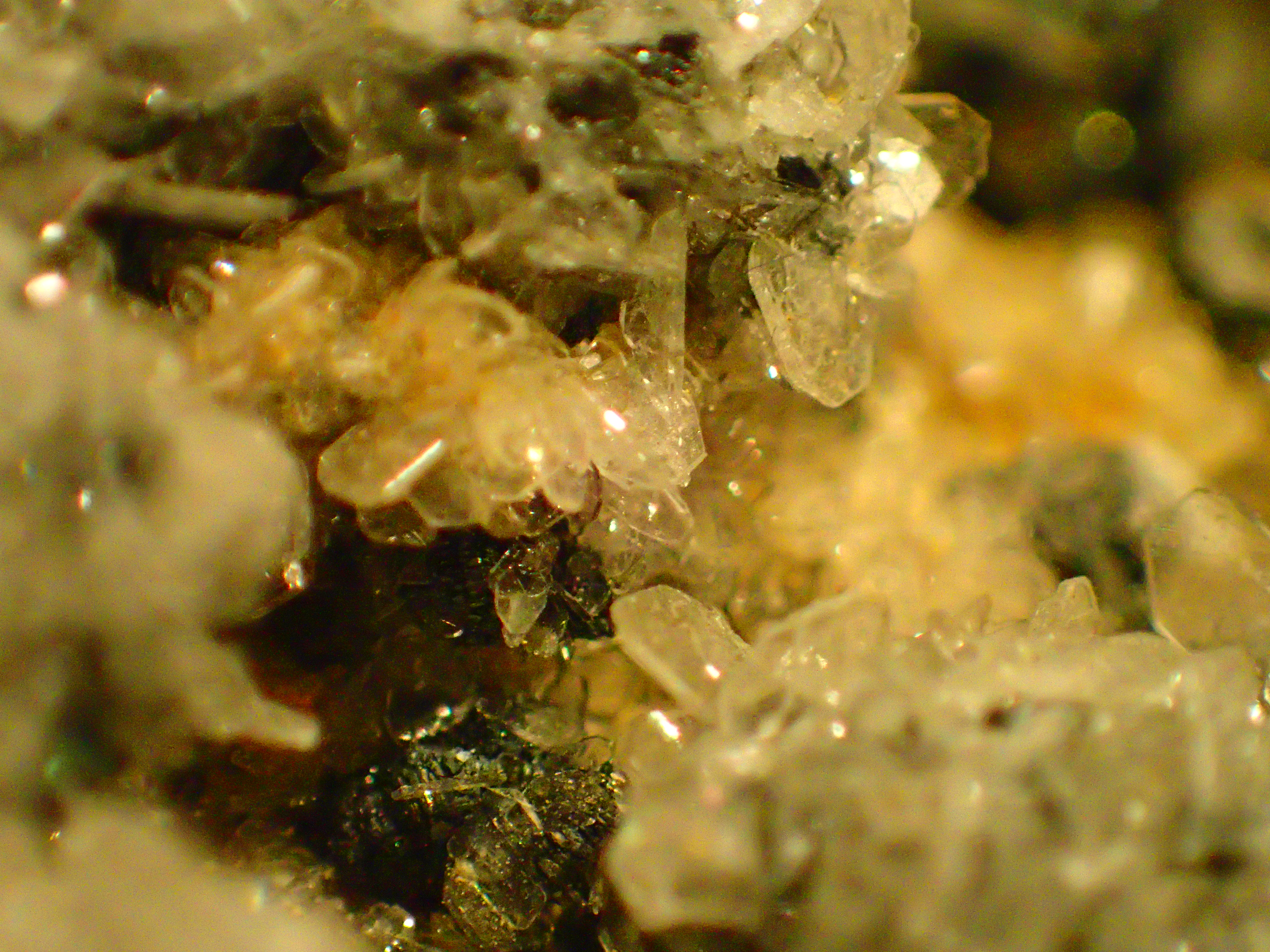 Voici quelques photos plus précises du minéral noir (dont une photo avec un cristal cassé ou on voit l'intérieur) et des cristallisationsdu transparent