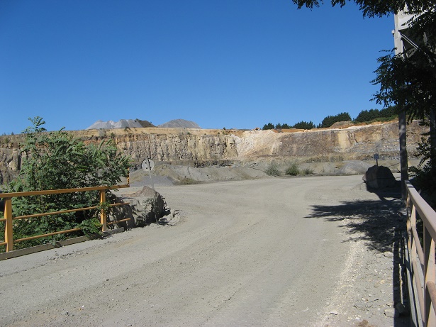 voici une photo du front de taille de la carrière on y voit clairement un des filons de pyrite qui traverse toute la carrière (bande noire au deuxième étages) .