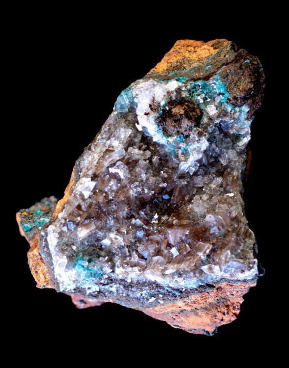J'ai passé des heures sur Mindat et autres sites en regardant tout ce qui provient de Bolivie, et franchement, je n'ai rien trouvé de très ressemblant. Par contre, Mapimi, ça c'est une bonne piste! J'ai deux échantillons de Mapimi, une hémimorphite et une adamite. et la gangue est rigoureusement la même. En regardant les détails sur Mindat, j'ai trouvé des photos d'échantillons qui sont les frères jumeaux du mien. A Mapimi, la malachite est bien verte, et les cristaux turquoise de mon échantillon sont tout à fait similaires aux photos de rosacite. Et les cristaux incolores sont manifestement de l'hémimorphite. D'ailleurs, hémimorphite et rosacite vont bien ensemble (à cause du zinc).