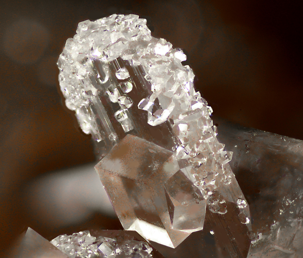 En y regardant de plus près, dans les cristaux de calcite sont enchâssés d'autres cristaux, tout aussi incolores et transparents, en forme de prismes plats allongés (monocliniques?), la plupart ayant leur extrémité recouverte d'une myriade de petits cristaux de quartz (alors que la calcite en est dépourvue).