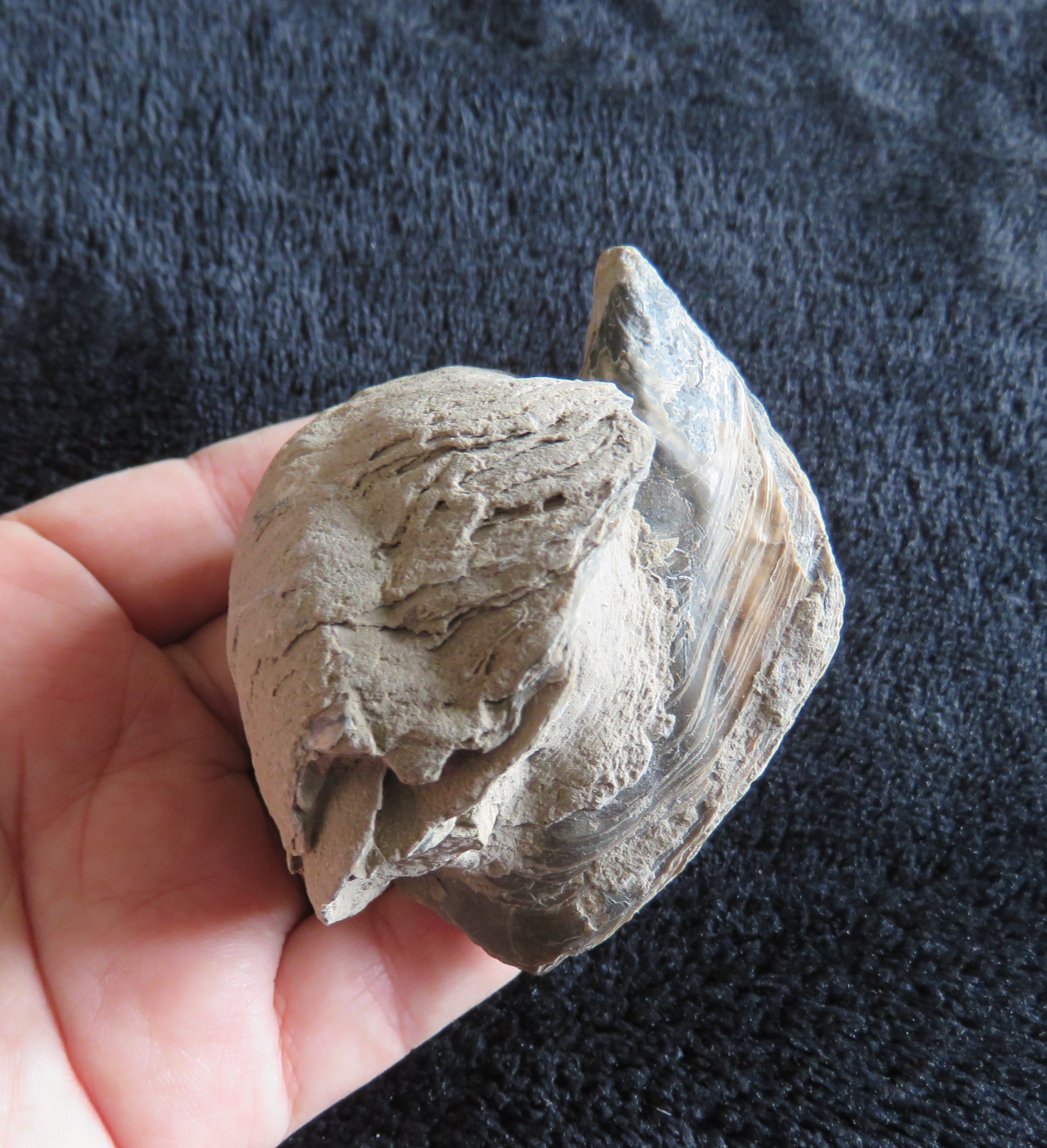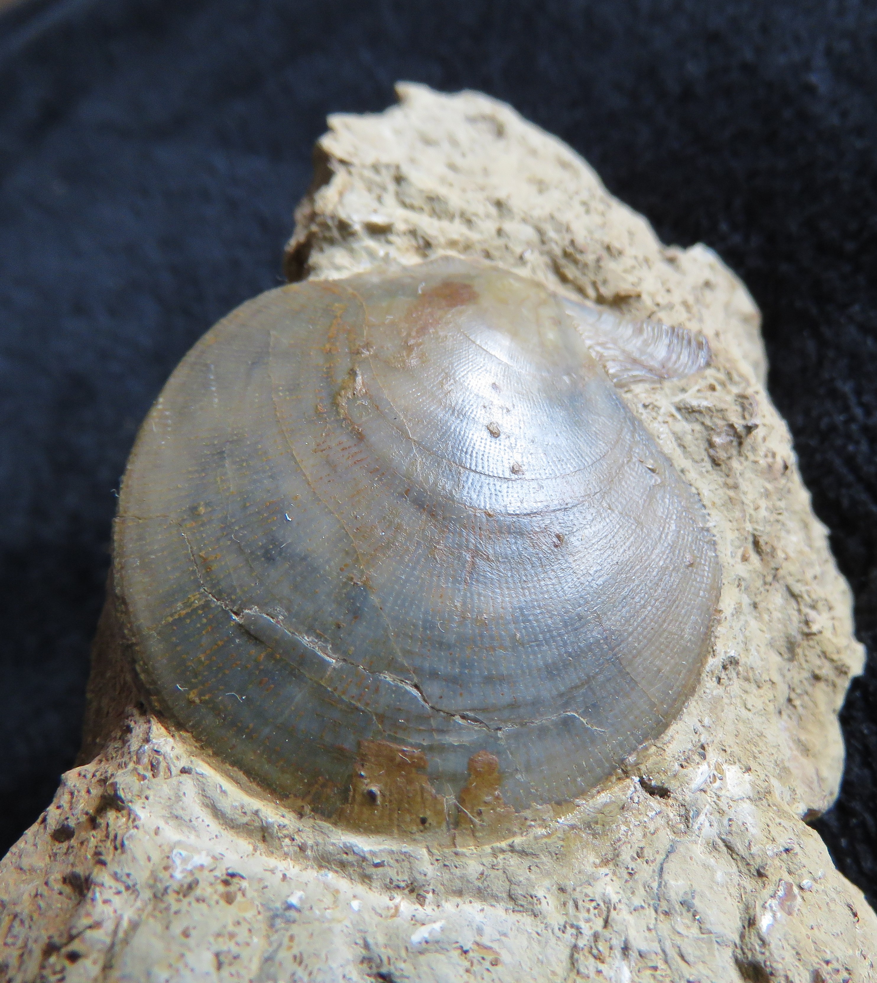 Modiolus bipartitus: une espèce de "moule" relativement courante dans l'Oolithe de Villers. Finalement, il n'est pas si fréquent de la trouver intégralement conservée, la coquille était très fine.