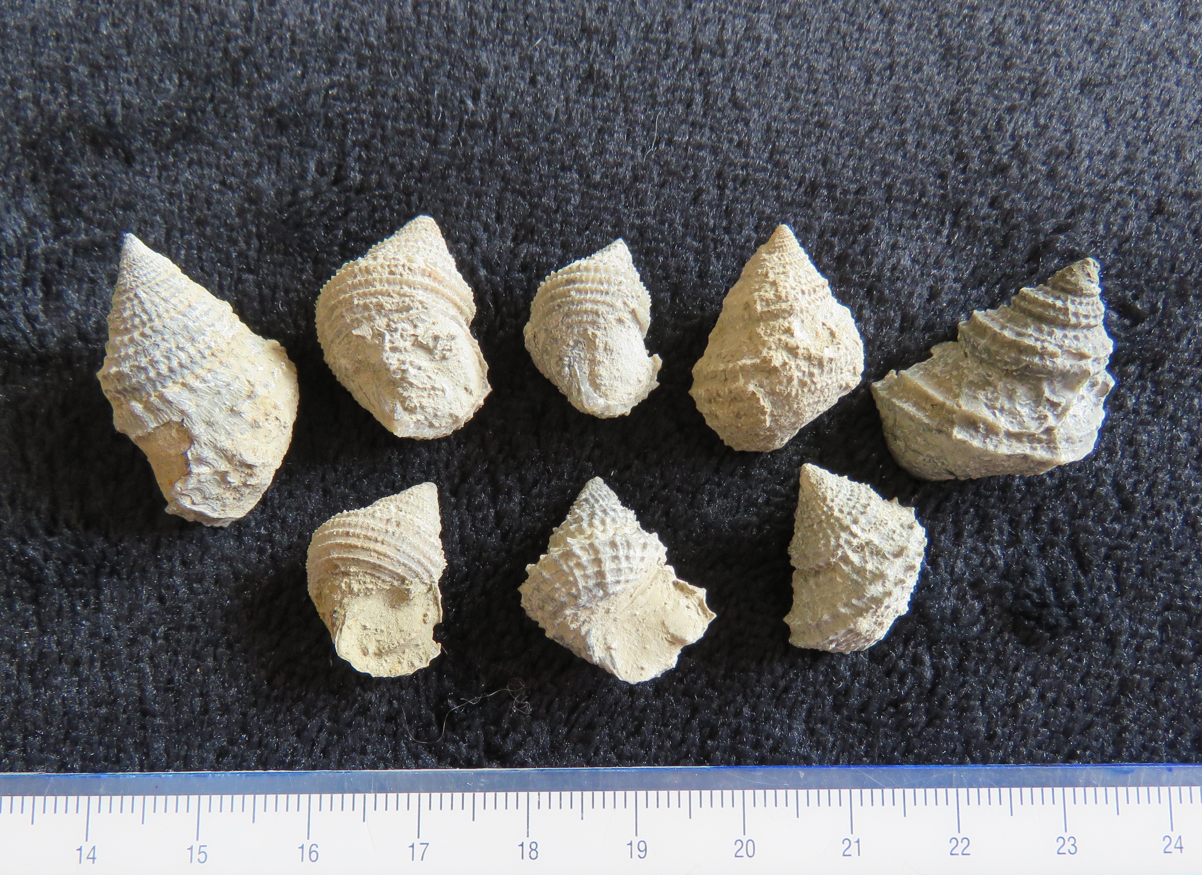 Ok merci Pyb, ces corrections et précisions sont les bienvenues. La documentation accessible à propos de ces gastéropodes est pauvre (comme noté plus haut), ou ancienne. Les individus à plus forte ornementation spirale et profil pas en gradins sont donc à rattacher aux Troches. Le problème est que dans mon ensemble (non figuré ici dans son intégralité, mais  comptant plus d'une vingtaine d'individus) j'ai un certain nombre de coquilles à morphologie qu'on pourrait qualifier d'intermédiaire.