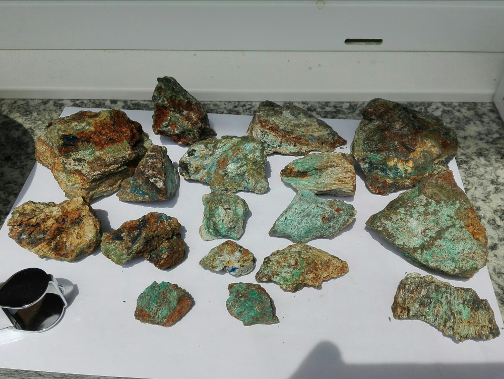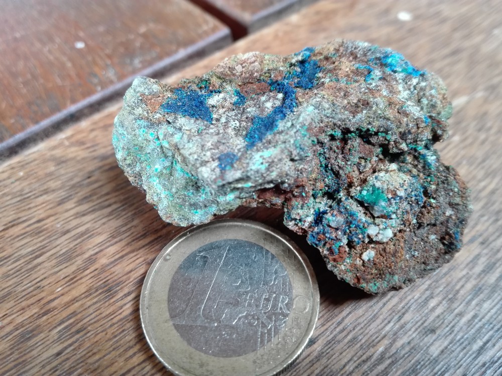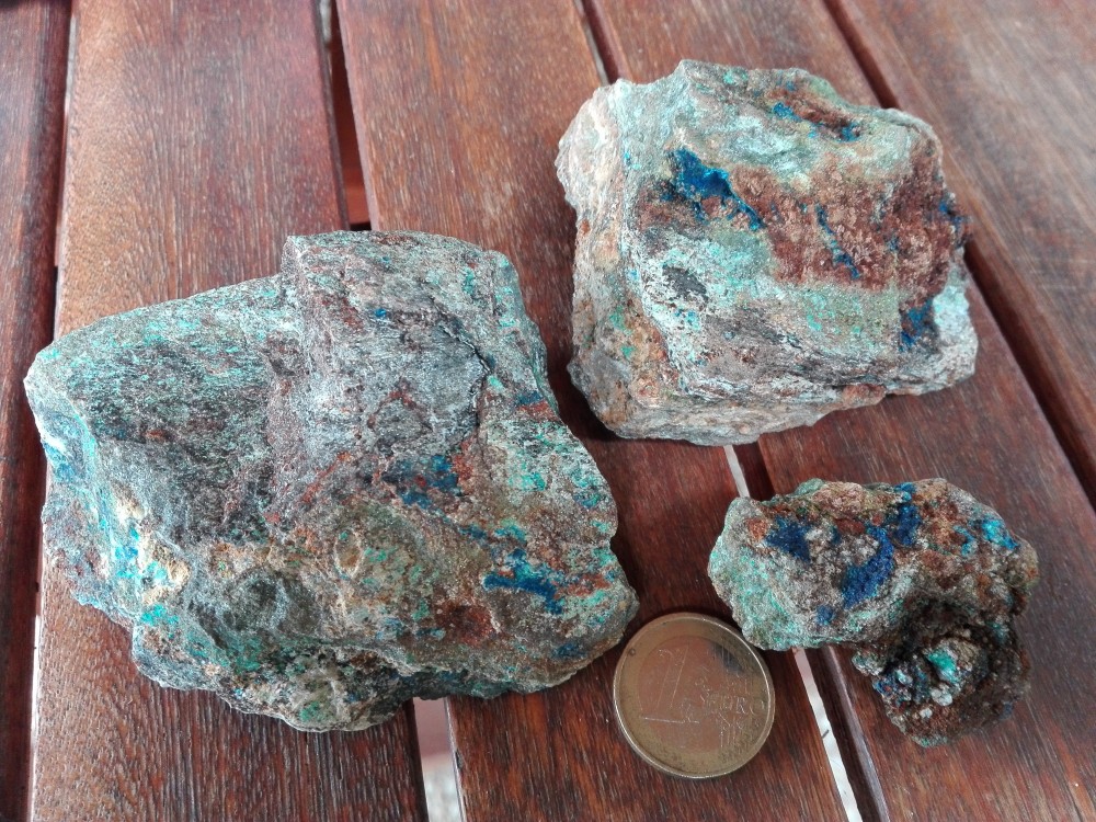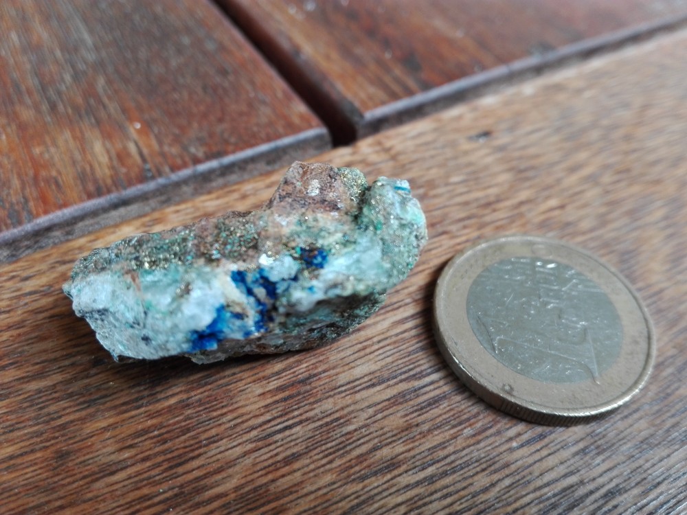 sympa comme trucs mais pas si facile d'être affirmatif car c'est souvent azurite (bleu) / malachite (vert) ; mais il existe des dizaines de minéraux proches souvent par altérations diverses. En plus ces mines sont pleines d'éléments rares ou le cuivre et le fer. Il y a un bouquin de S Ansermet sur ces questions avec plein d'infos