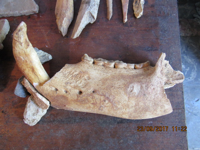 les ossements que j'ai trouvés sous la stalagmite, ont du être extrait par l'homme préhistorique du gisement et déposés avec la poterie au fond de l'autre grotte. Il n'y avait rien d'autre dans le dépôt, qui se trouver entre deux formations stalagmitiques, sans remplissage.