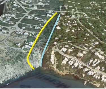 Je reviens donc sur l'interprétation de Dimanche passé au niveau de la falaise, en considérant un angle d'environ 140°entre les tracés des failles et de la côte. Je laisse en suspend le contact Jurassique/Miocène pour ne froisser personne.