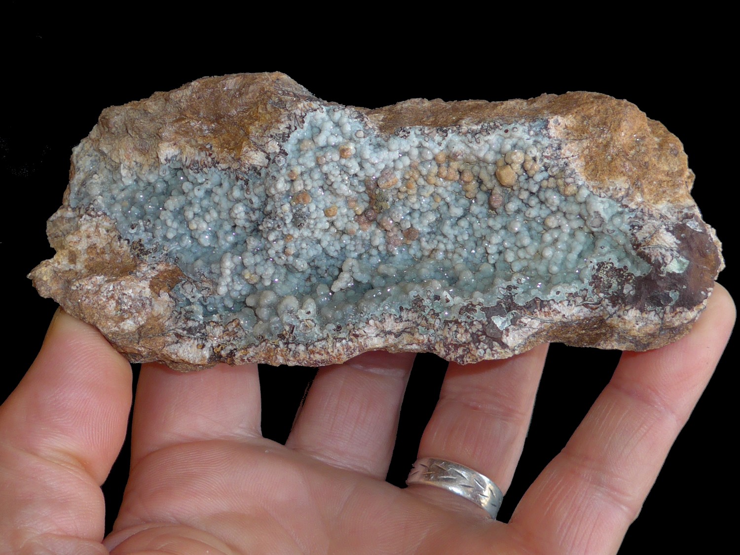 Pièce assez complète puisqu'on retrouve quartz, empreinte de quartz, fluorine, boxwork? et une géode de calcédoine sur le côté !