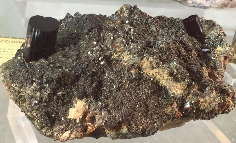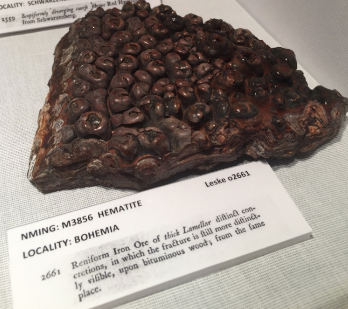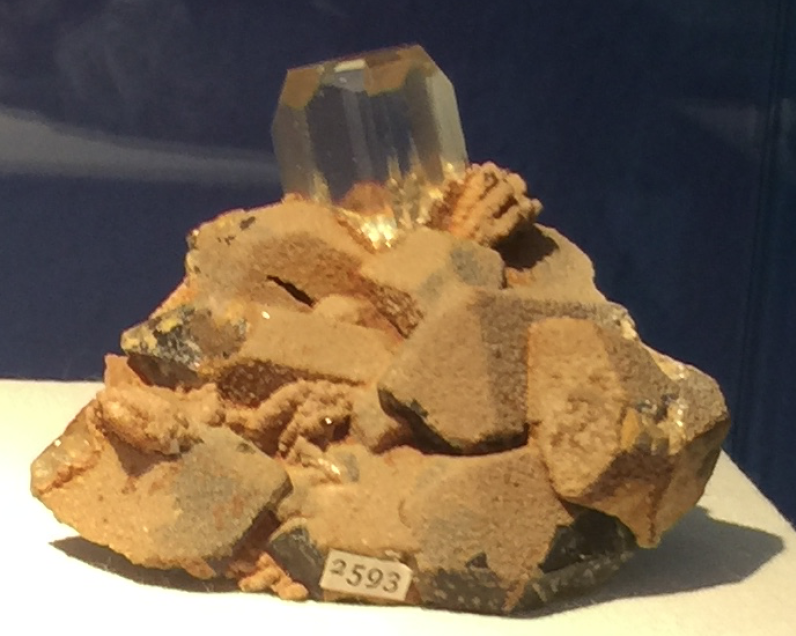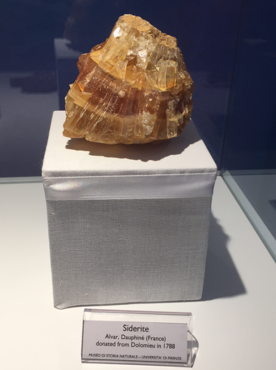 L'étiquette, trés intéressante, précise que le spécimen provient de Dolomieu (peu de choses de lui sont conservées de manière localisable), mais dit qu'il s'agit de "siderite d'Alvar" ! En relisant le Lacroix on pense plus à un spécimen extrait en bas-Dauphiné ?