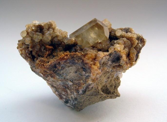 Et deuxiement, encore un flottant, ou l'on appercoit le premier cristal en scalenoedre legerement rosé/violacé, avec une deuxieme generation de calcite jeune qui laisse deux fenetres pour voir le cristal d'origine! 12/13cm