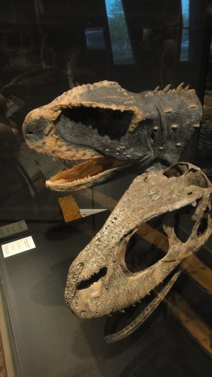 Réplique d'une tête de Carcharodontosaurus, pour une estimation de poids du dinosaure à 4,5 tonnes pour 12,50 mètres de long, vivant à la même période sur l'actuelle Afrique du Nord.