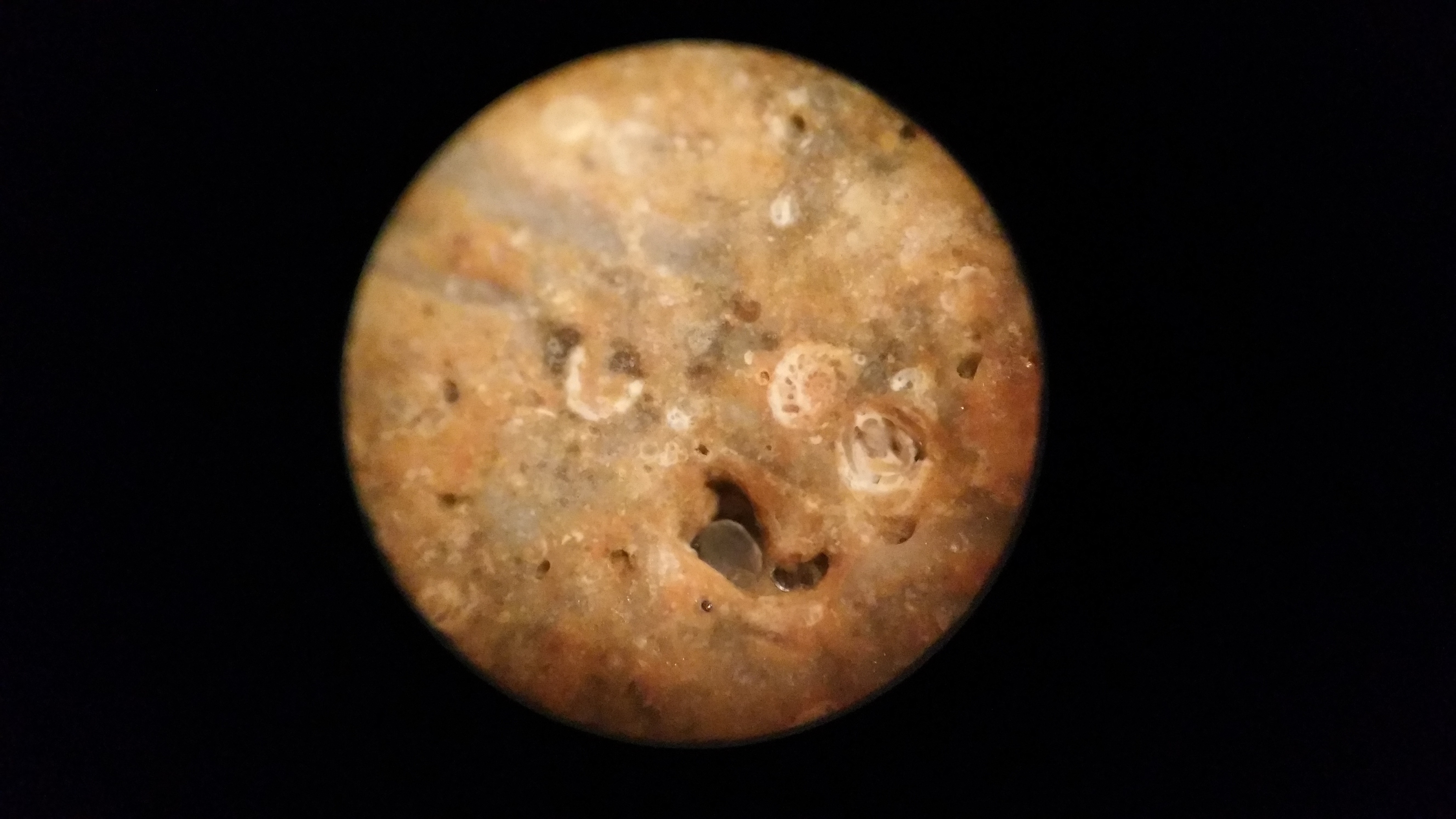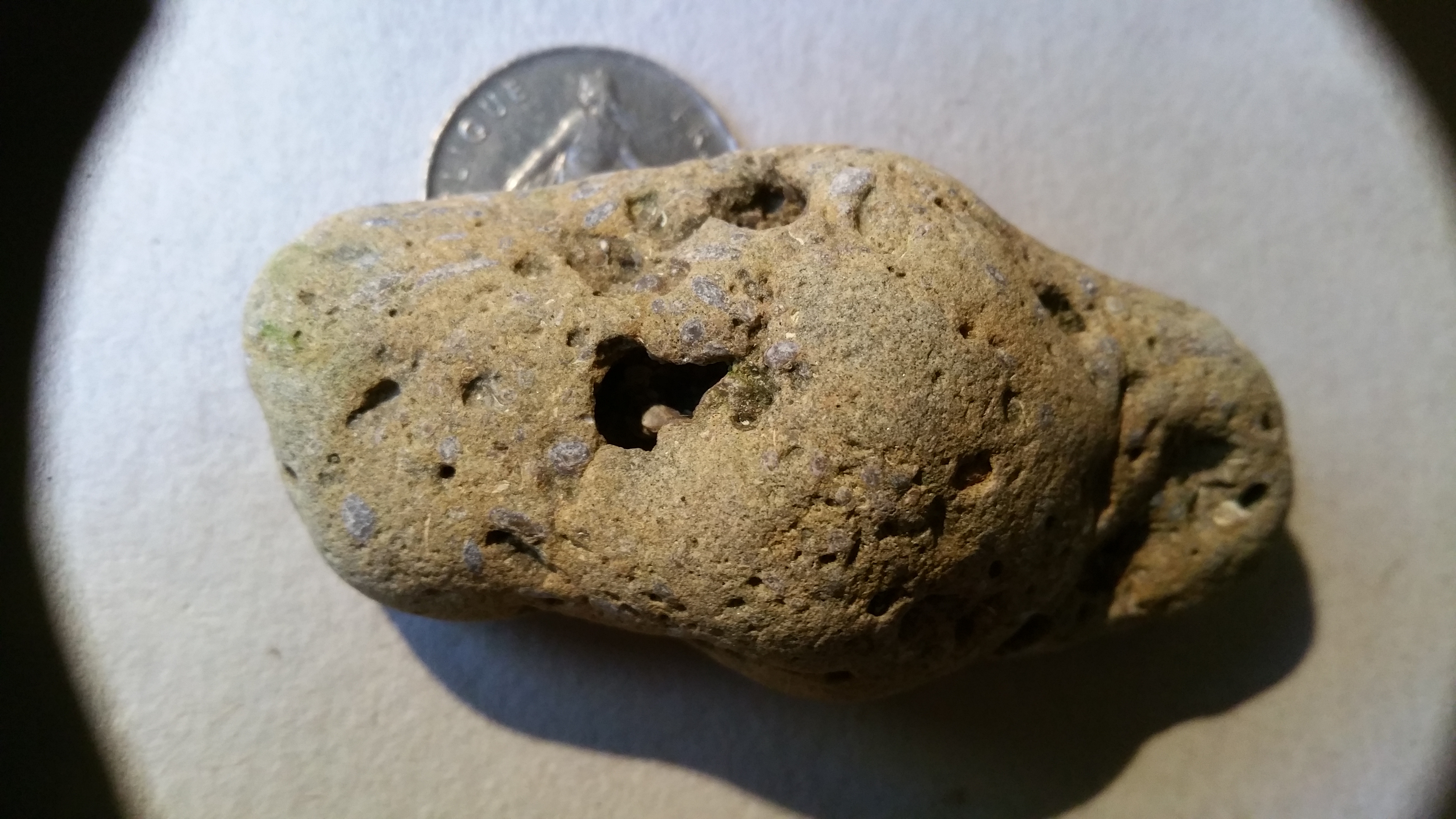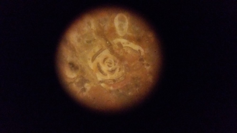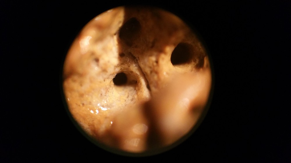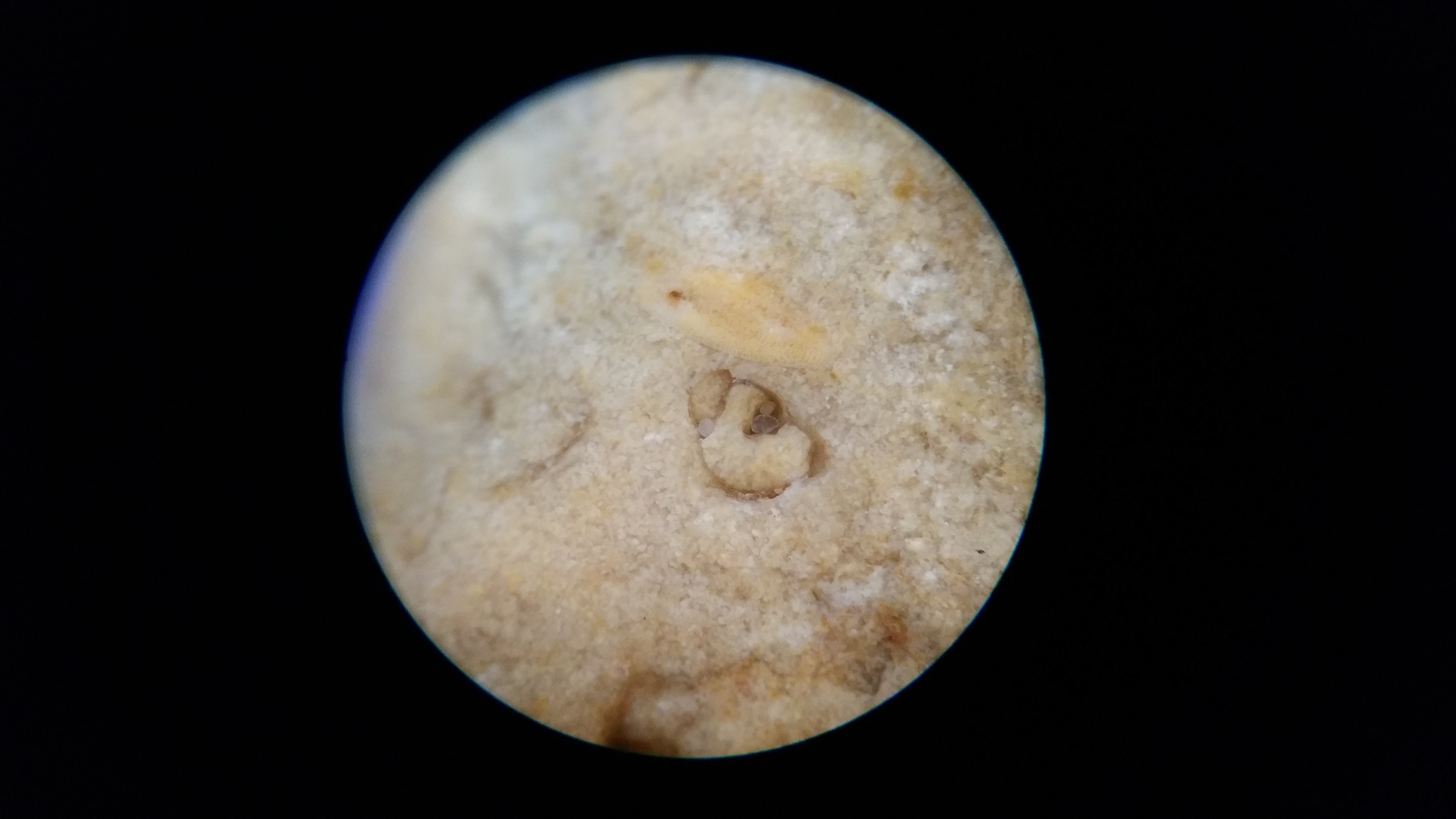 élément argileux bioérodé par le polydore ( deuxième photo ) et les autres traces je ne sais pas :
