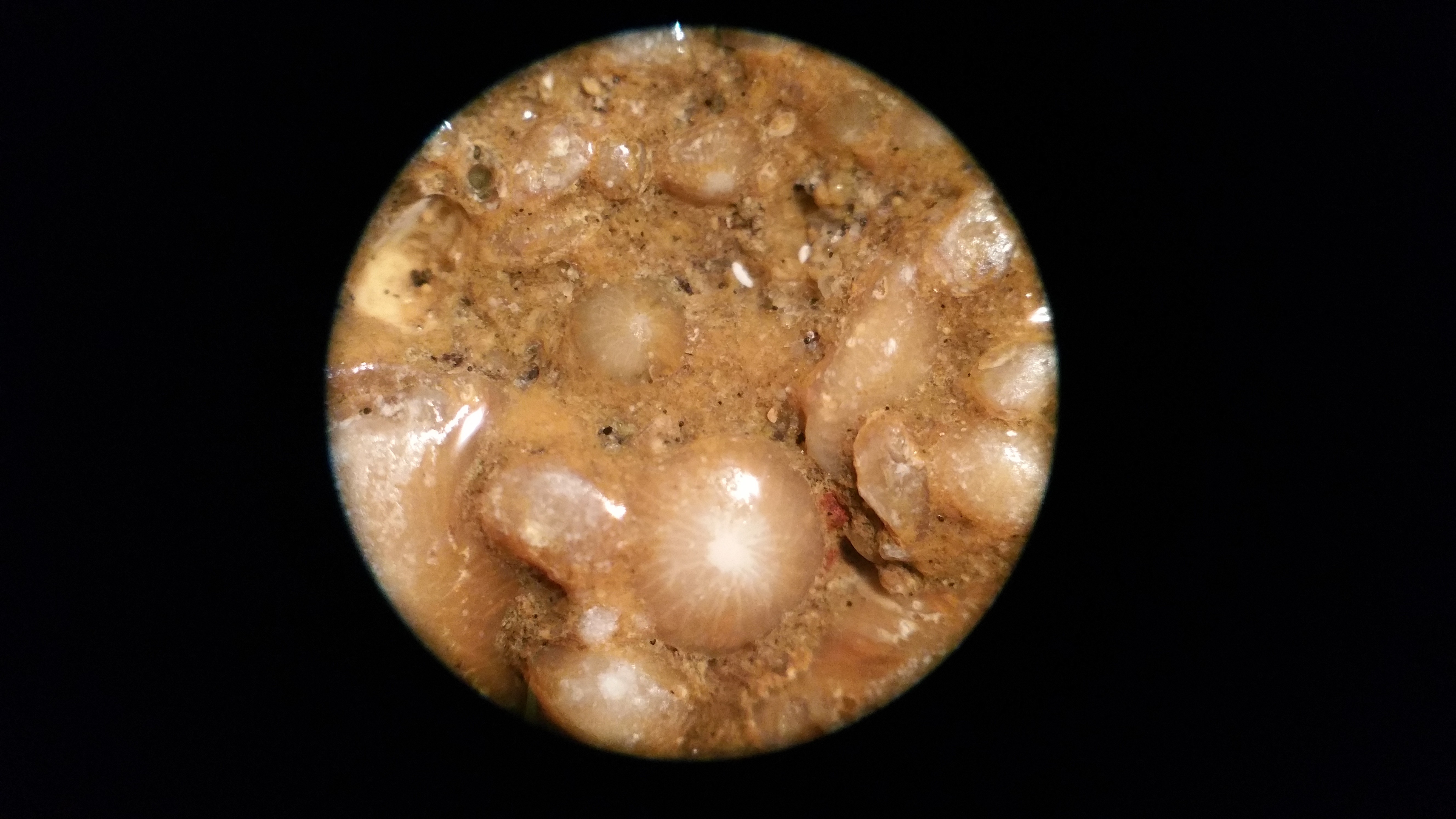 globigérine ou y ressemblant , sur du corail , le tout dans un silex ou ciment calcite :