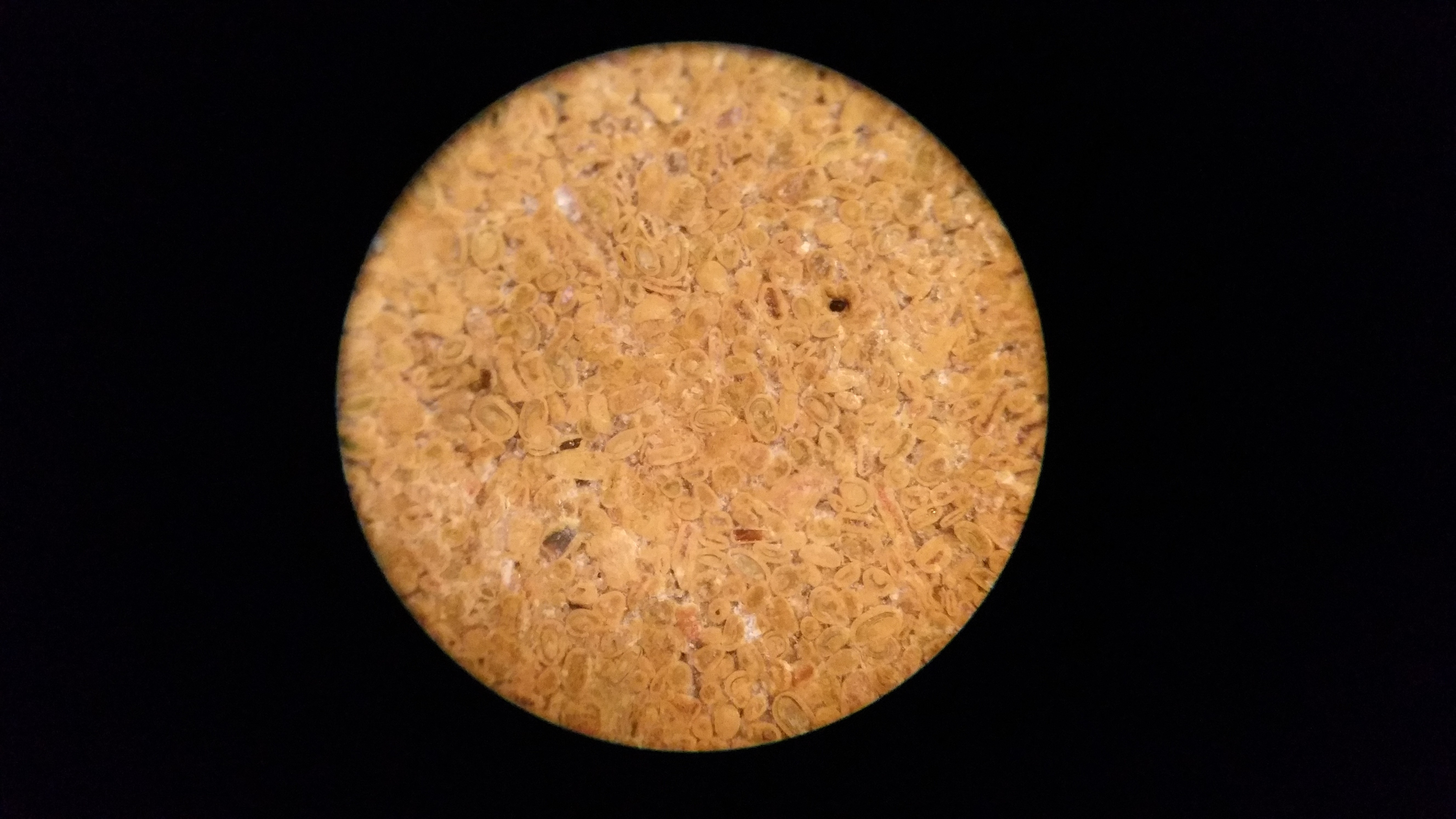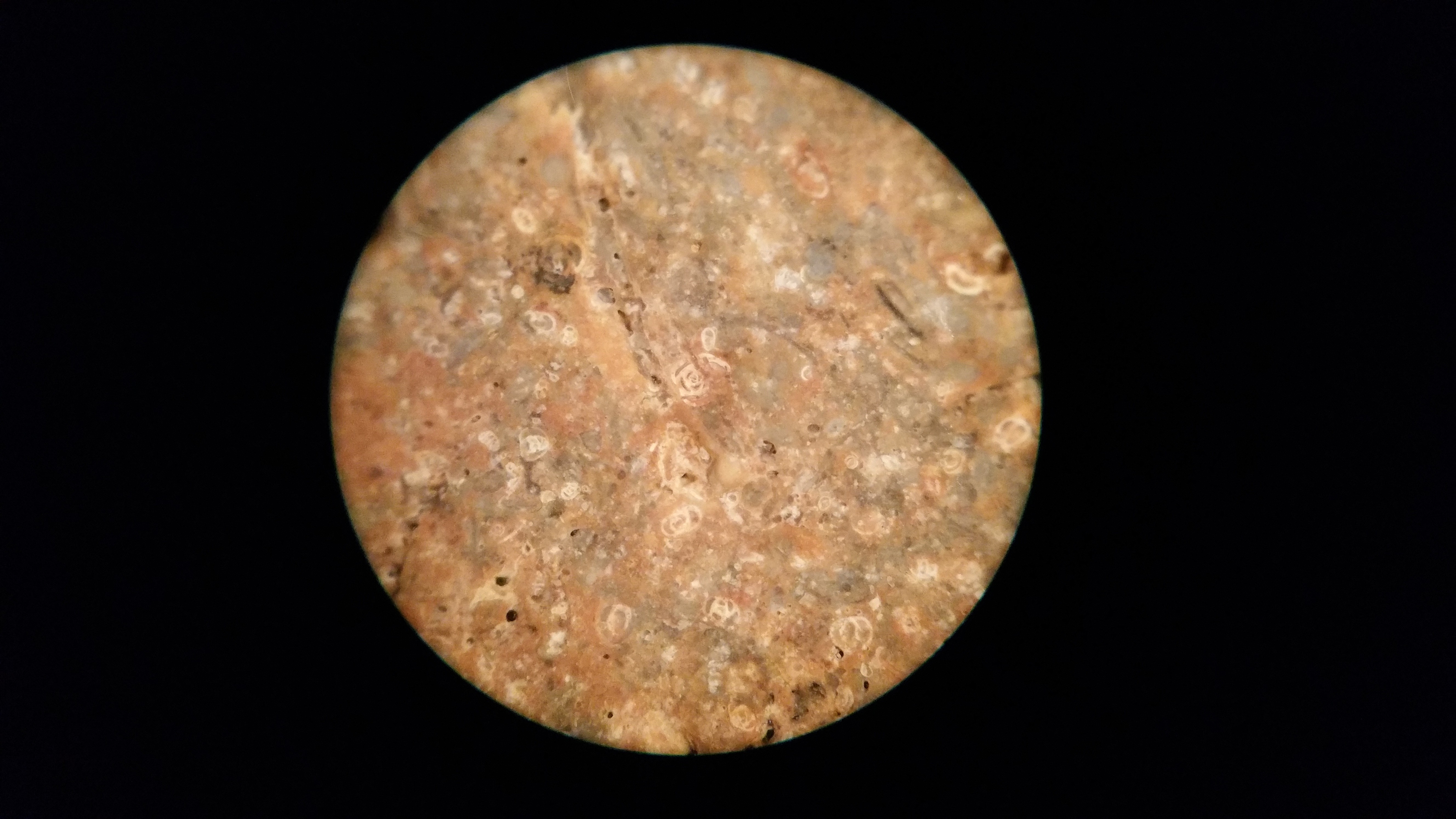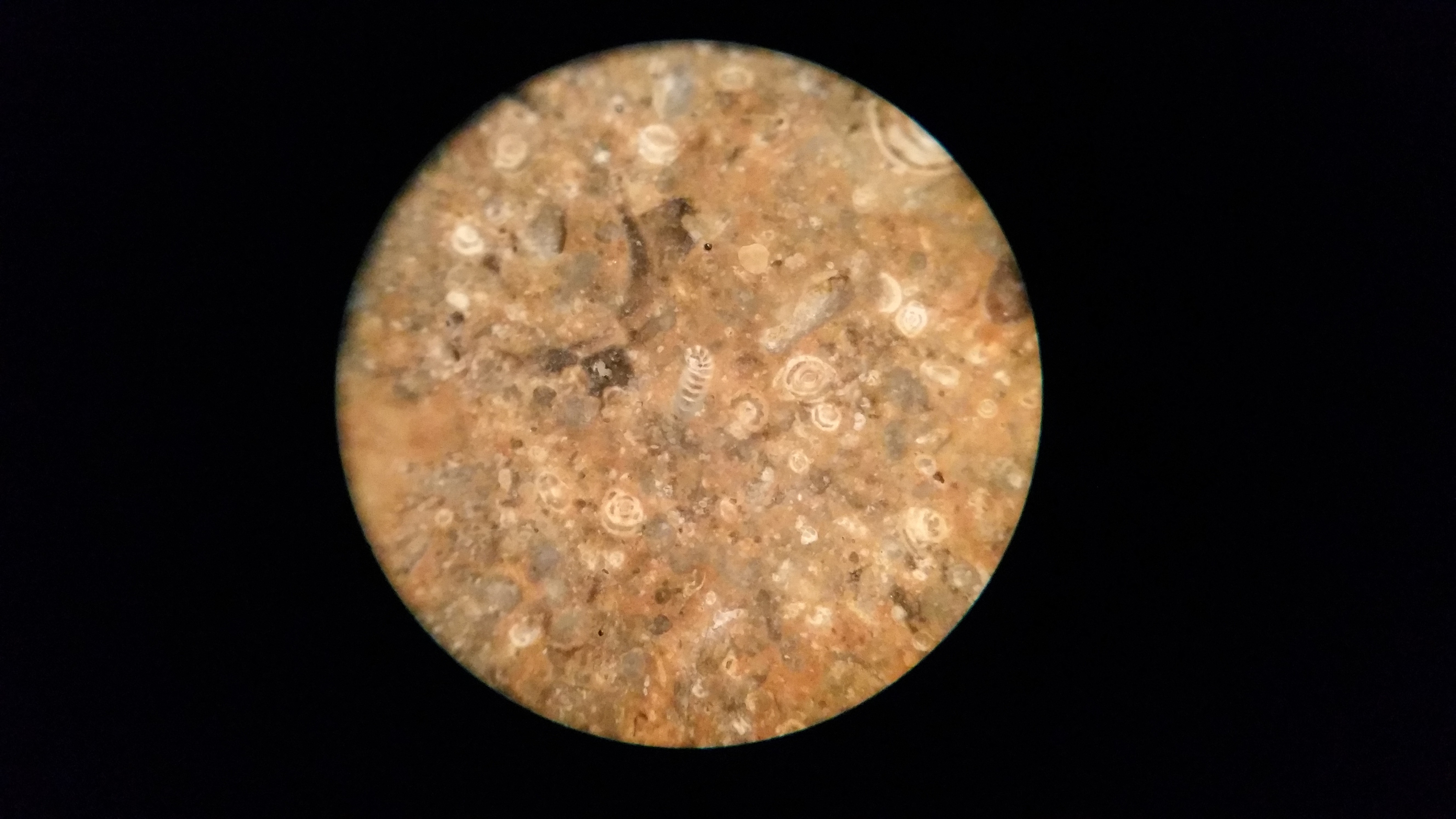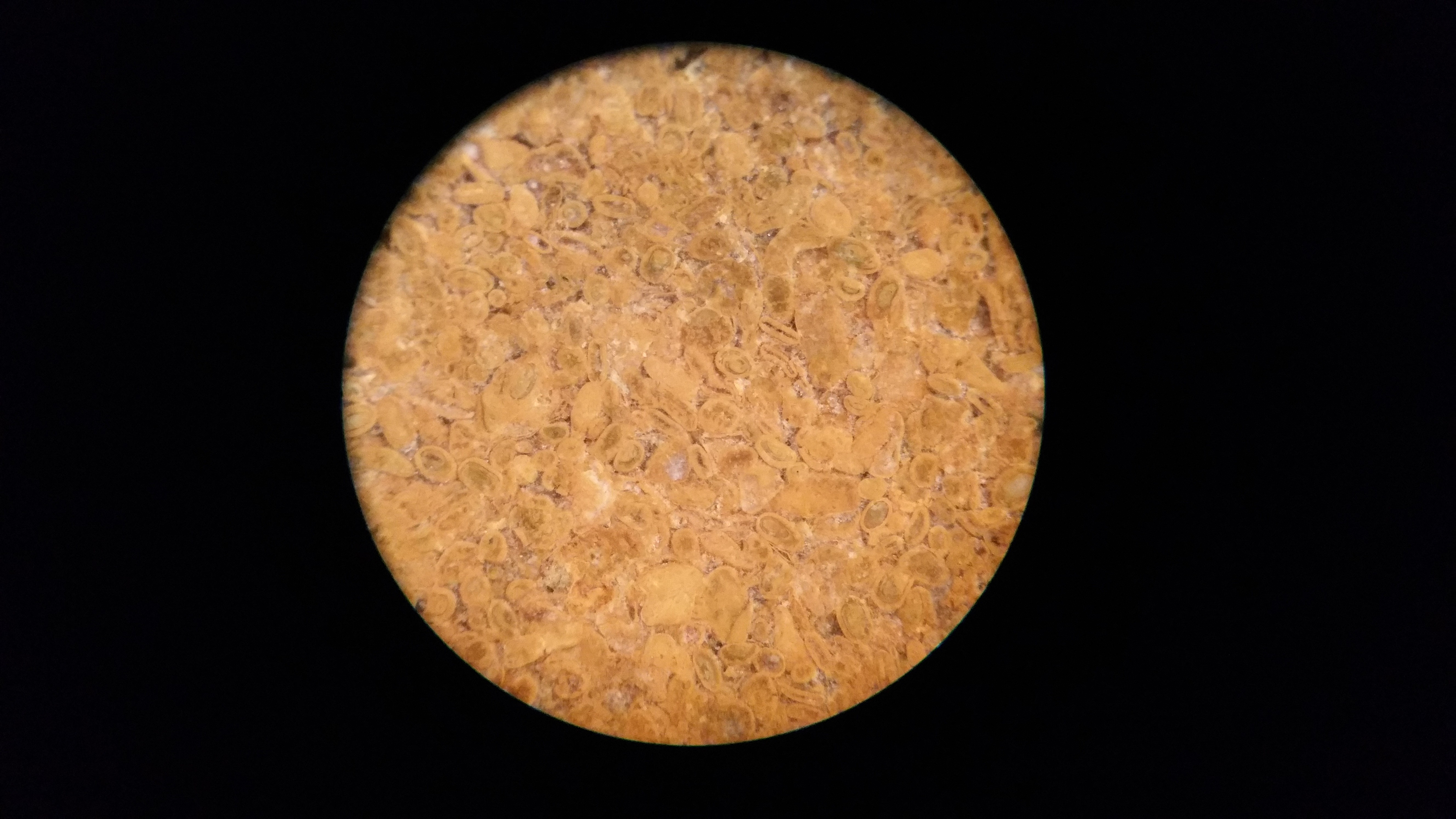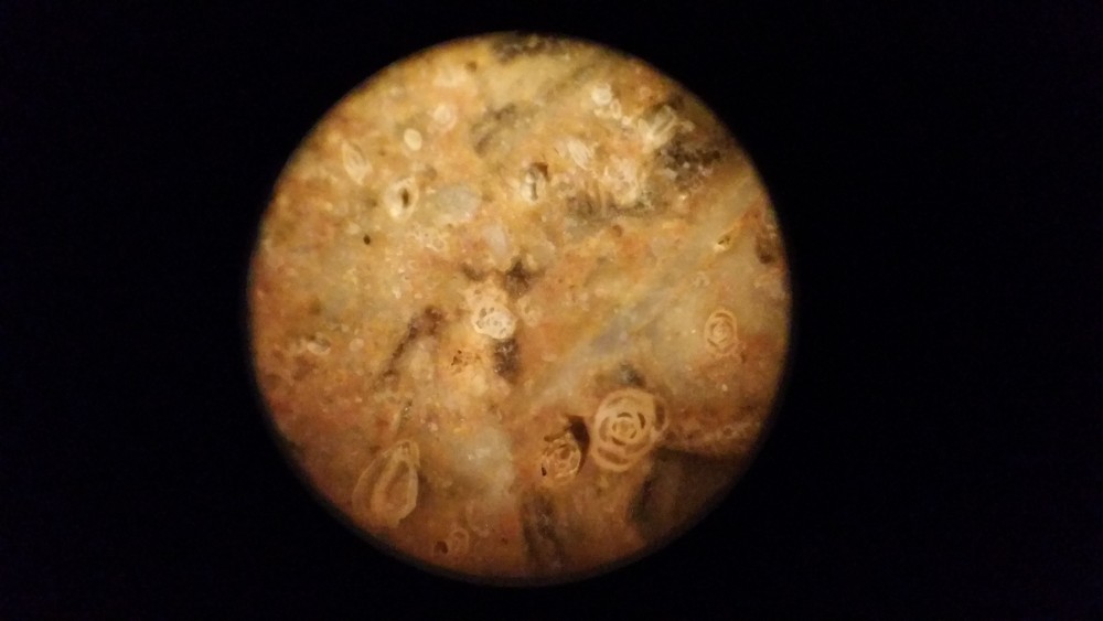 celui-ci est encore un assez rare spécimen comportant alvéolines , nummulites et bien d'autres dont je ne connais pas encore le nom ni le lieu d'origine , d'ailleurs .