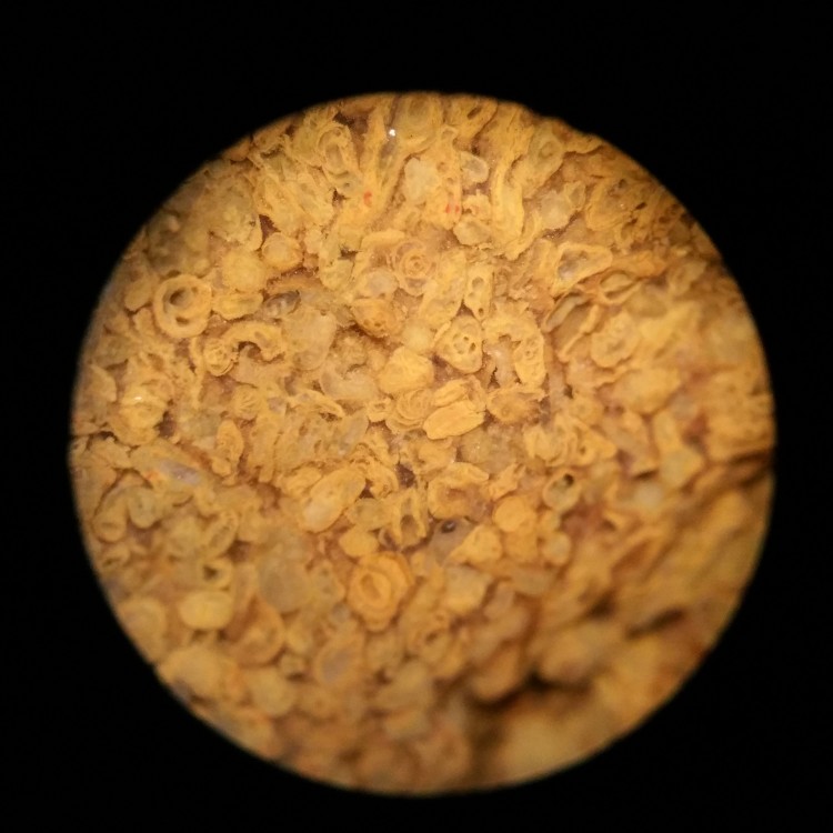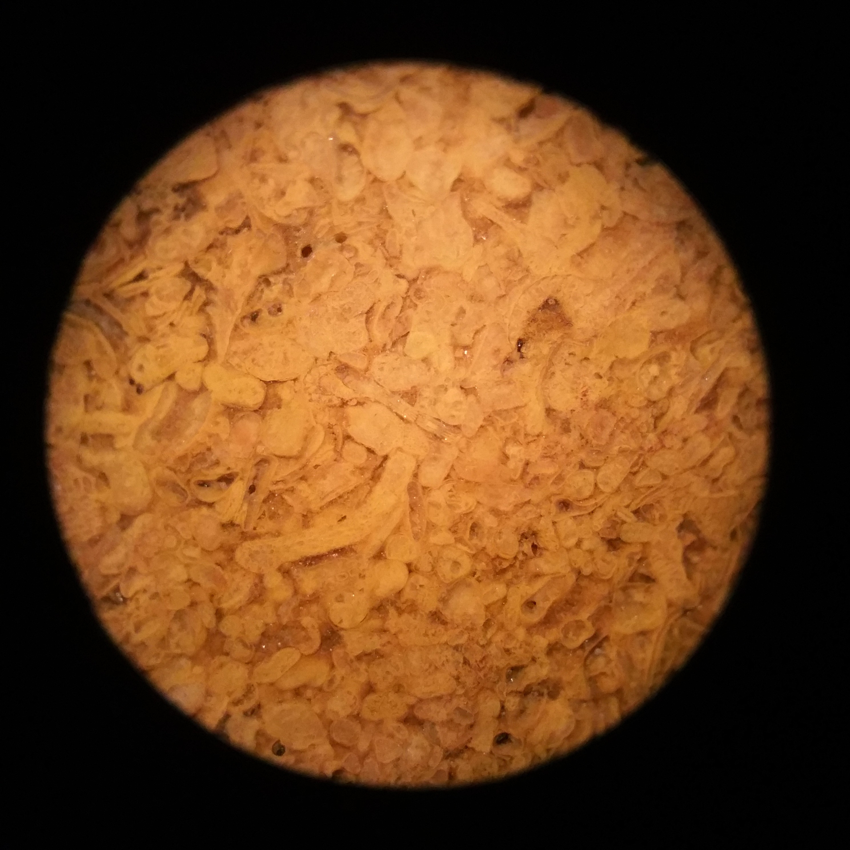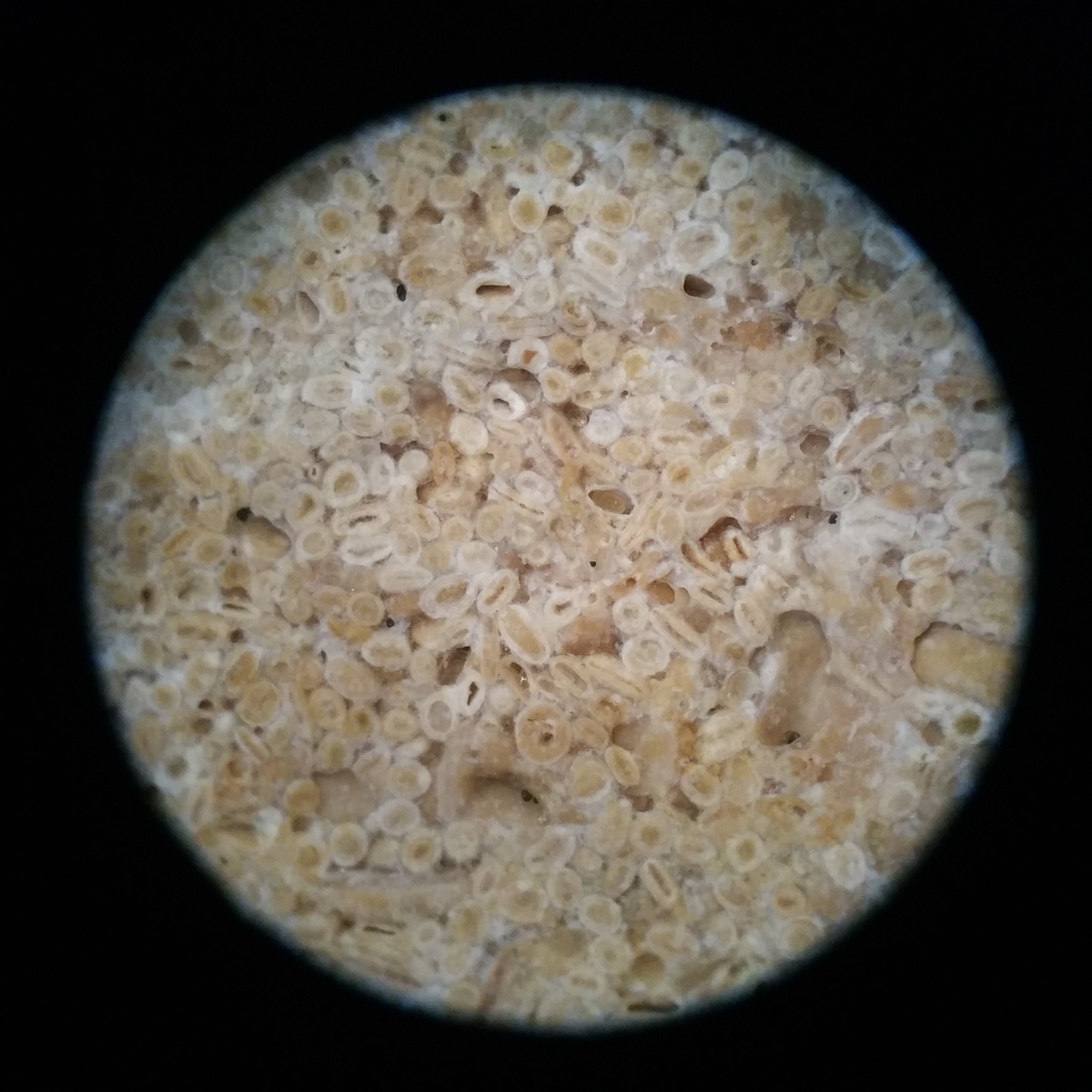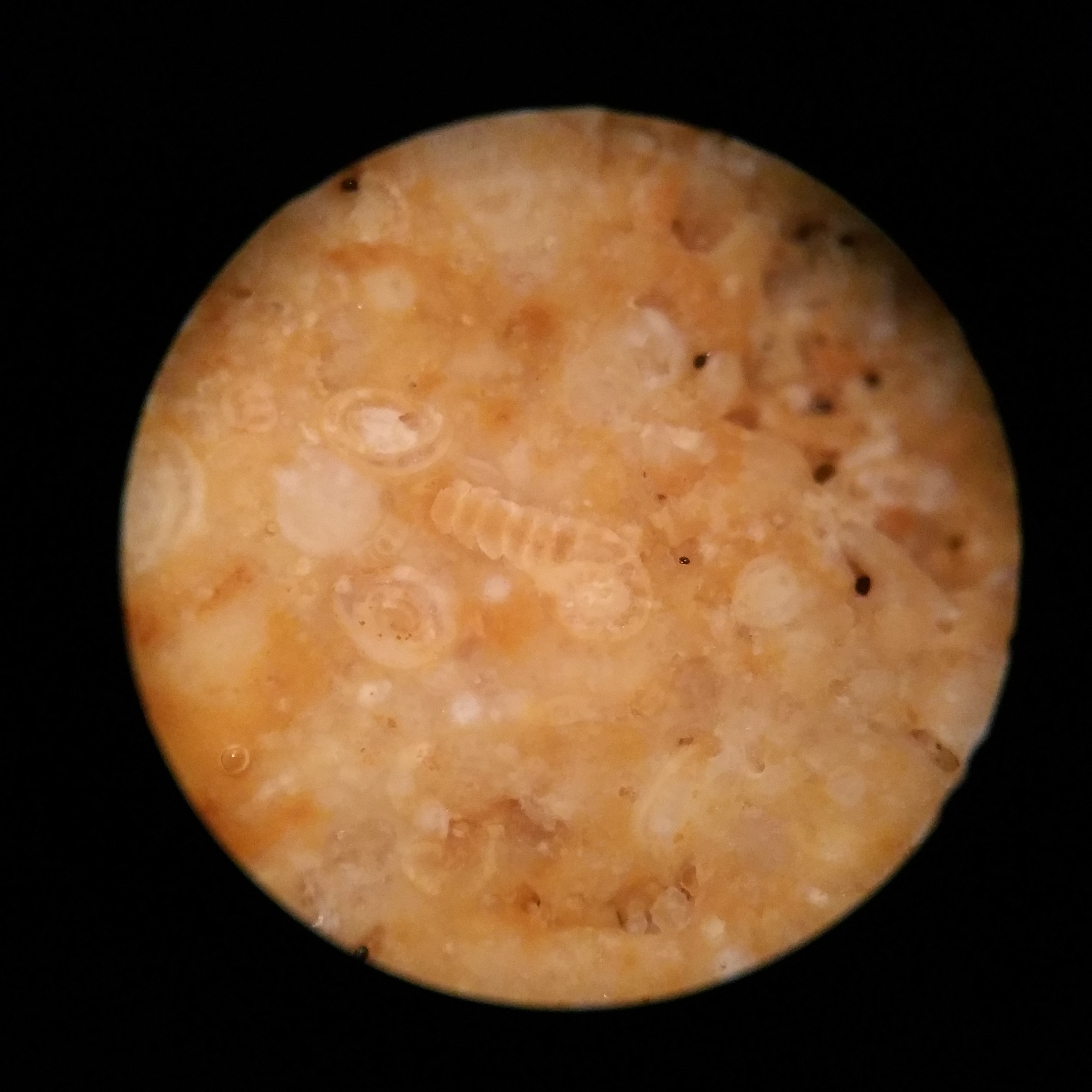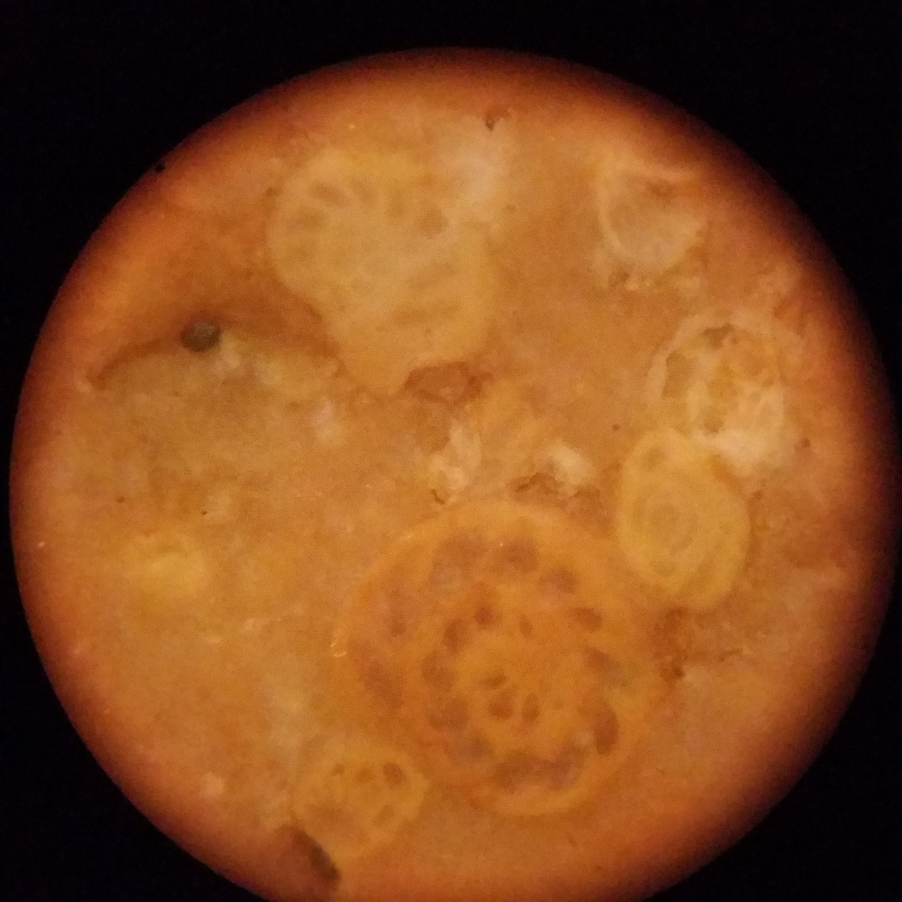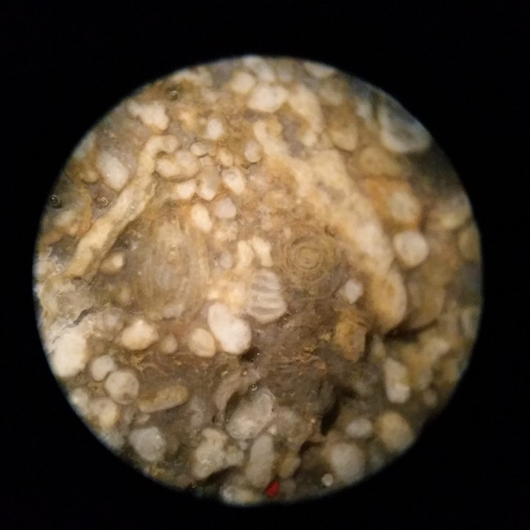 Sinon, sur la photo ci-dessous, parmi toutes les milioles on voit 2 foraminifères qui présentent d'abord un enroulement puis se poursuivent en 1 série linéaire de loges. Ce sont certainement des Spirolines.