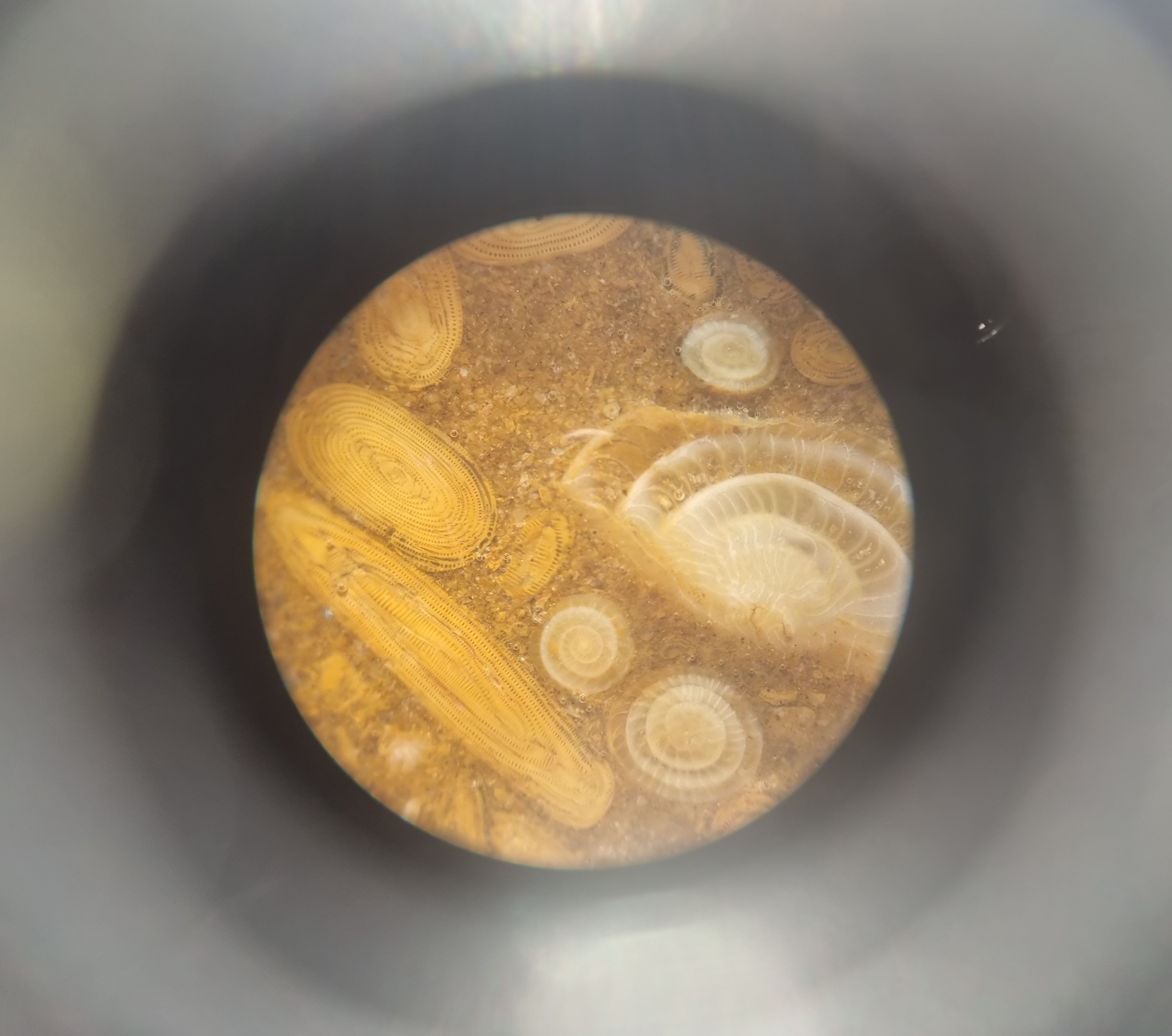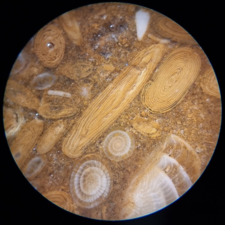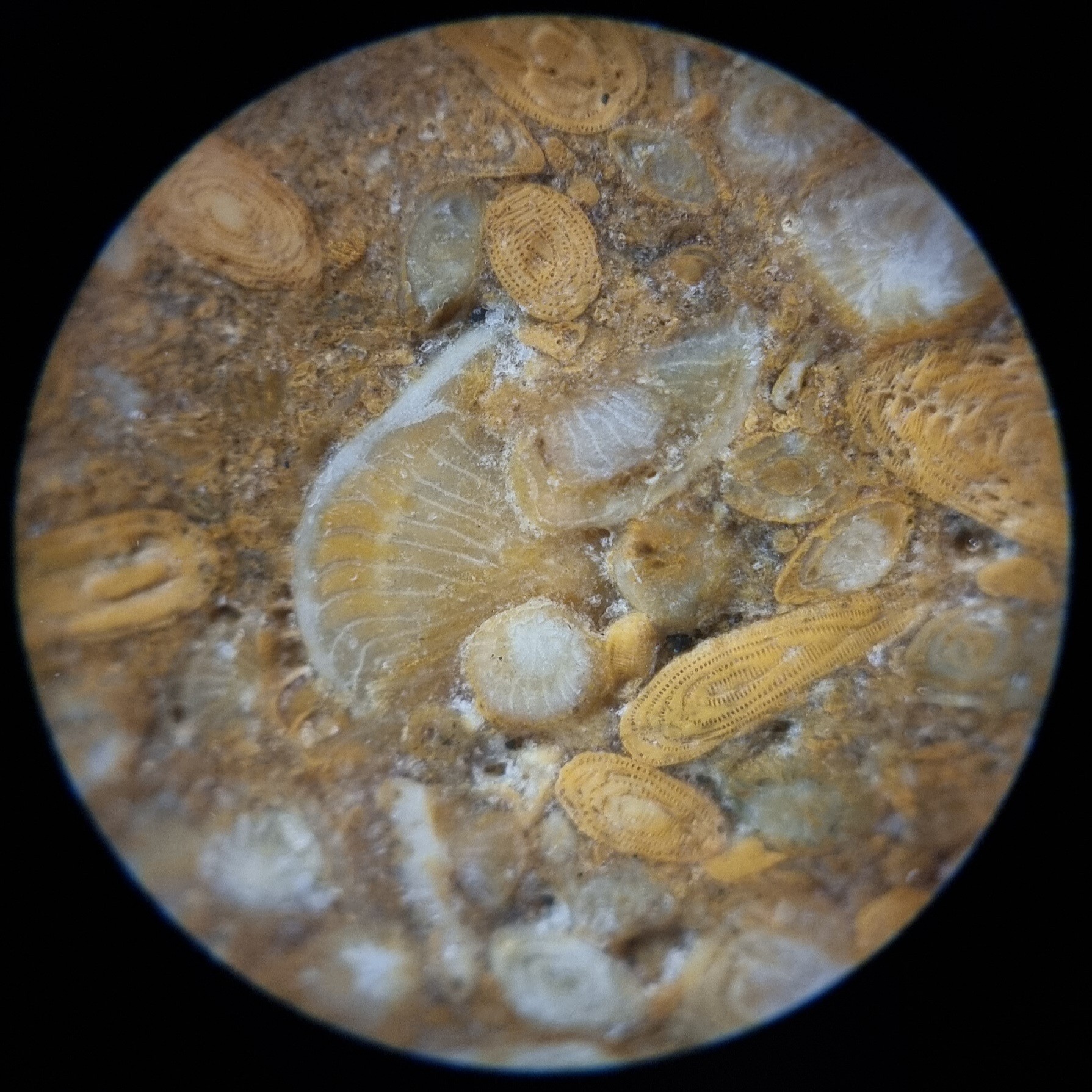 Et pour cet échantillon, je crois aussi me souvenir que mon professeur de micropaléontologie m'avait indiqué la présence de deux types d'alvéolines...