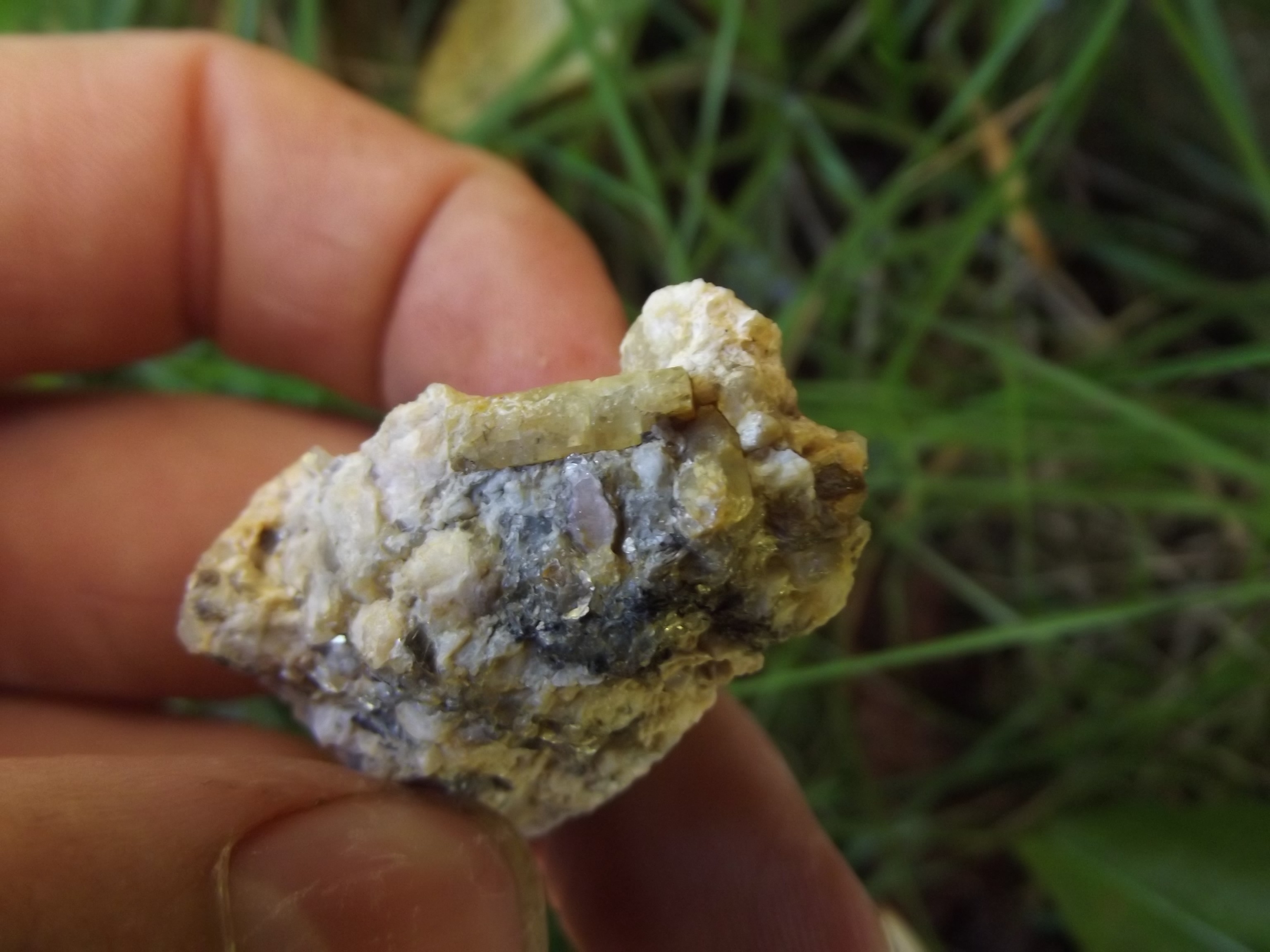Un béryl du même endroit trouvé aussi hier (intéressant car la cassure qui enlève la terminaison date de la formation de la pegmatite car englobée dans le quartz) :