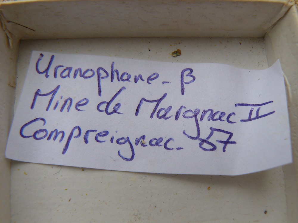 Pour rester dans la Division Minière de La Crouzille : Uranophane-Bêta (4,5 x 2,5 cm) de Margnac II, 87.