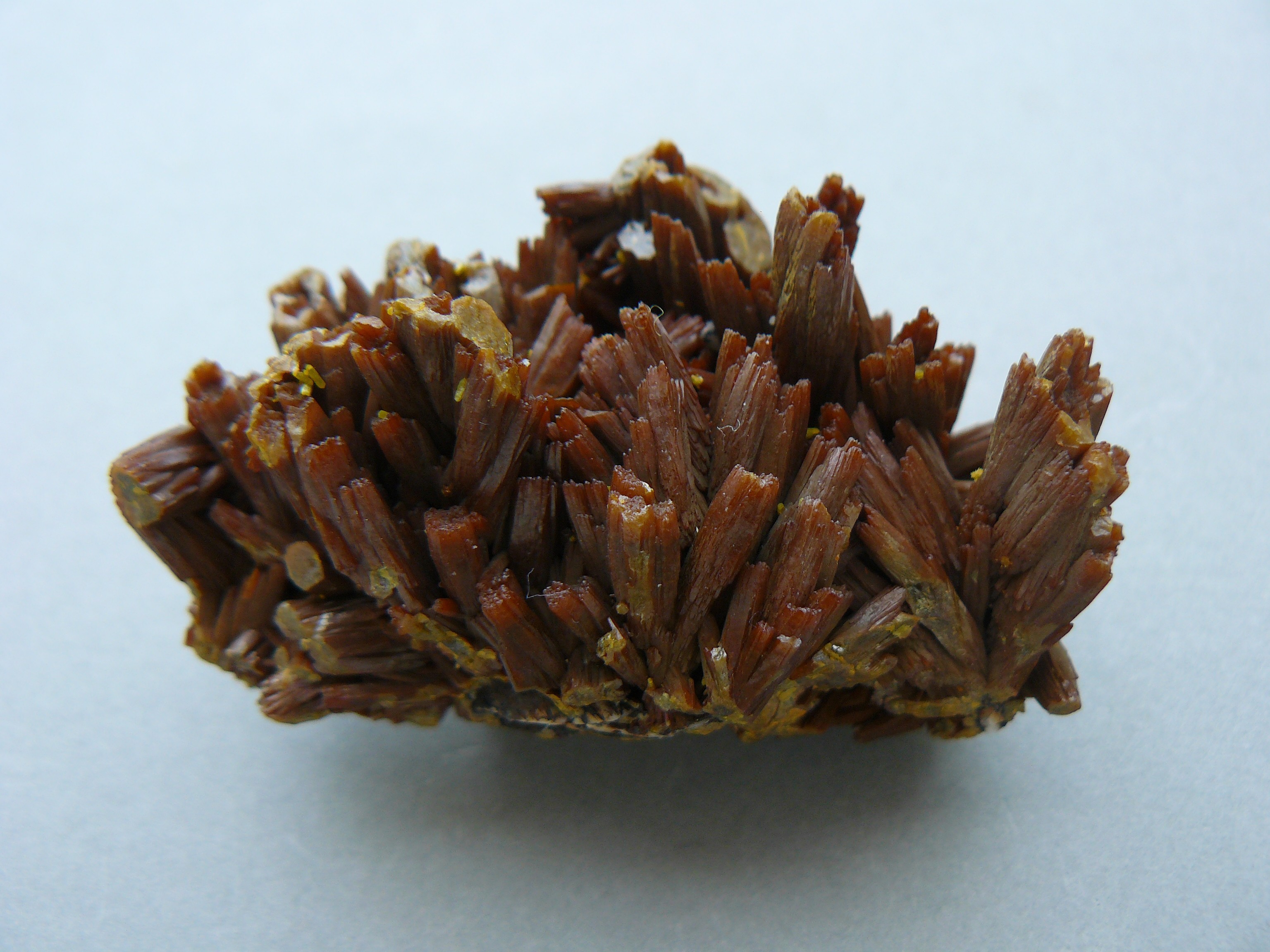 Pour continuer, une Pyromorphite "moutarde" (6 x 3,5 cm) avec quelques sommets recristallisés (ex. C. Lolon) ; mine des Farges, Ussel, Corrèze. Elle "crache" assez bien au compteur-Geiger : 1,20 uSv/h maxi, la "normale" chez moi étant de 0,18 uSv/h.