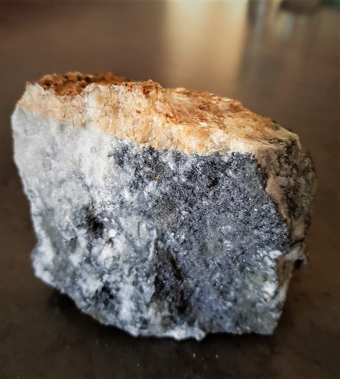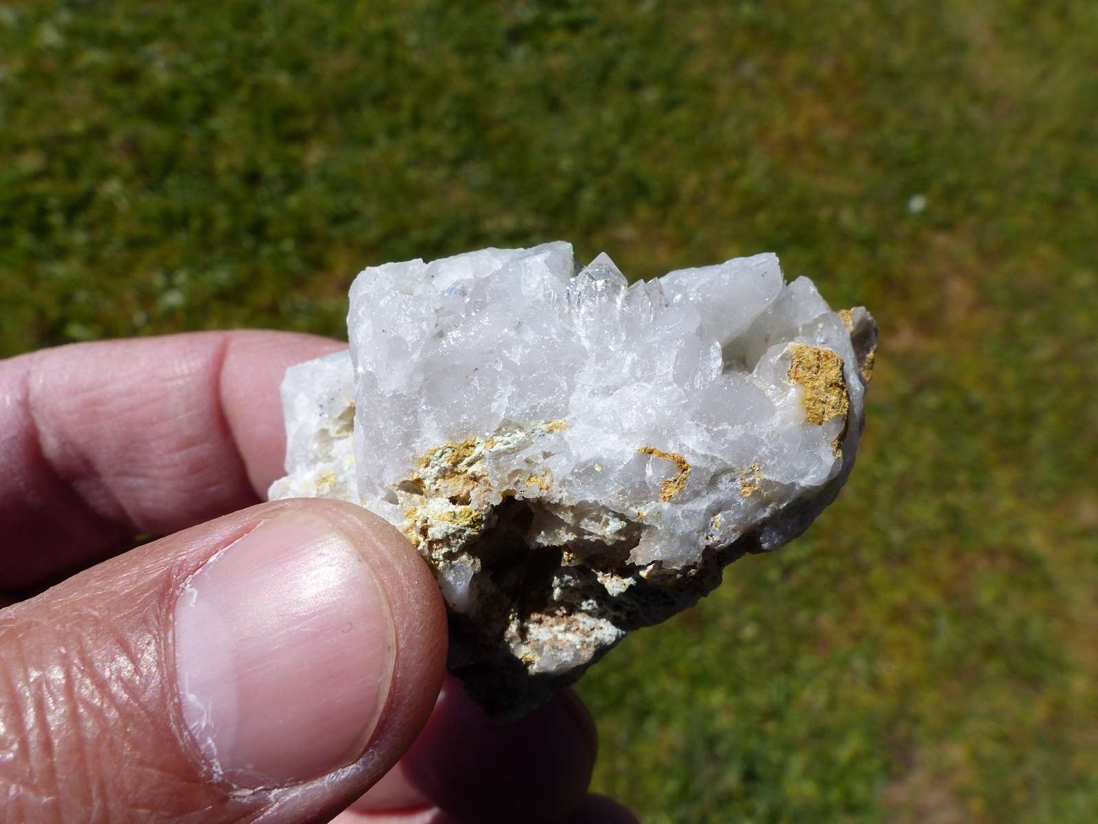 J'ai quand même réussi à faire une trouvaille dans mon jardin en recassant un gros bloc de Bourneix. Pas d'or, mais un petit filon d'arsénopyrite de la mine des Renardières.
