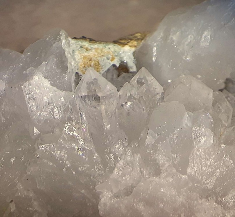 Une petite pièce avec des cristaux de Quartz et de la Scorodite, mais une forme en boule a attiré mon attention... J'ai pensé au départ à de la Calcédoine, mais la Scorodite peut aussi parfois se présenter sous cette forme. D'après ce que j'ai lu, elle se distingue de la Calcédoine par la présence de petits pointements cristallins... Donc Scorodite aussi,