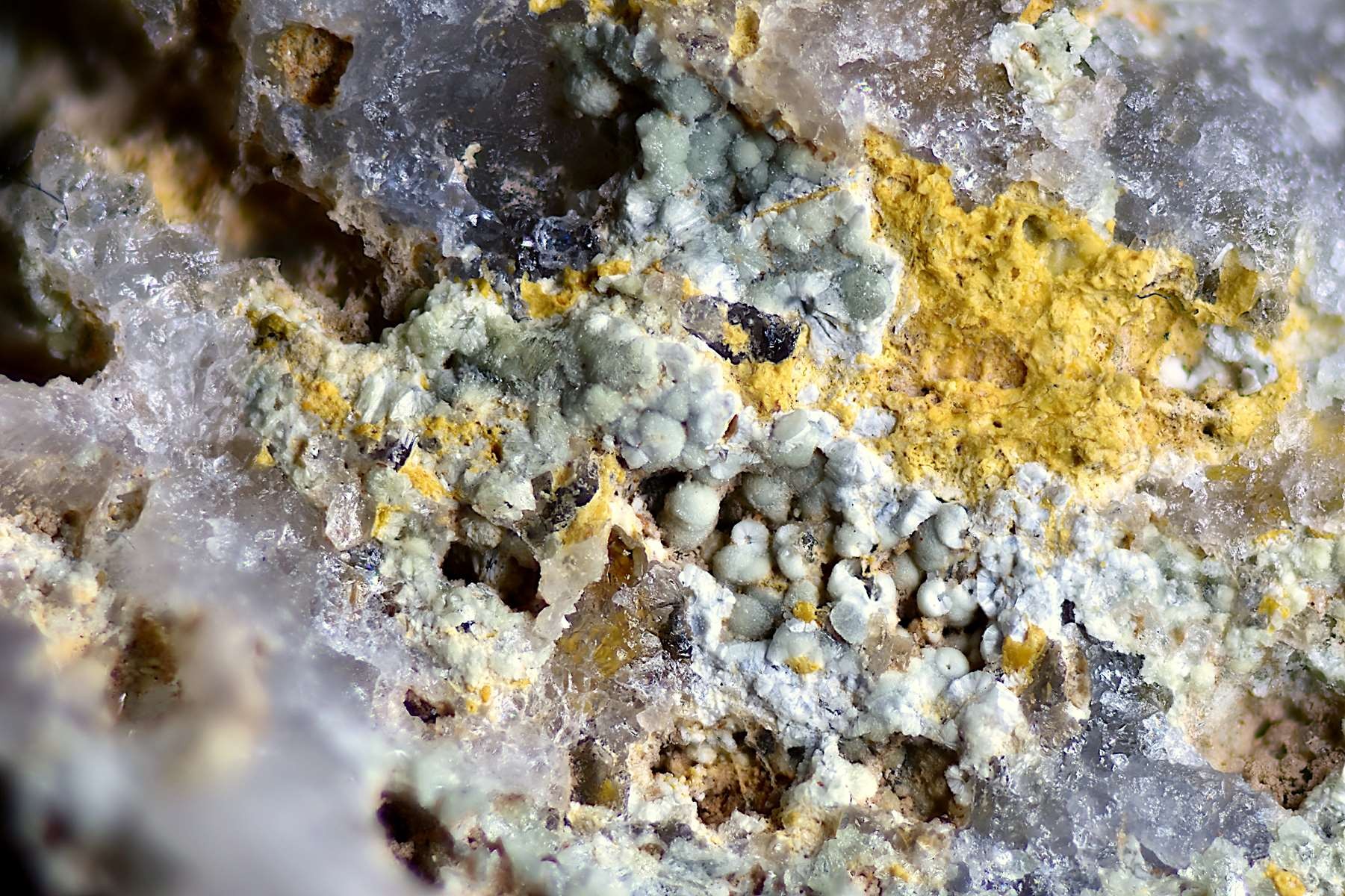 Pour Mica, je ne vois que des sphérules de scorodite, un peu comme celle de la Vilatte, par contre le minéral jaune ressemble au mien mais a l'air mieux exprimé (on dirait qu'il y a des cristaux brillants assez frais en micro).Sinon je ne vois pas la boule dont tu parle?