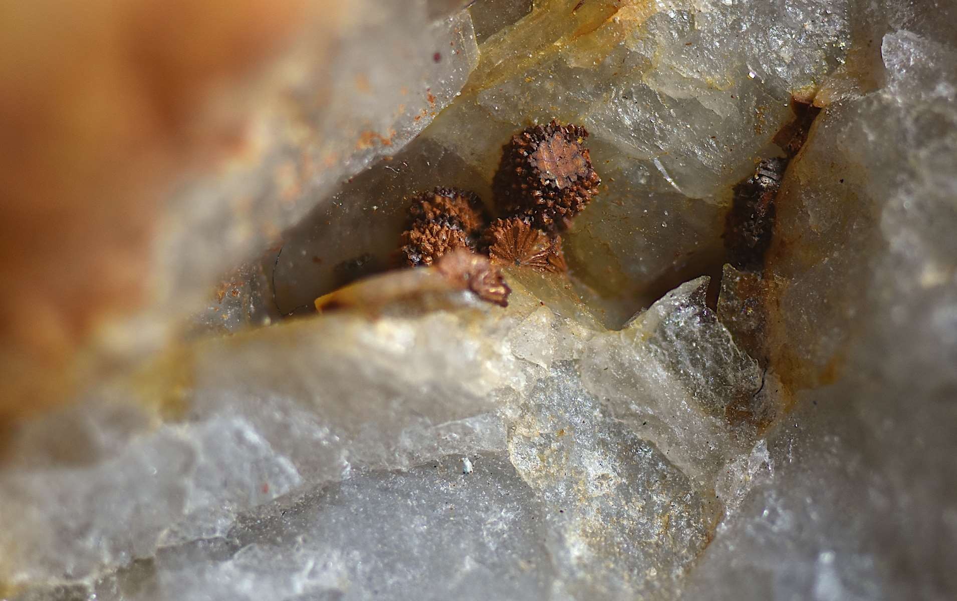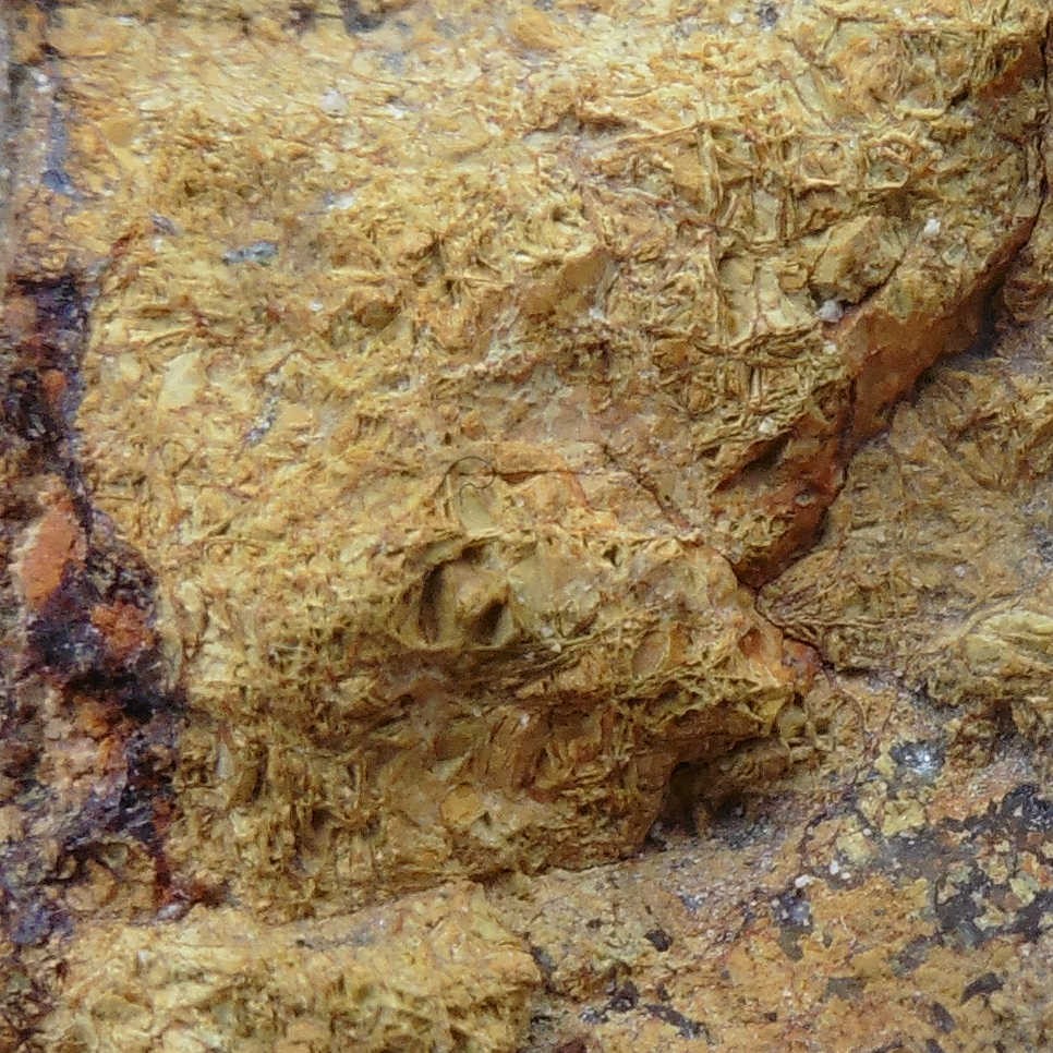 Je voulais mettre des photos micros mais je ne retrouve pas le caillou. Voila des photos agrandies , ça fait une croûte épaisse (5-6mm) et assez dure, et il y a des parties orangées...