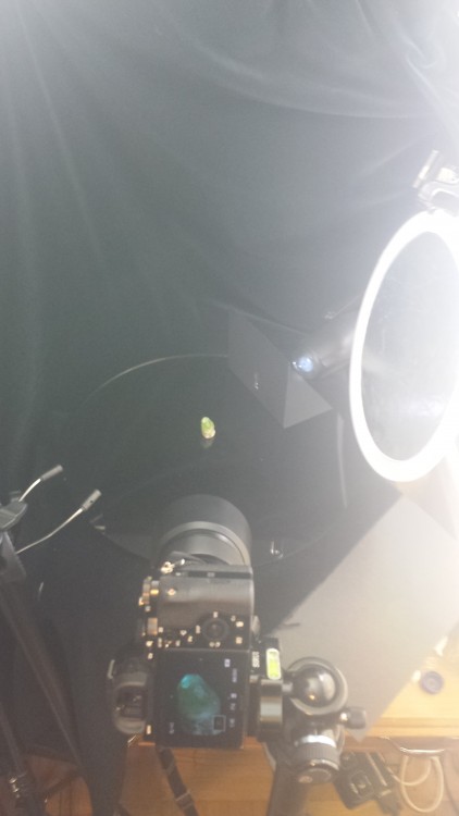 Moi c'est basique: la pierre est posée sur son socle sur une chaise, appareil et trépier, pas d'éclairage artificiel, juste le flash.Du coup je prends mes photos que l'après-midi.