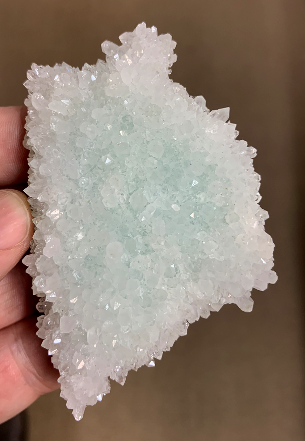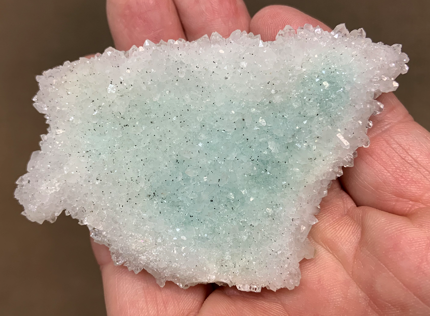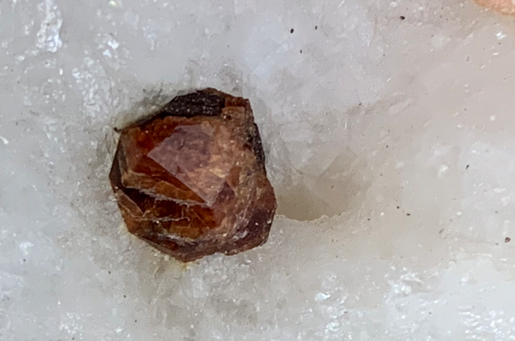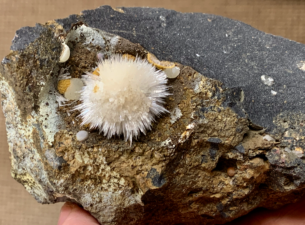Natrolite tapissant une vacuole du basalte qui a secondairement été partiellement encroûtée d'un minéral brunâtre, puis remplie d'Aragonite ; puis libérée de sa gangue [ø35mm]