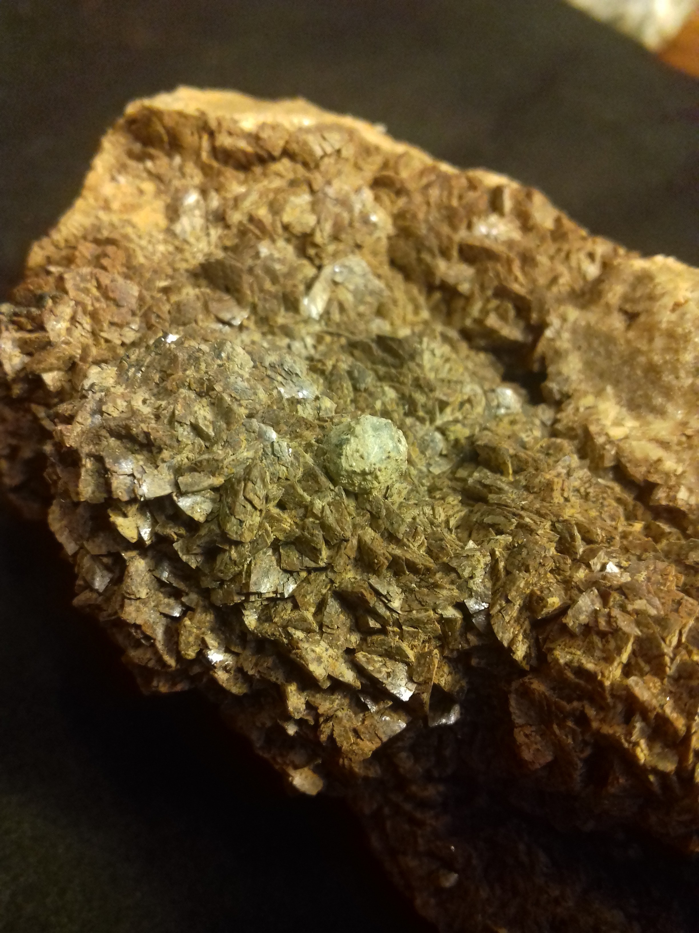 - Dodécaèdre de Galène ( Pyrite?) sur Ankérite . Diamètre de la Galène 5mm. Le dodécaèdre est couvert de pustules, le tout est recouvert d'un voile cristallisé. Carrière de Loiras.