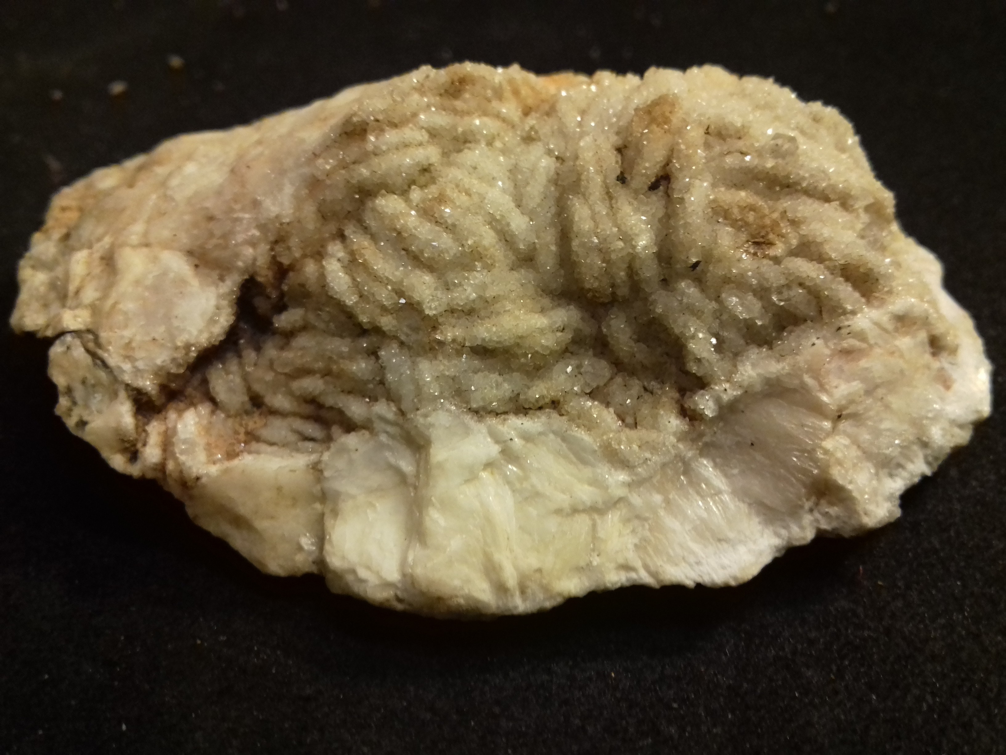-la première est une boule de terre au départ je l'ai récupéré parce que j'ai vu une pointe de quartz dépasser je ne savais pas ce que j"allais trouver  , rentré à la maison lavage au jet , j'ai fini a la brosse à dent et au cure dent ,c'est là que j'ai besoin d'un coup de main j’ai jamais trouvé une construction équivalente  , c'est du quartz formé , avec des plaques de quartz (comme des druses )sur d'autres plaques de quartz , enchevêtrés sur d"autres plaques de quartz ,bref que du quartz dimension 11,5 cm x 10 cm environ l’intérieur est creux sur une mince pellicule de quoi je sais pas l'ensemble est extrêmement fragile j'ai arrêté là le nettoyage ,pour pas désintégrer l'ensemble la 1 et 2 em vue sont prises sous des angles differents la 3 em c'est la partie exterieure on dirait de la limonite