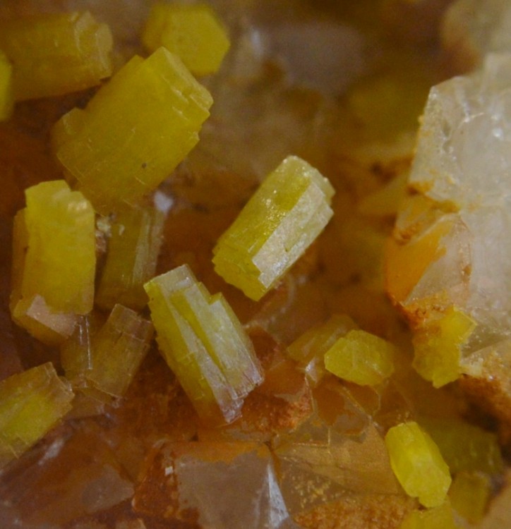 Cristaux de pyromorphite sur cristaux de barytine, filon du Rossignol, mine de Chaillac, Indre, France.