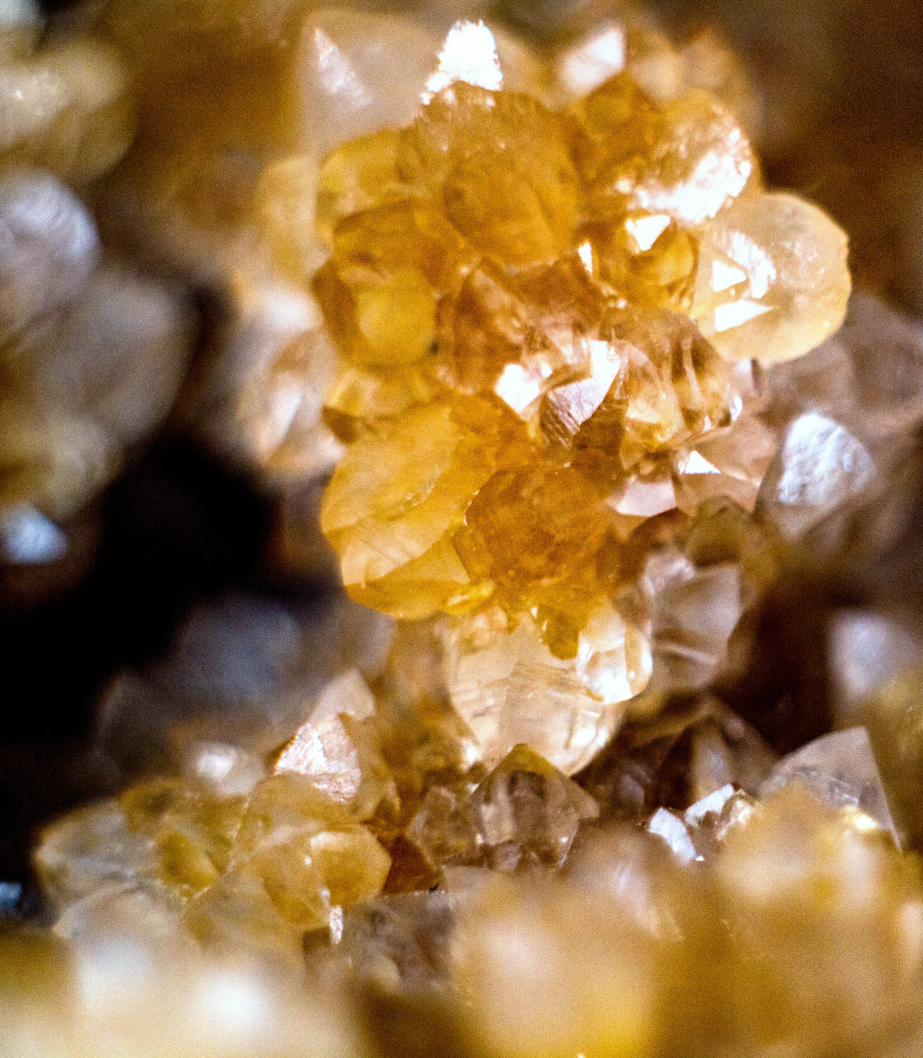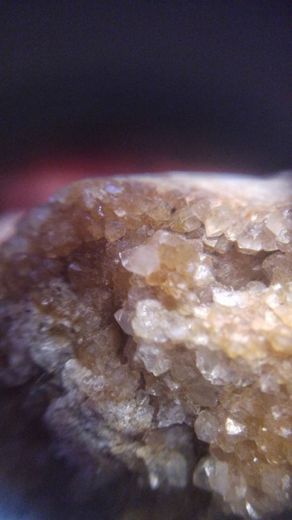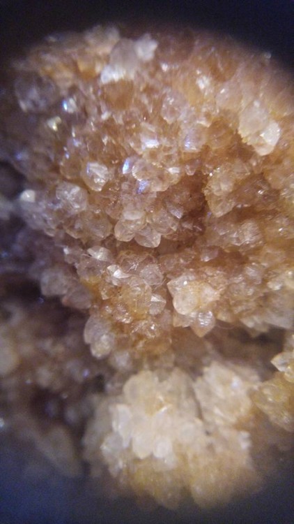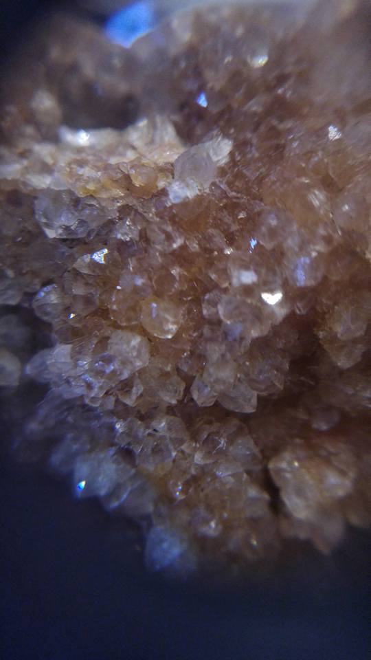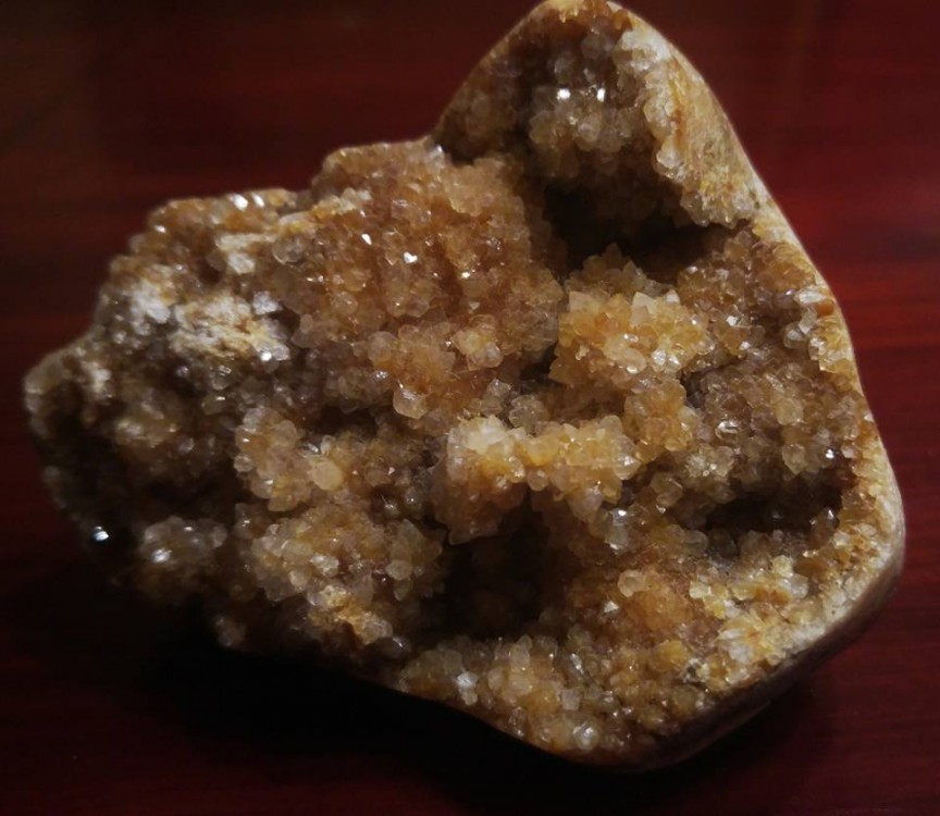Cette géode est rempli de tout petits cristaux minuscules jaunâtres qui brillent de mille feux à la moindre lumière dessus, elle est vraiment splendide. C'est très fragile et les cristaux se cassent facilement ( hélas l'amas blanchâtre en haut à gauche que l'on voit sur la troisième photo est du à un choc). Je ne pense pas à une citrine car les cristaux me semblent différents, minuscules, très serrés les uns aux autres et hyper fragiles. Existe t-il d'autres géodes à cristaux jaunâtres très brillants à la moindre lumière? En cherchant sur le net je n'ai pu trouver que l'Aragonite mais les cristaux me semblent de forme différente.