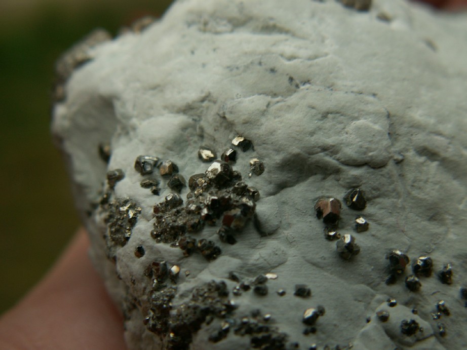 C'est en effet ce genre d'échantillon, sans cristaux bien marqués, dont j'ai souvenir. Ceci dans un long banc d'épaisseur décimétrique qui montait de la rive du lac à l'ouest, sur plusieurs dizaines de mètres...
