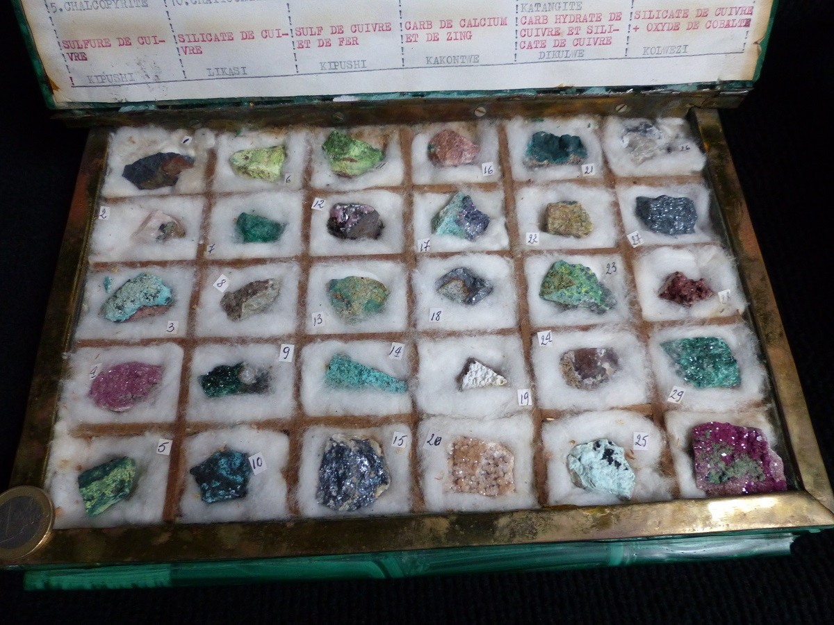 un objet qui a sa place ici un coffret en forme de livre en malachite contenant des petits minéraux des mines de la RDC. Ces coffrets étaient offerts aux mineurs.