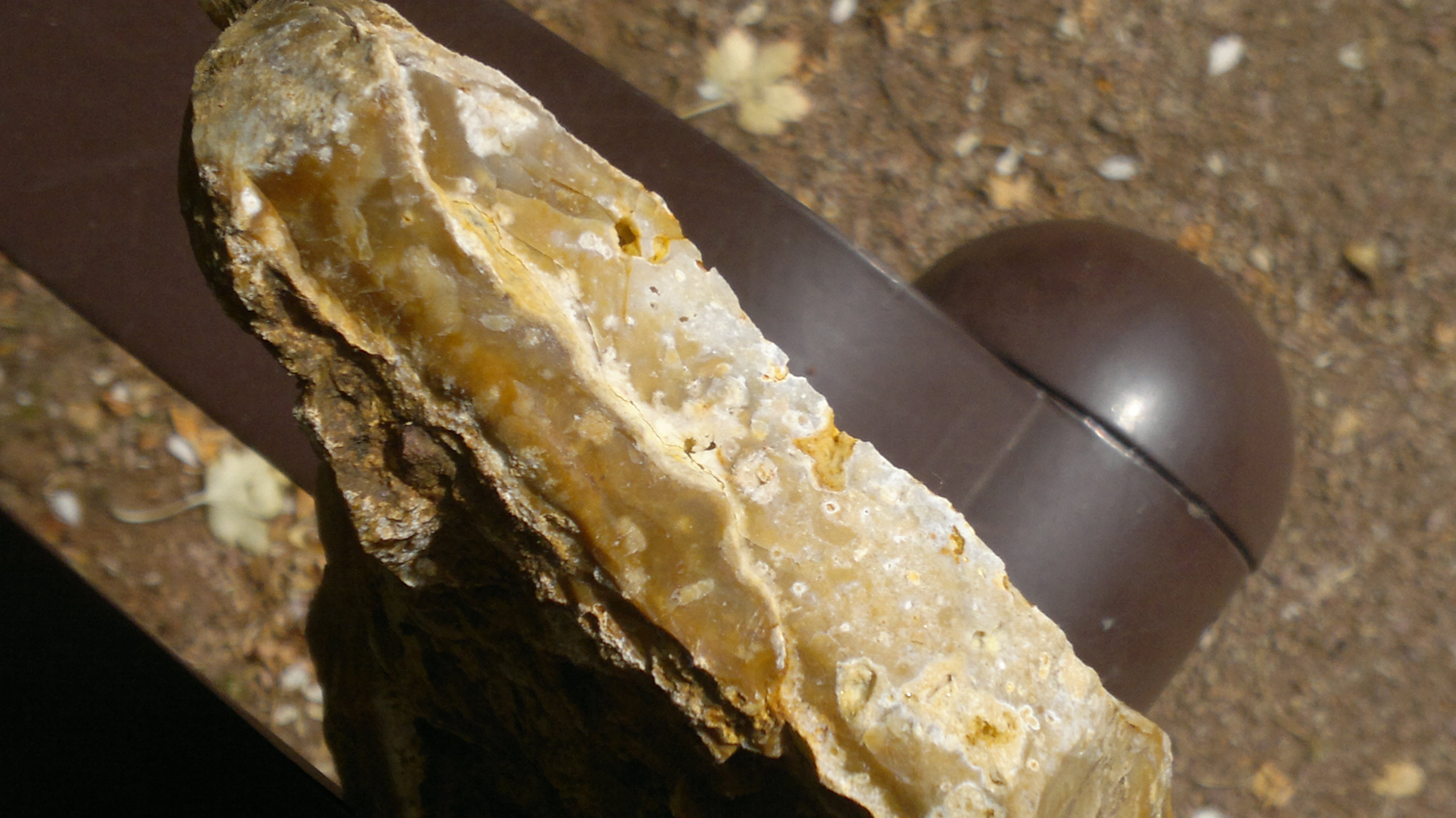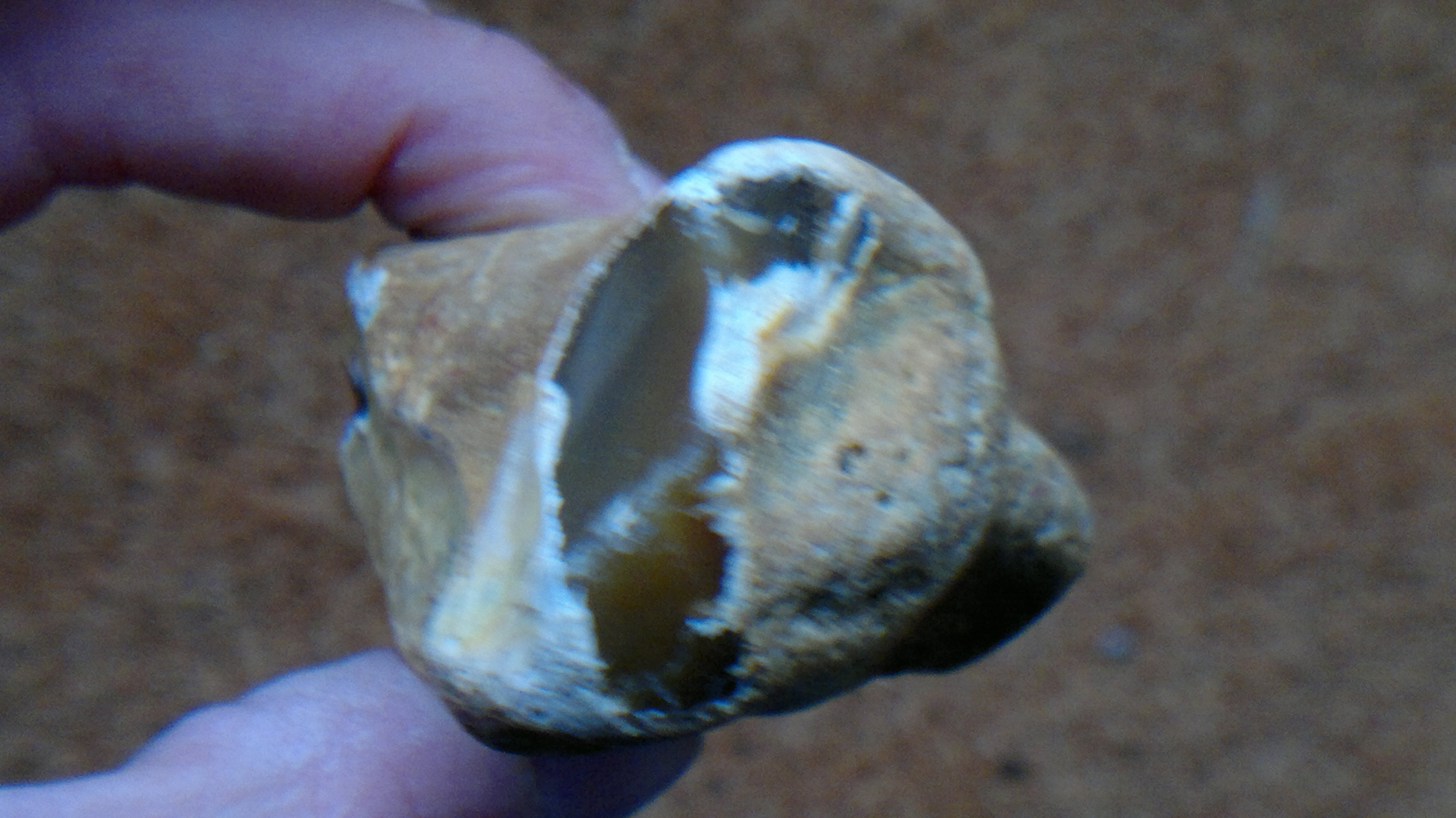 Il est entouré d'une fine couche blanche (un mélange entre la silice et le calcaire). Tu ne vois pas de grain, il a une cassure conchoïdale comme du verre. Il raye le verre. Celui que tu as à une couleur brune, il y en a avec d'autres couleurs. Il ne réagit pas à l'acide chlorhydrique.