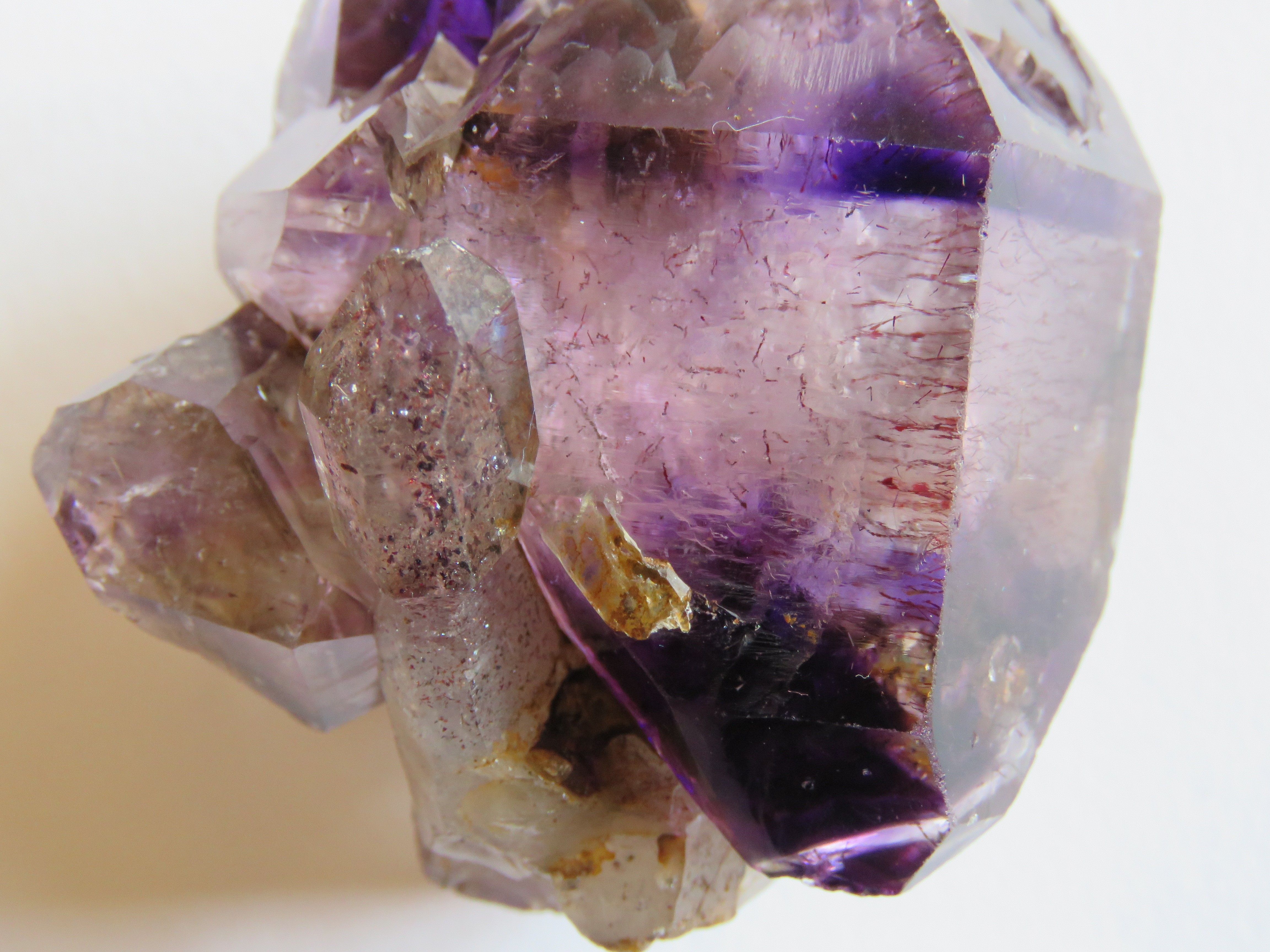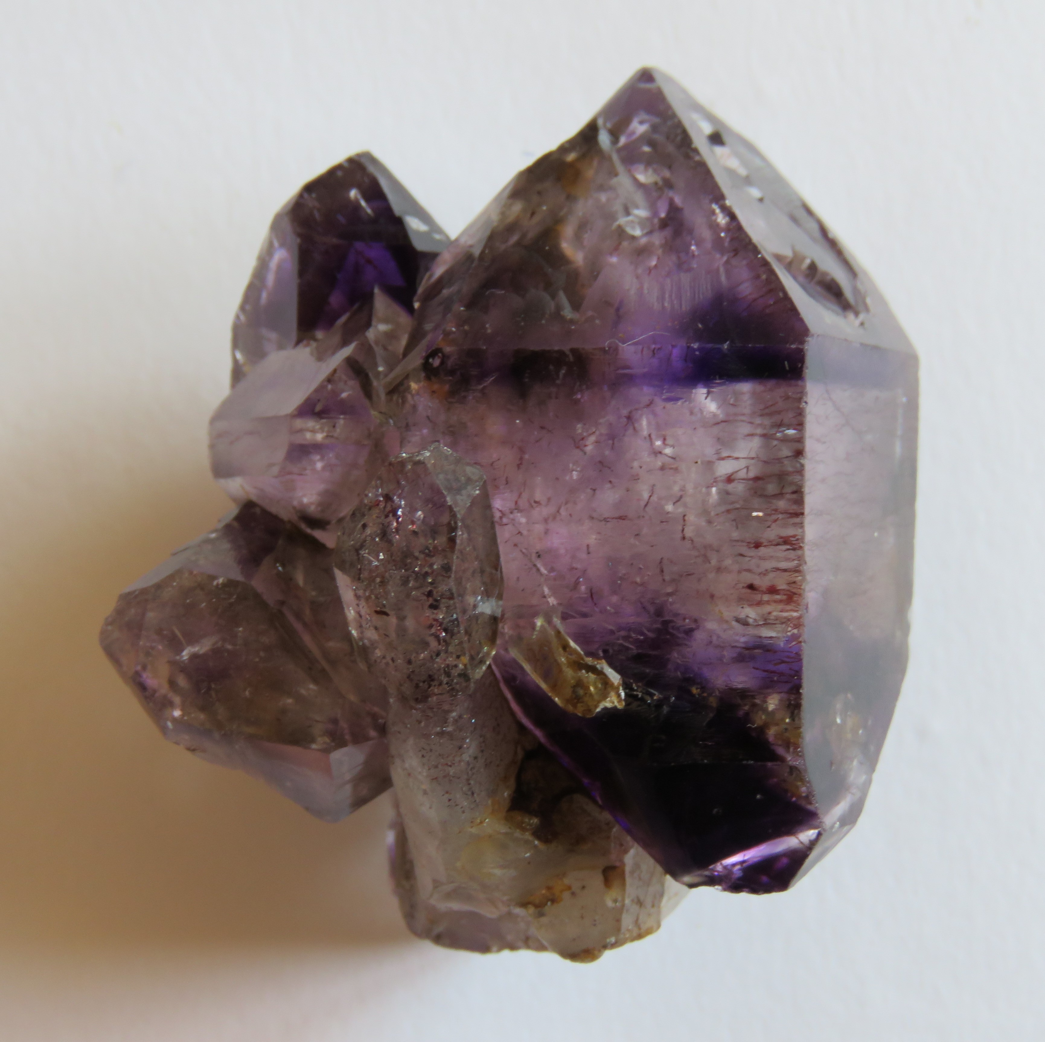 Quartz sceptre multiple, fenestré, zoné améthyste-fumé (65 X 45 X 47mm) à inclusions d'hématite filiforme (?) perpendiculaires aux faces des cristaux. Les figures à la surface du prisme du cristal principal sont intrigantes ! S'agit-t-il de figures de dissolution ou au contraire de croissance ?