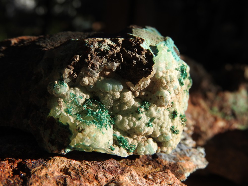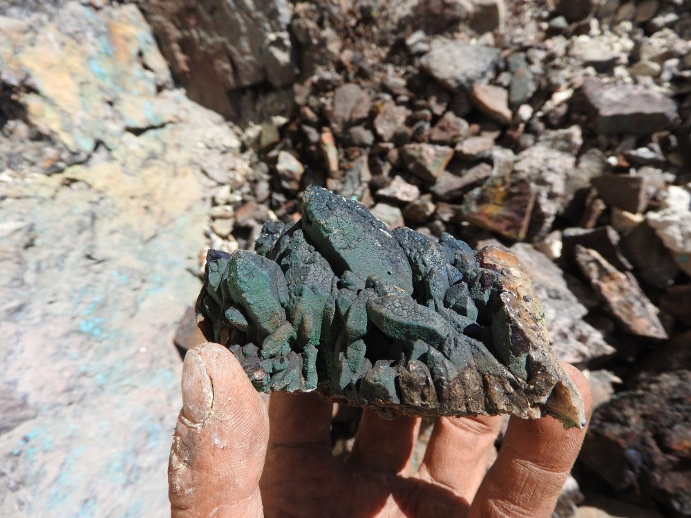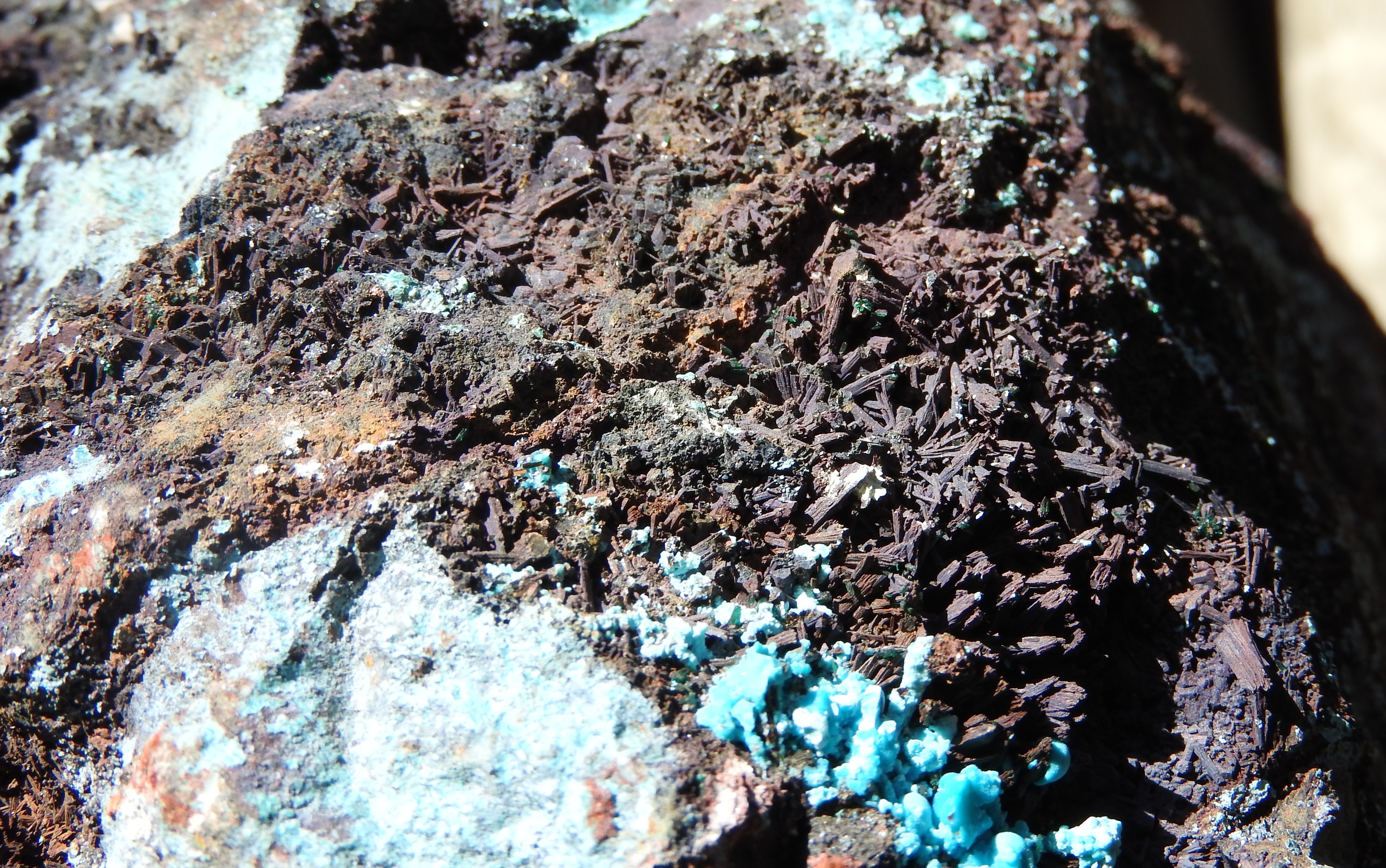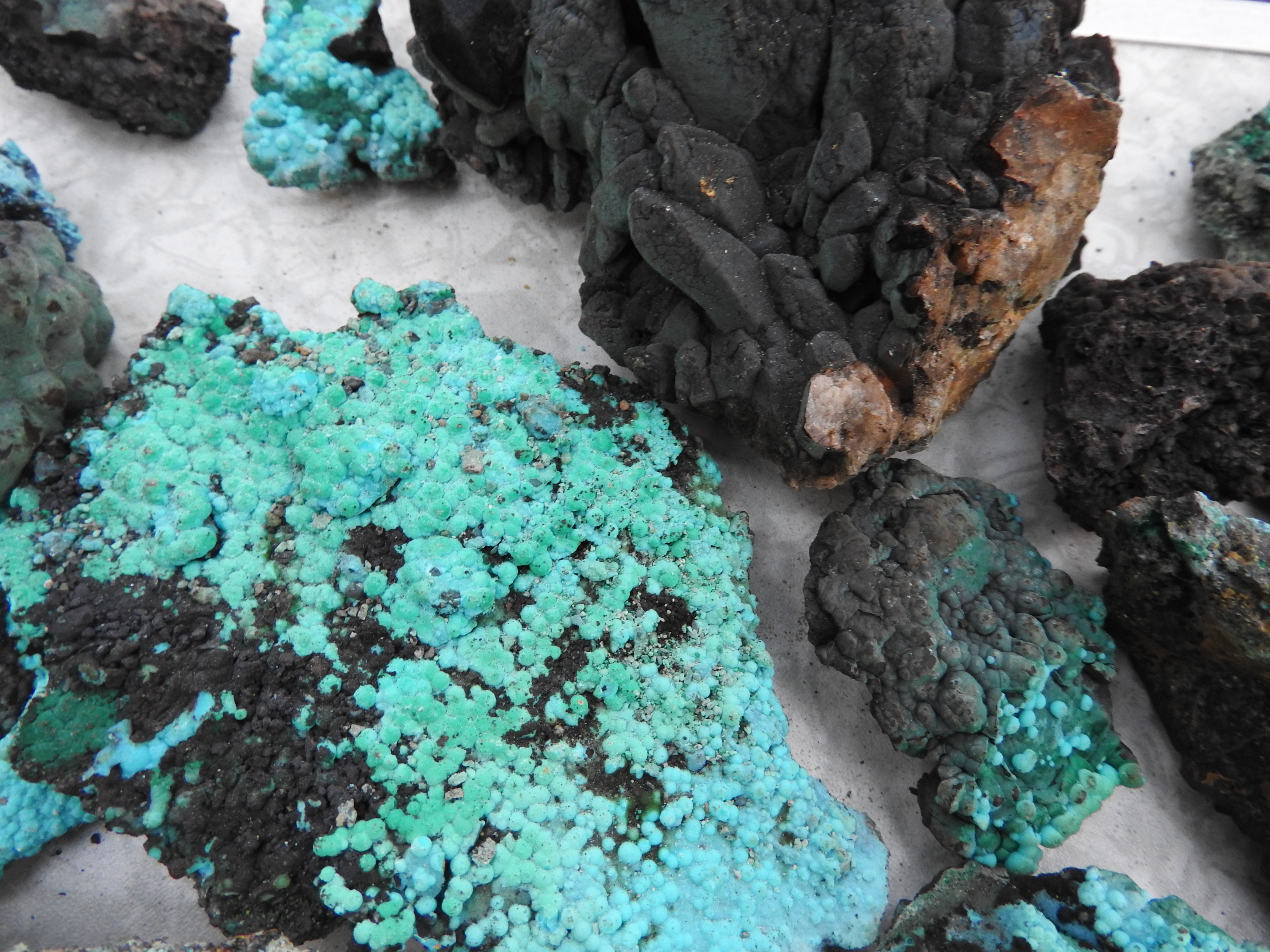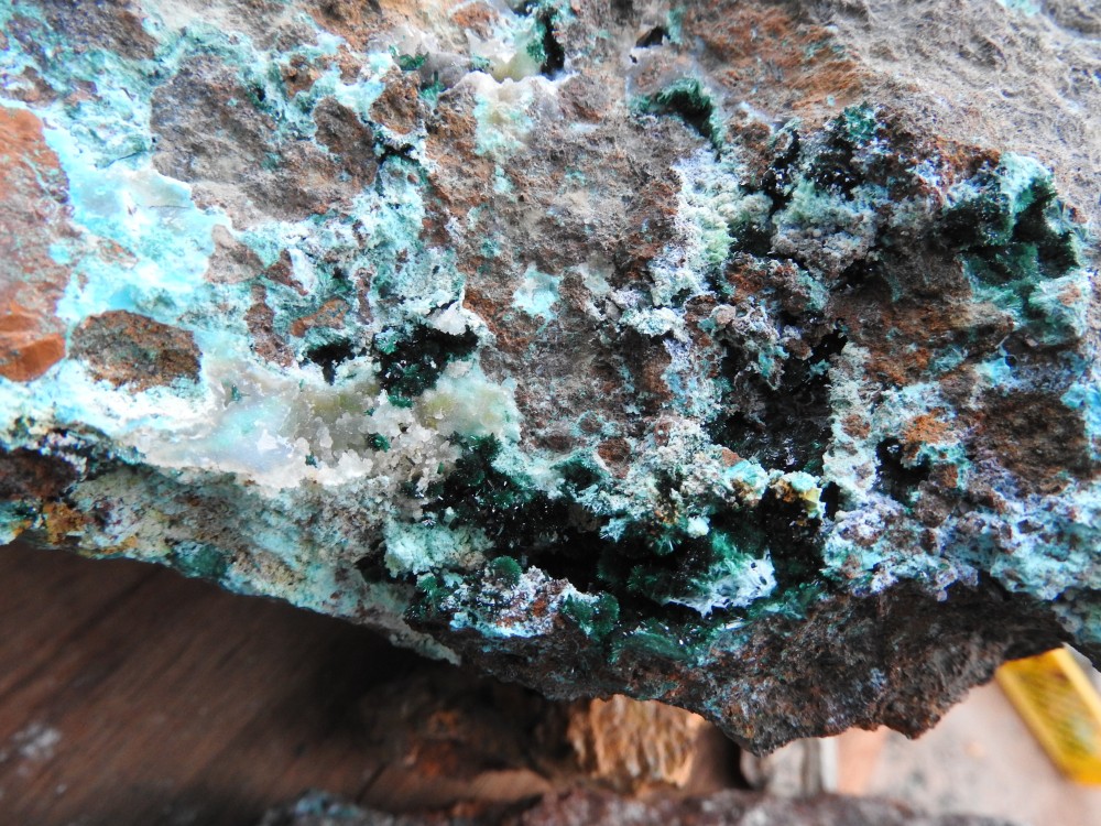 les cristaux verts plus trapus : libethenite  ;  sur dos adriana , avec le fond bleu tu peux avoir des aiguilles plus brillantes de dioptase ; dans la grosse breche (celle qu'ils ont fait peter) tu peux avoir aussi des encroûtements jaunes d'uranifères