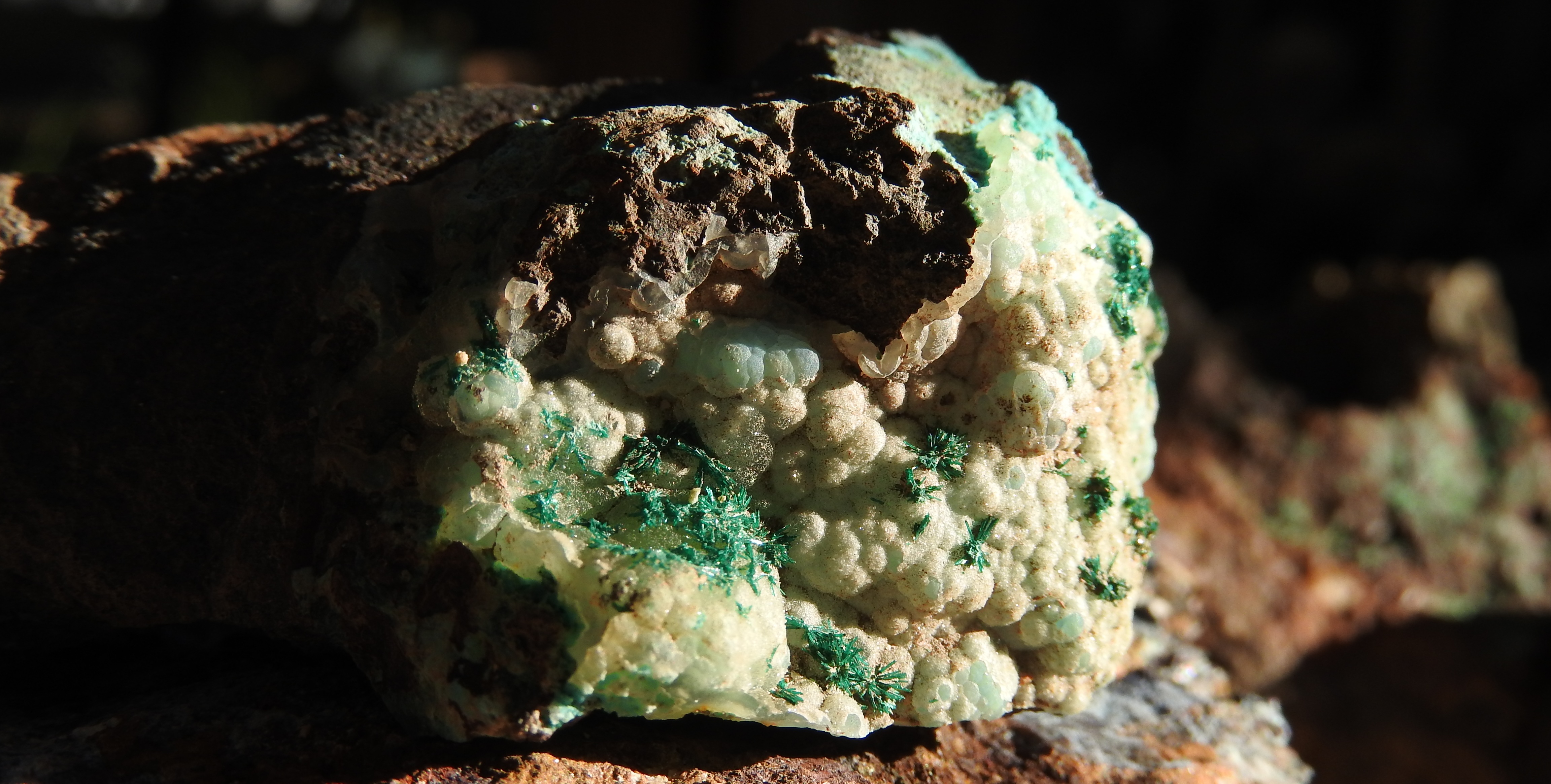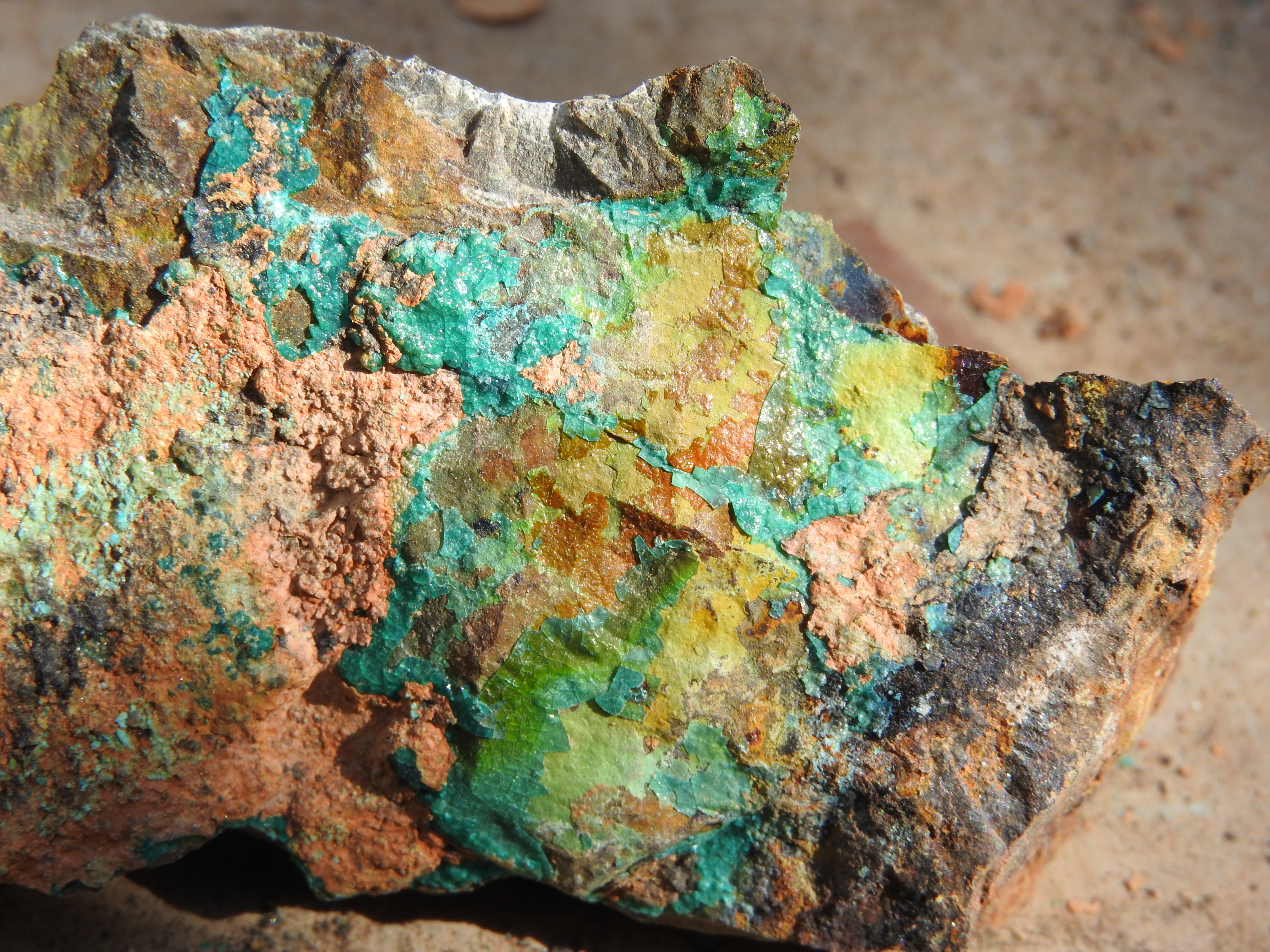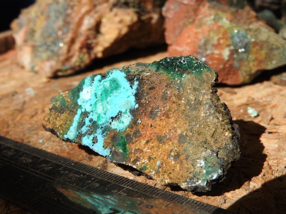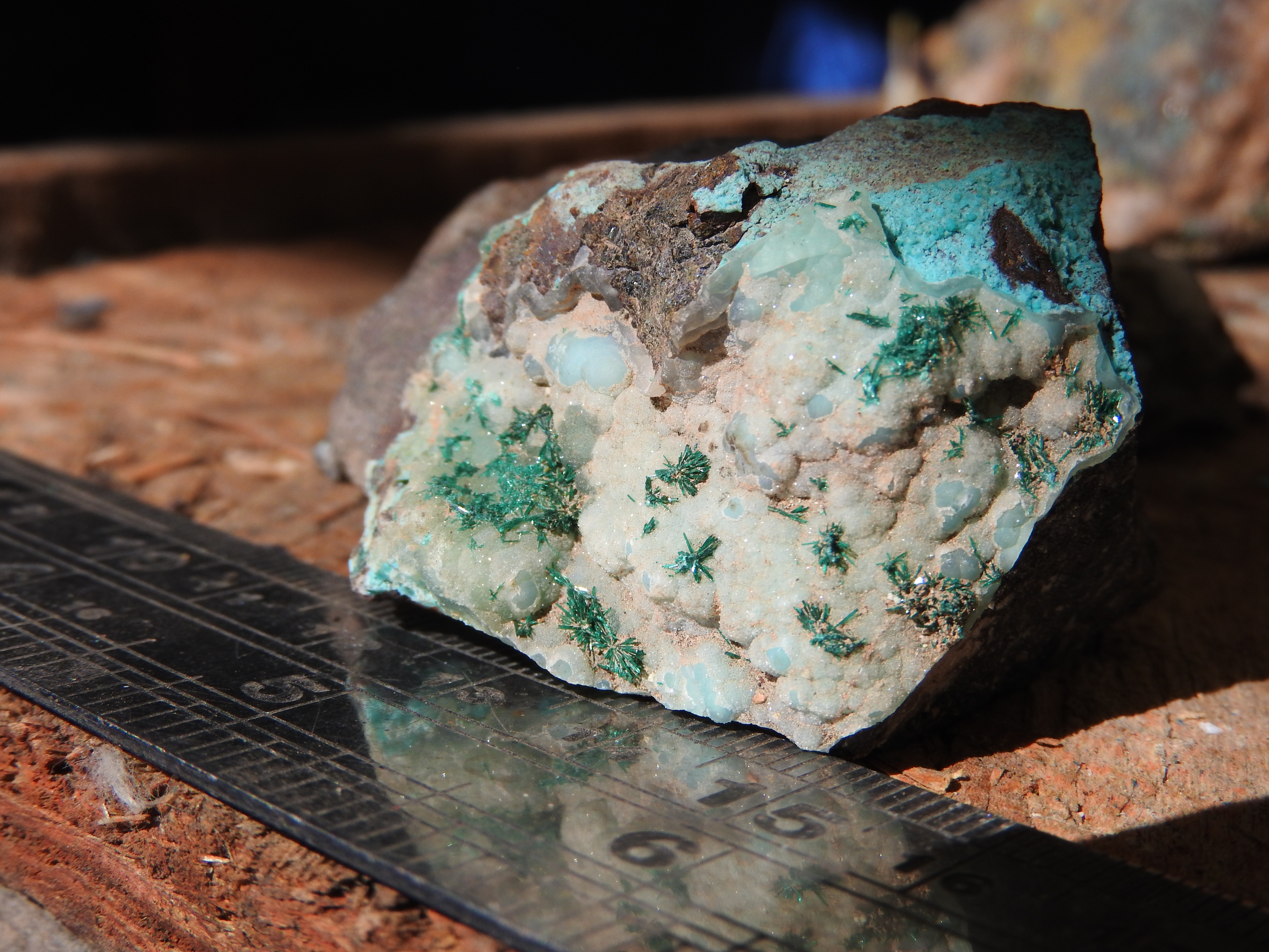les cristaux verts plus trapus : libethenite  ;  sur dos adriana , avec le fond bleu tu peux avoir des aiguilles plus brillantes de dioptase ; dans la grosse breche (celle qu'ils ont fait peter) tu peux avoir aussi des encroûtements jaunes d'uranifères
