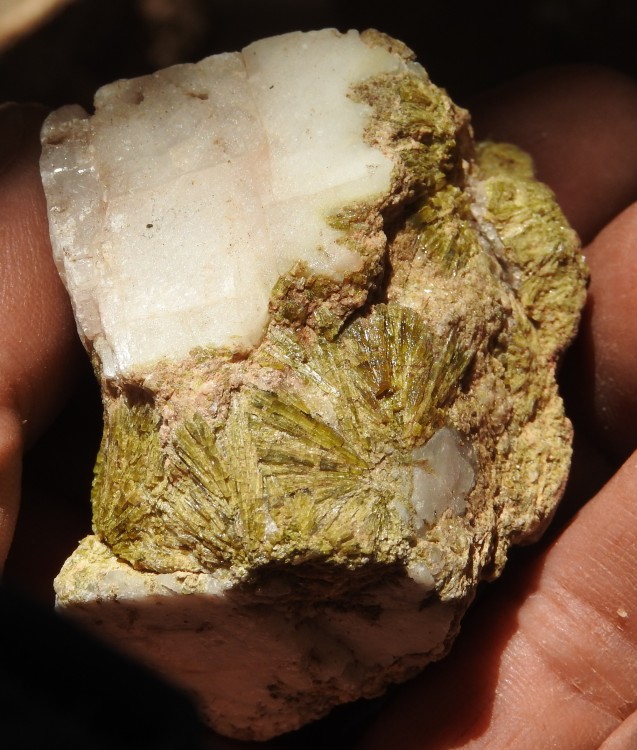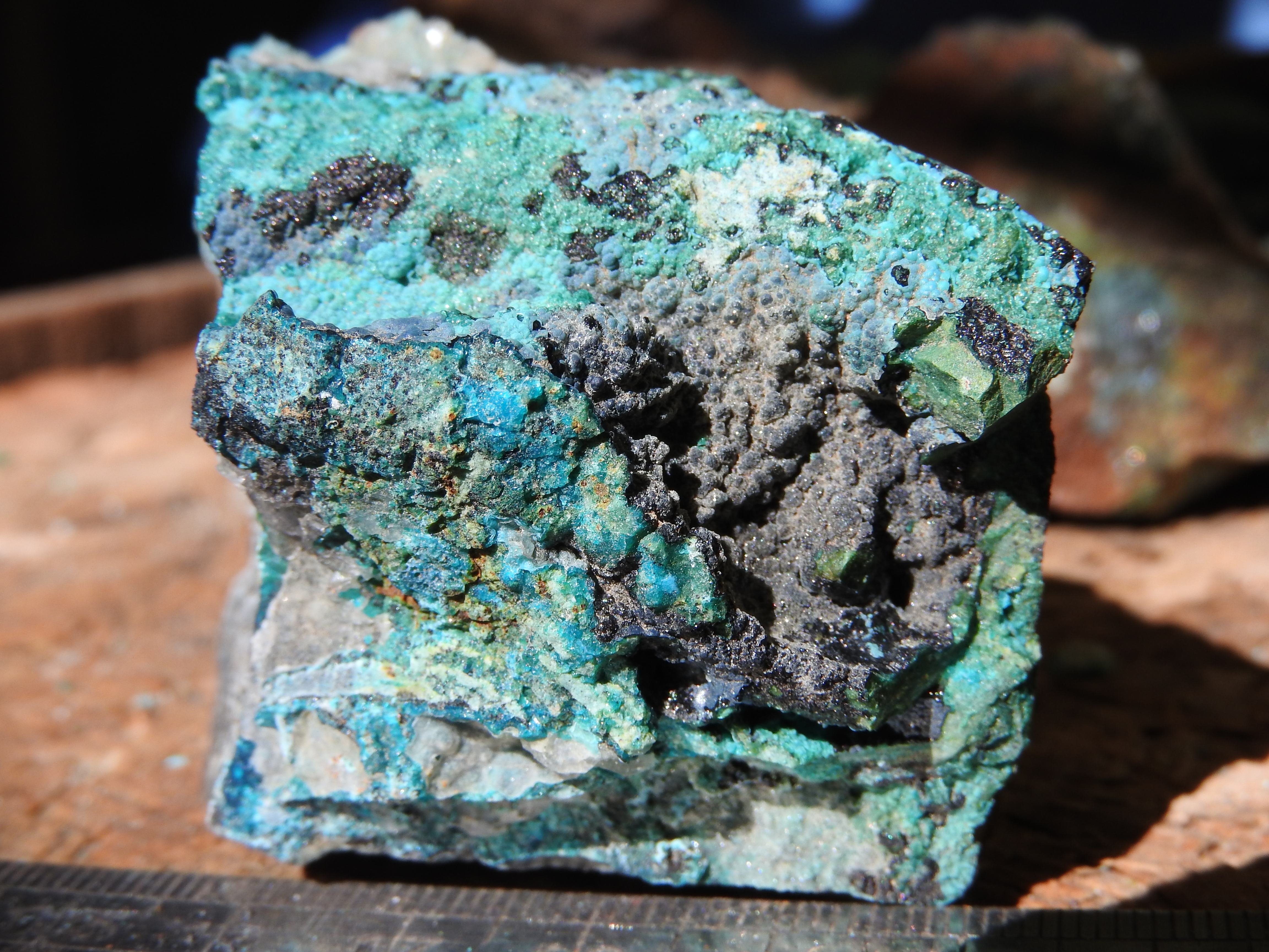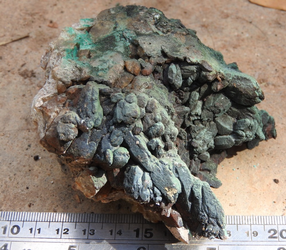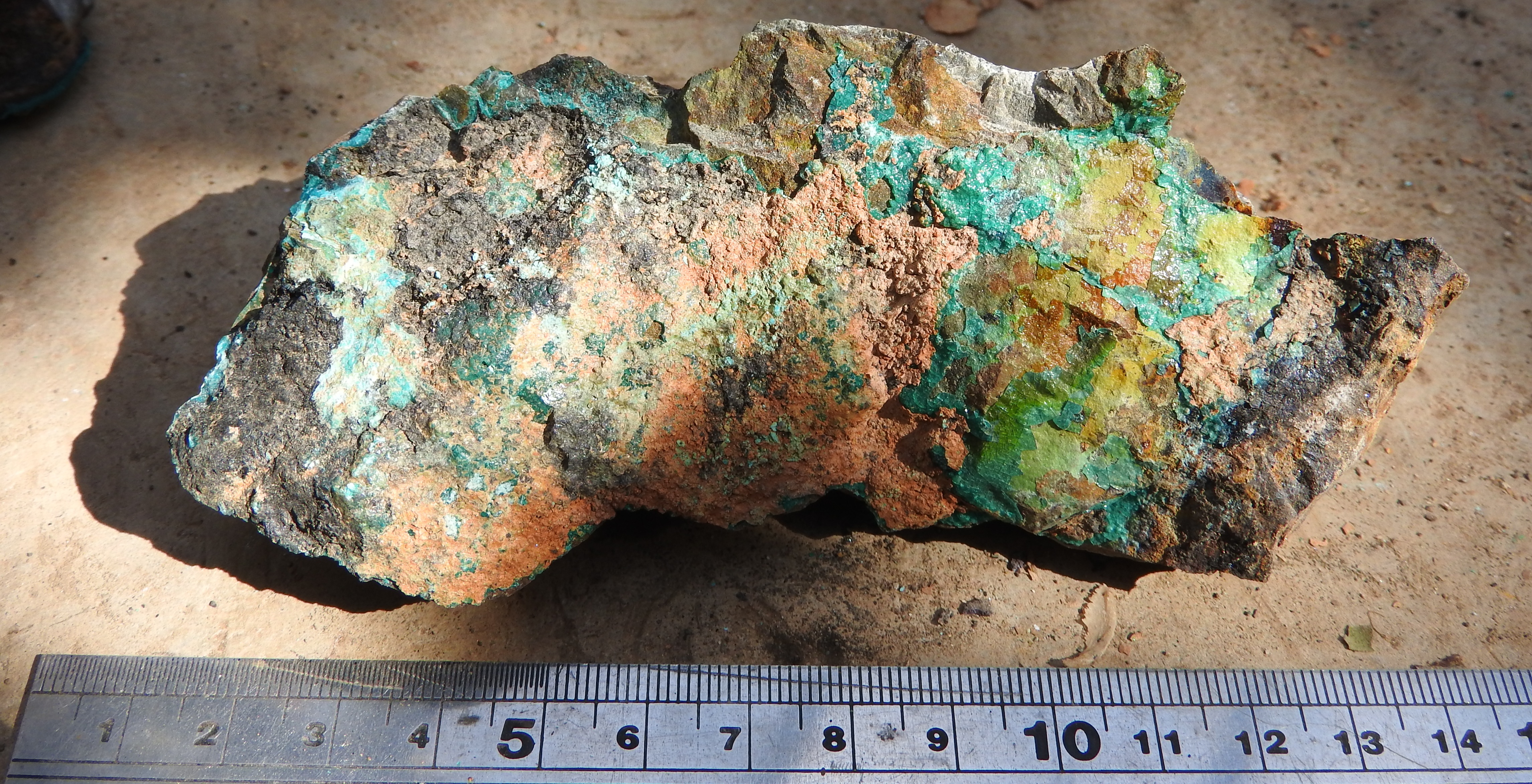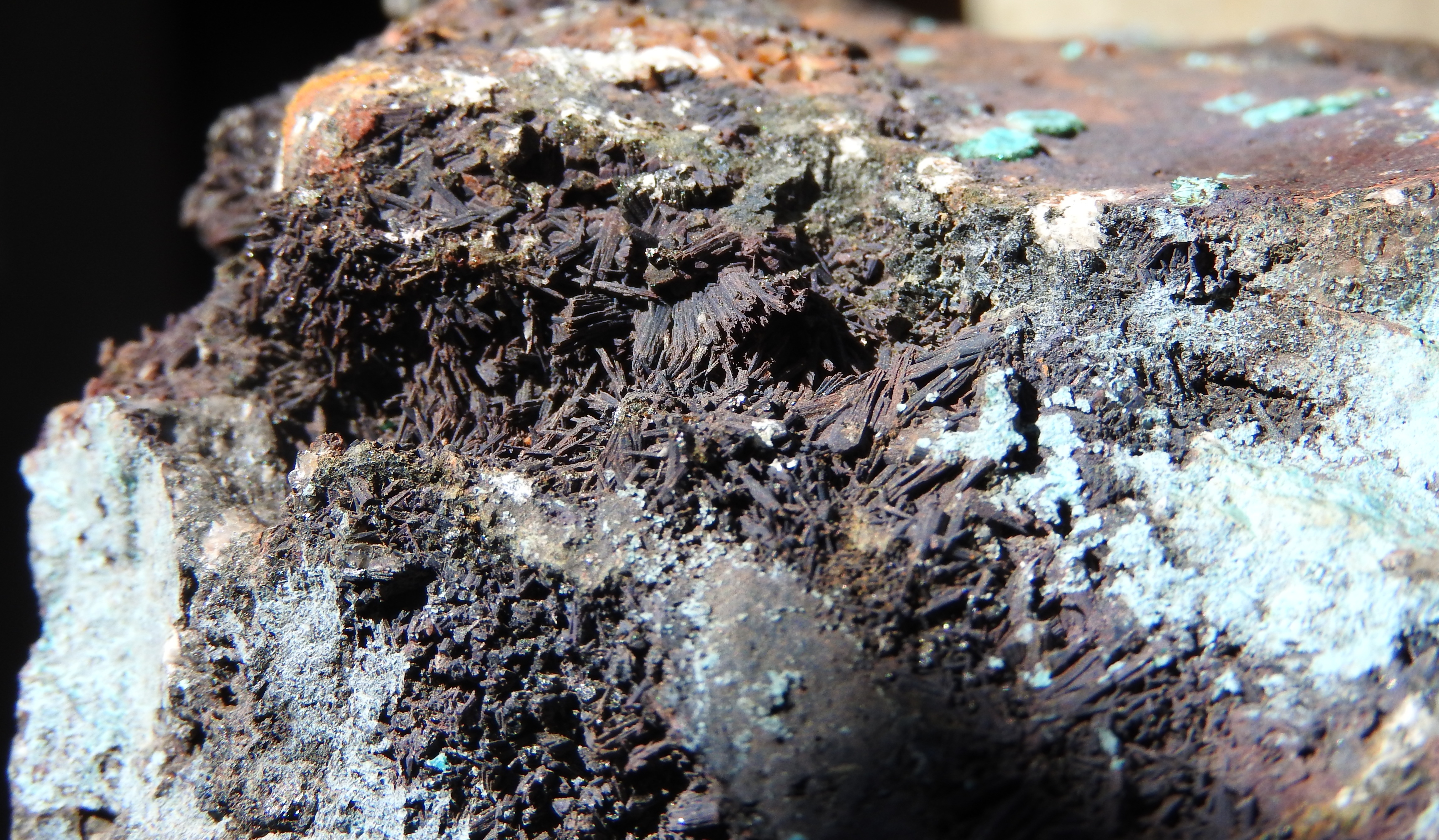 les cristaux verts plus trapus : libethenite  ;  sur dos adriana , avec le fond bleu tu peux avoir des aiguilles plus brillantes de dioptase ; dans la grosse breche (celle qu'ils ont fait peter) tu peux avoir aussi des encroûtements jaunes d'uranifères