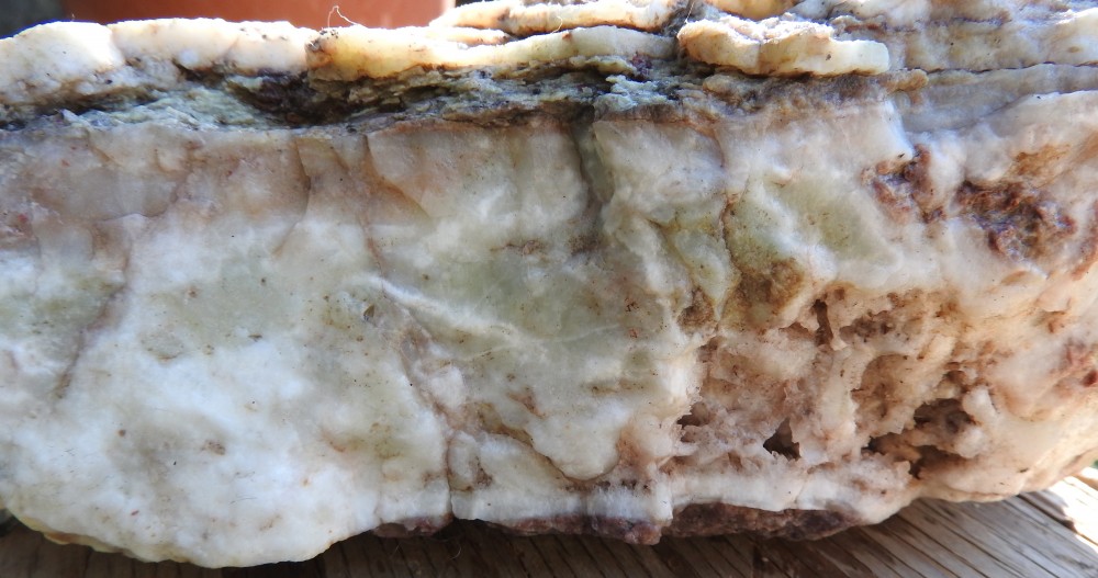 bon, je viens de ramener une autre pierre inconnue au bataillon... je pensais que j'avais trouvé LE bloc de chyroprase, mais raye une vitre, ne se fait pas rayer par une lame, aspect brillant, géode de quartz, ce n'est pas de l'onyx,du moins je crois, alors une petite idée de ce qu'est ce magnifique sandwich, qui ne demande qu'à être tranché. merci!