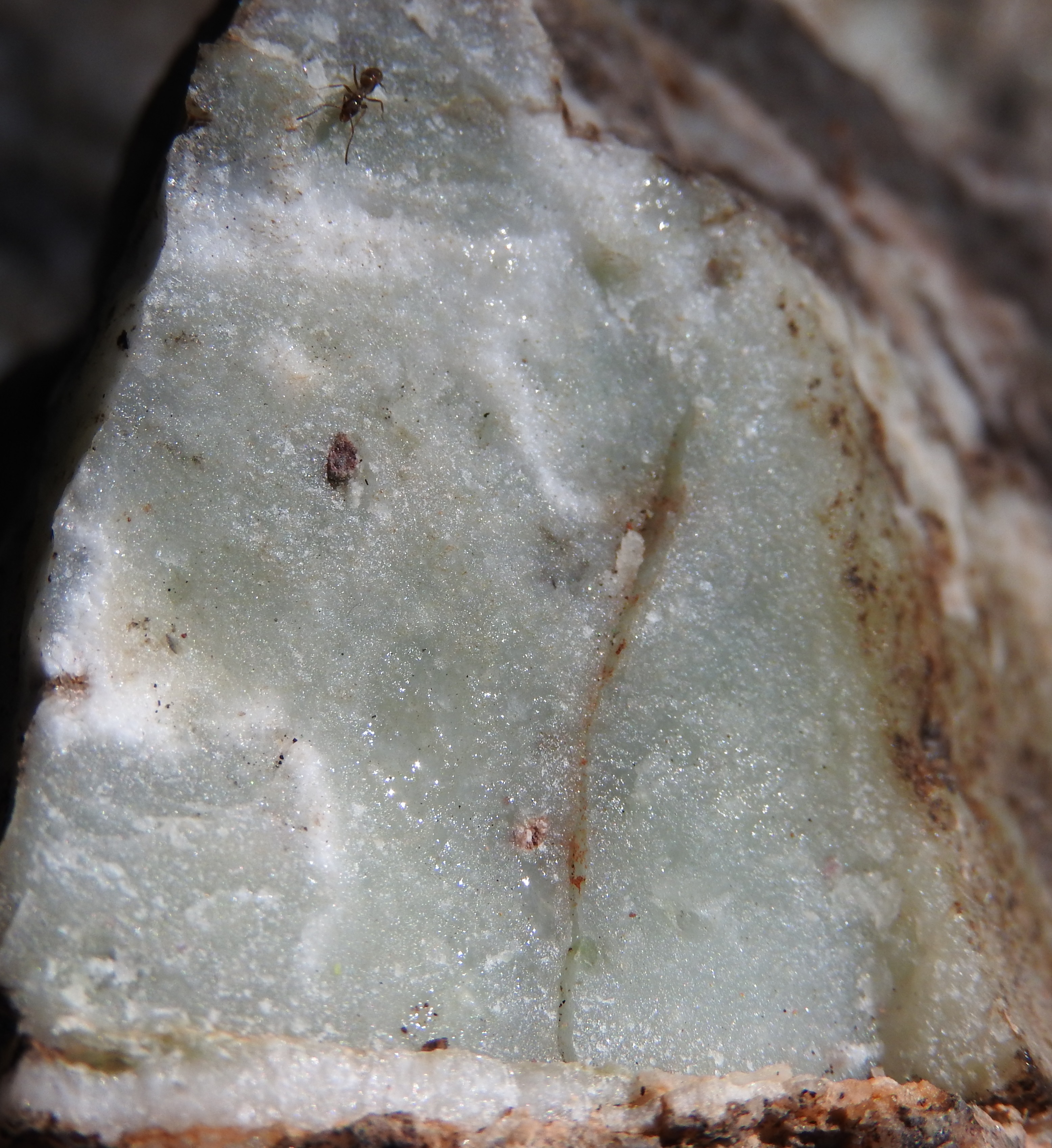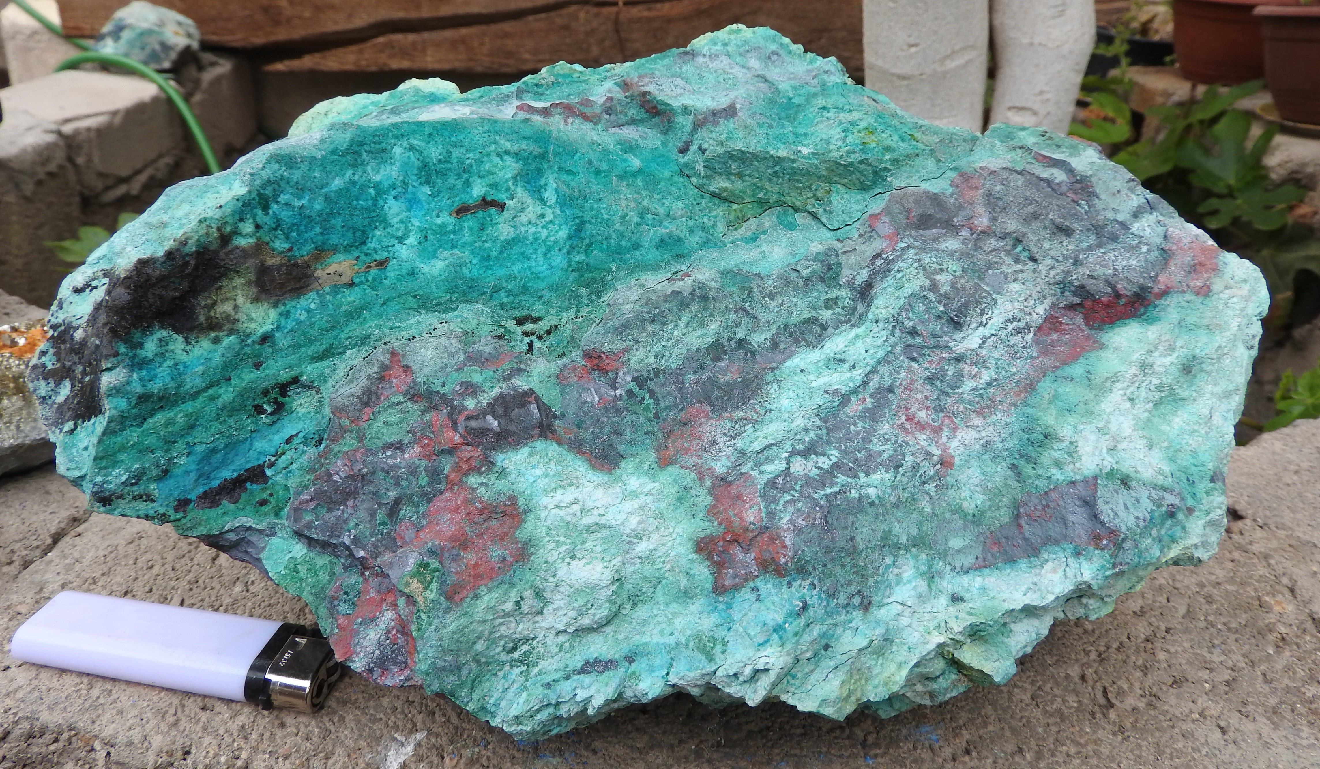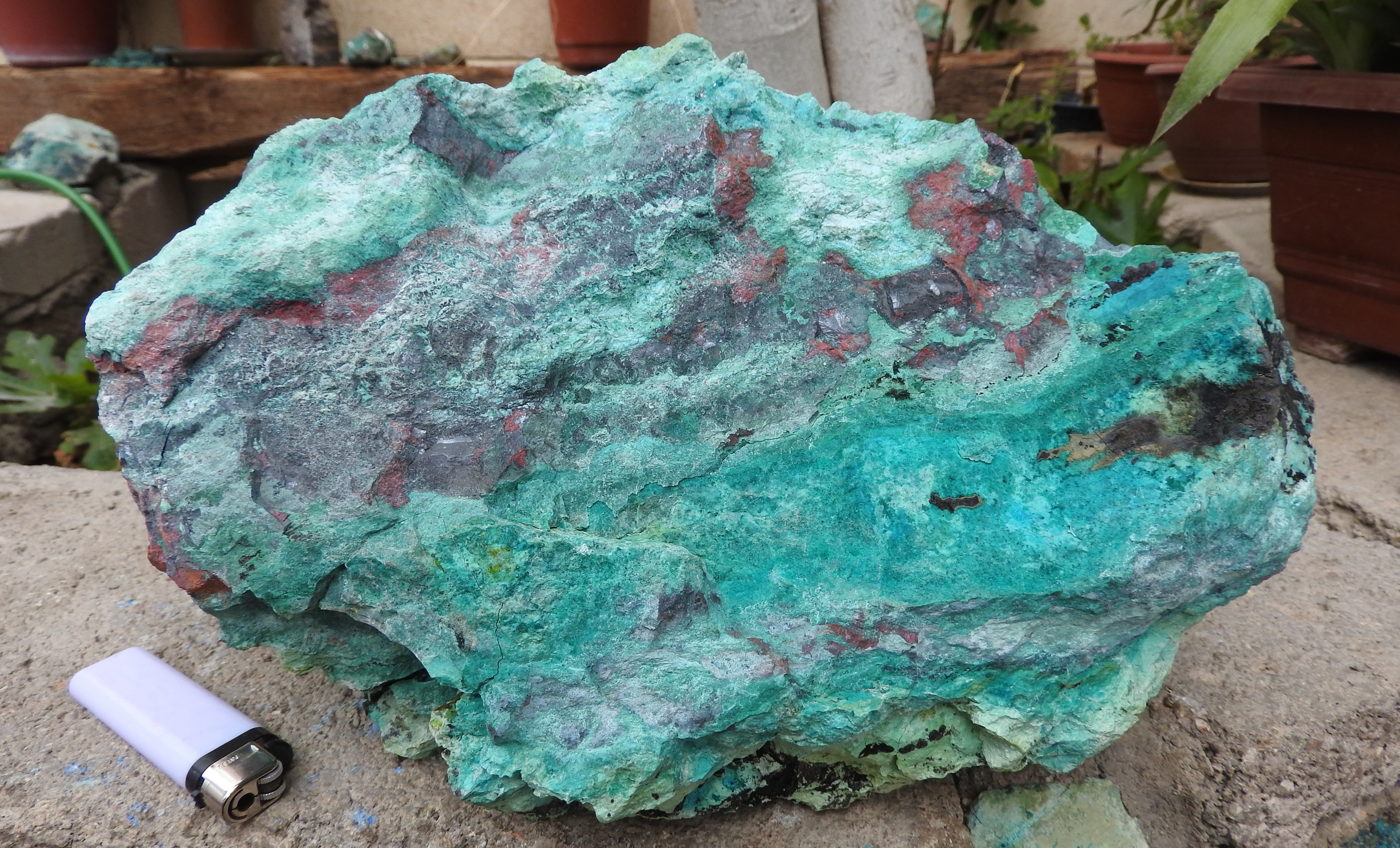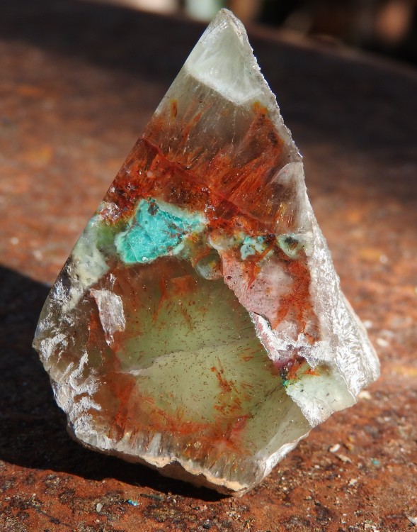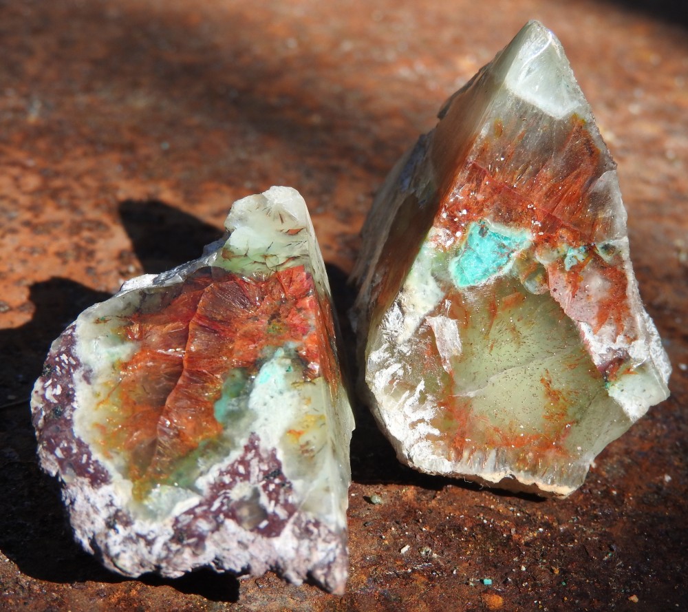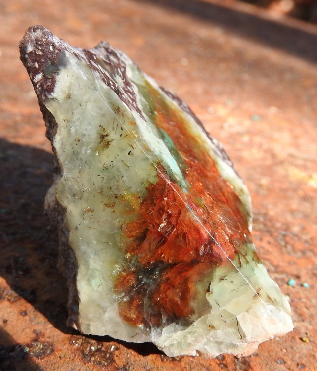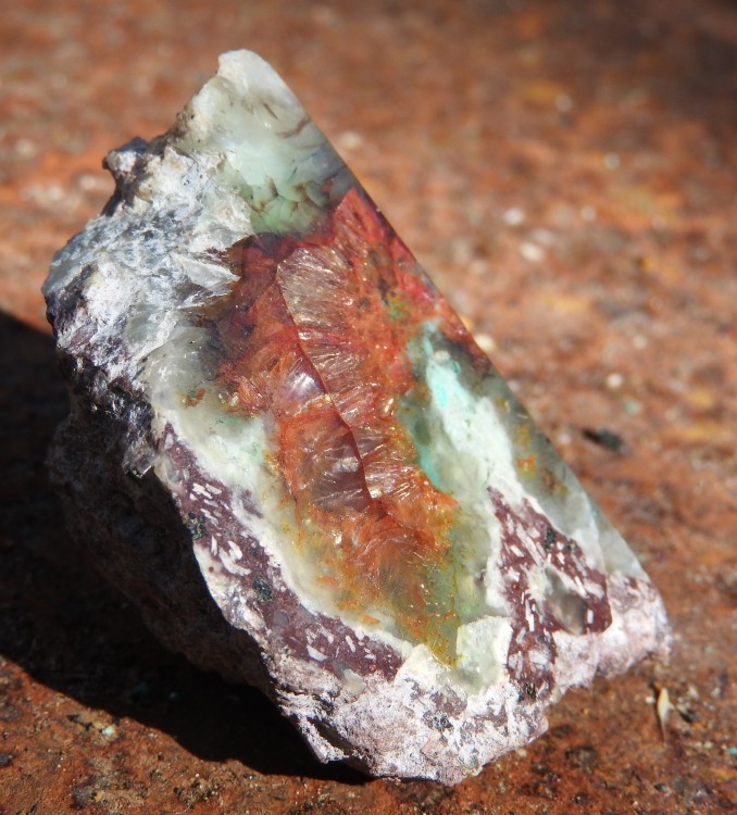 5-      132 x 10 cm, arête 1.8 cm, long totale : 3.5 cm,  la proximité d'une veine de cuivre ajoute chrysocolle, calcédoine , tant mieux ça donne plus de contraste,
