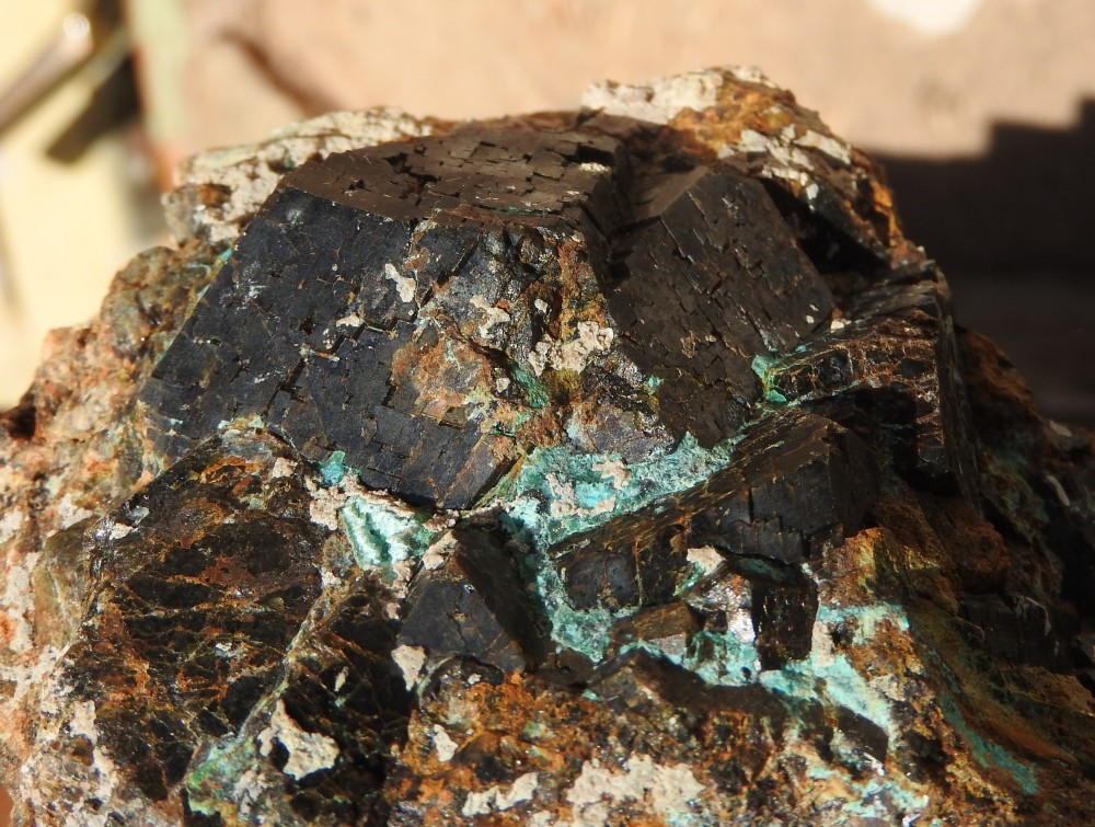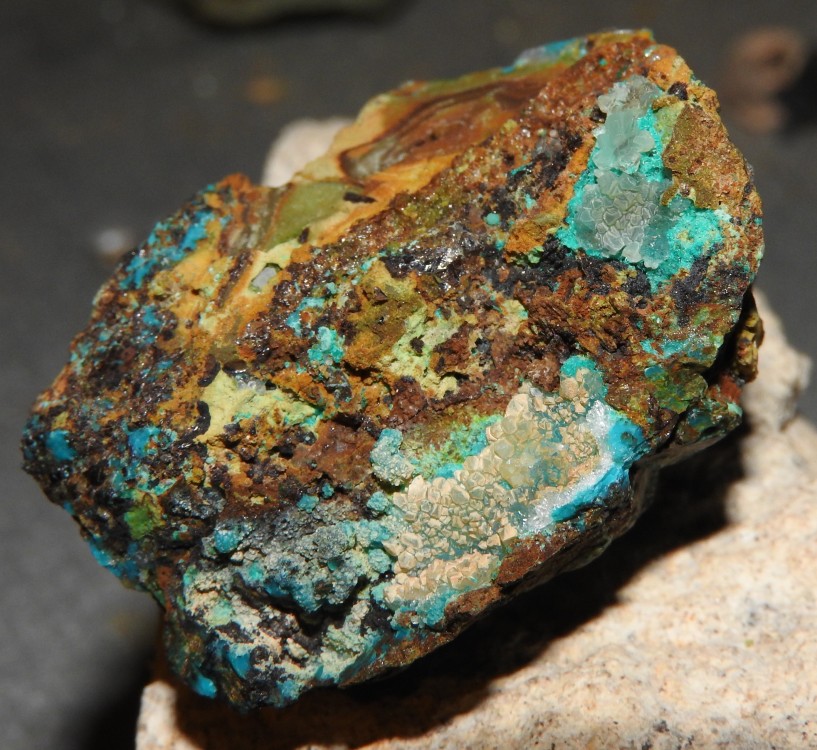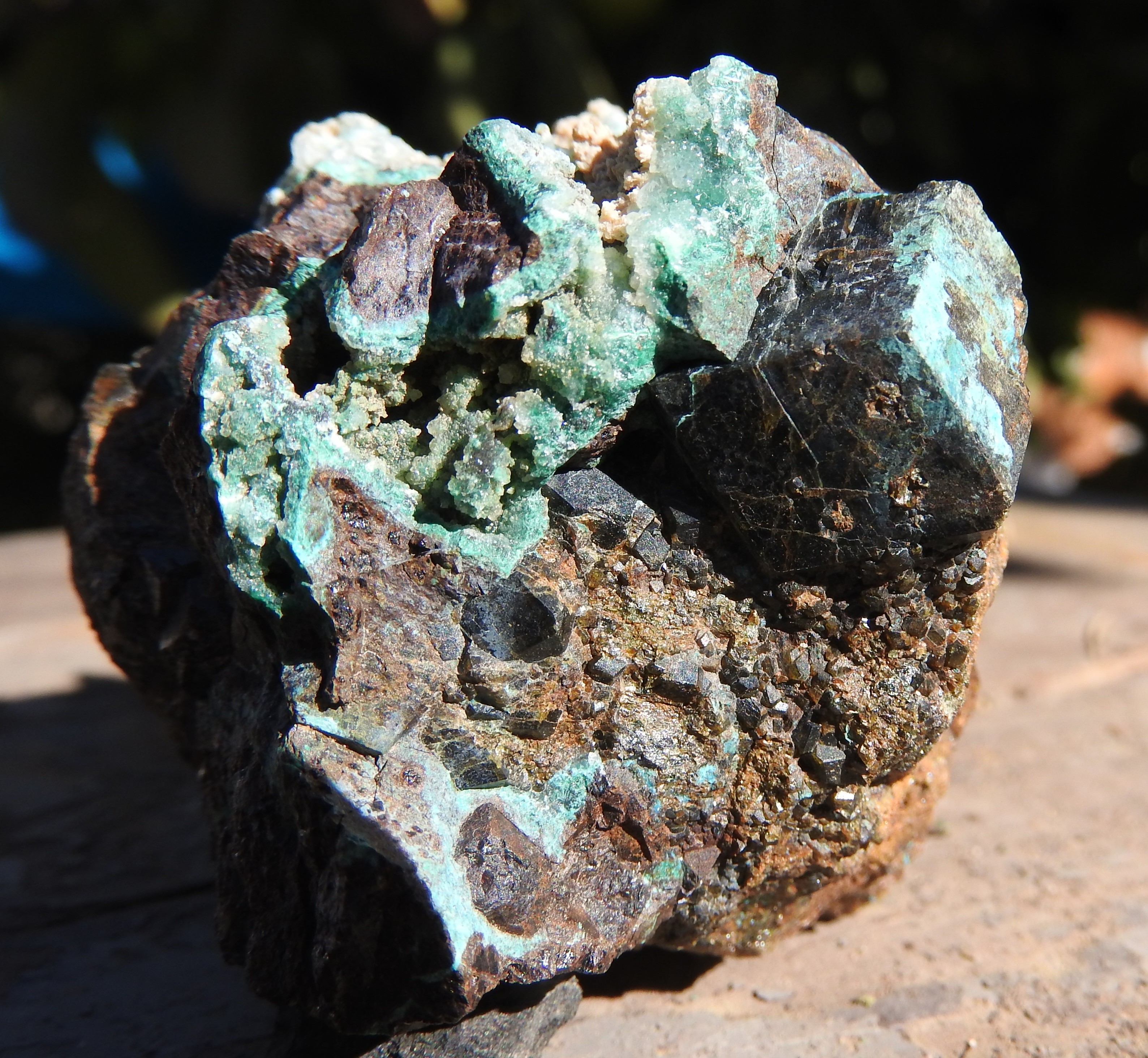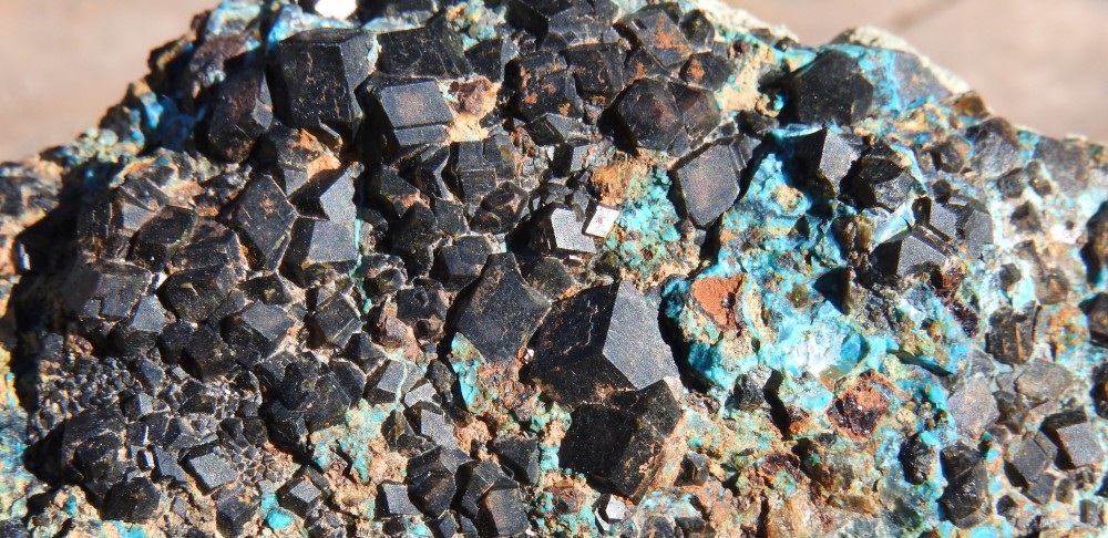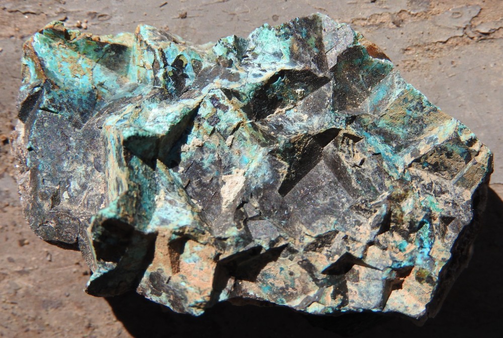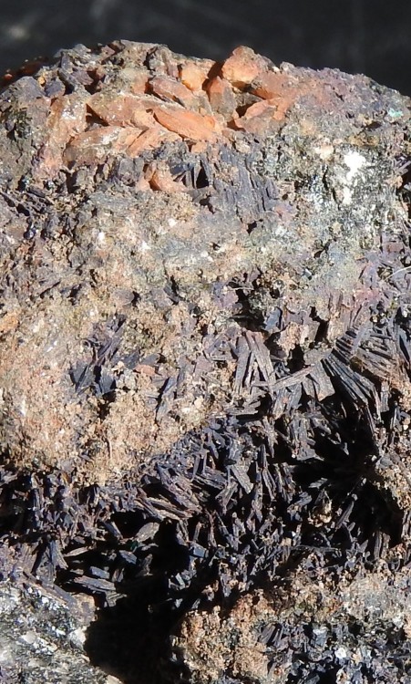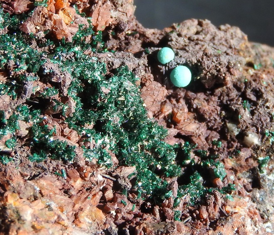 2-   celle-ci fait 10 x 7.5 cm, le cristal du haut a 1 cm d'arête, association avec calcite, chrysocolle, et peut être  cuprite, à moins que ce ne soit du fer,
