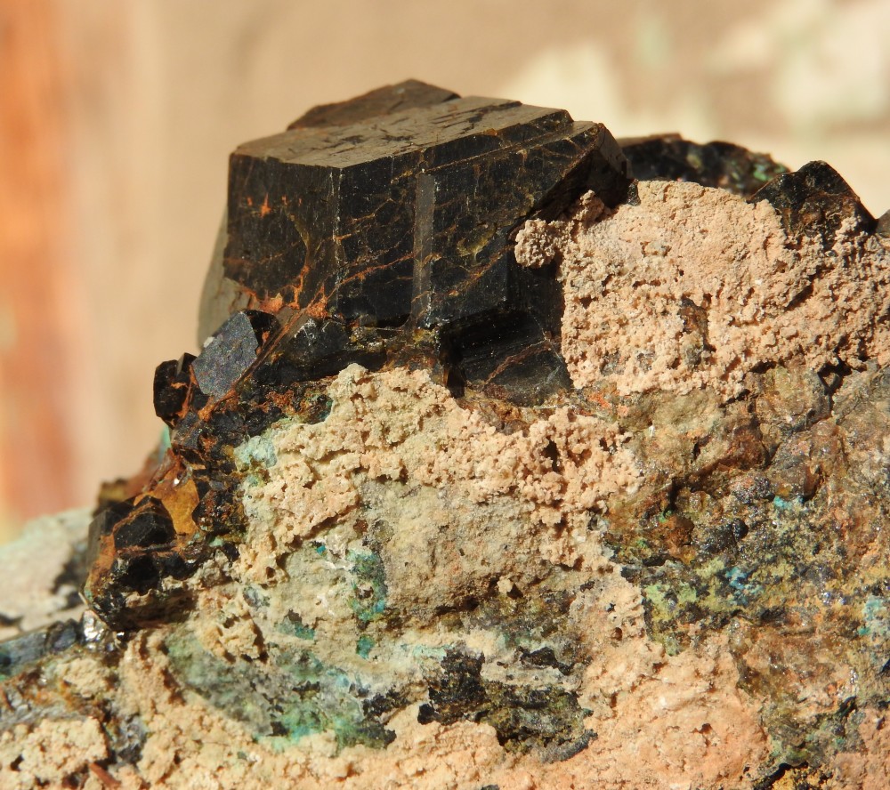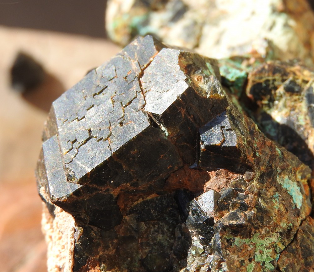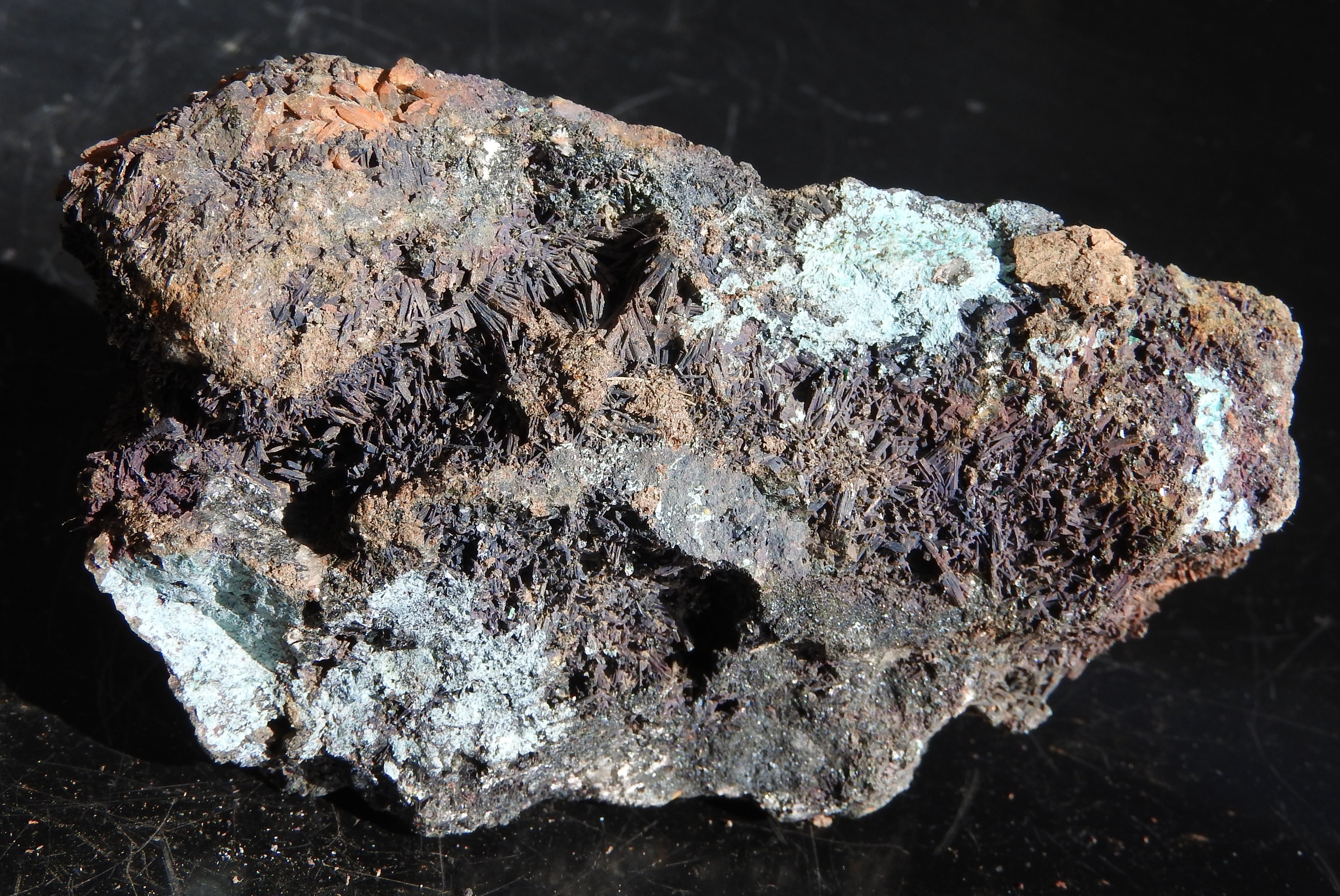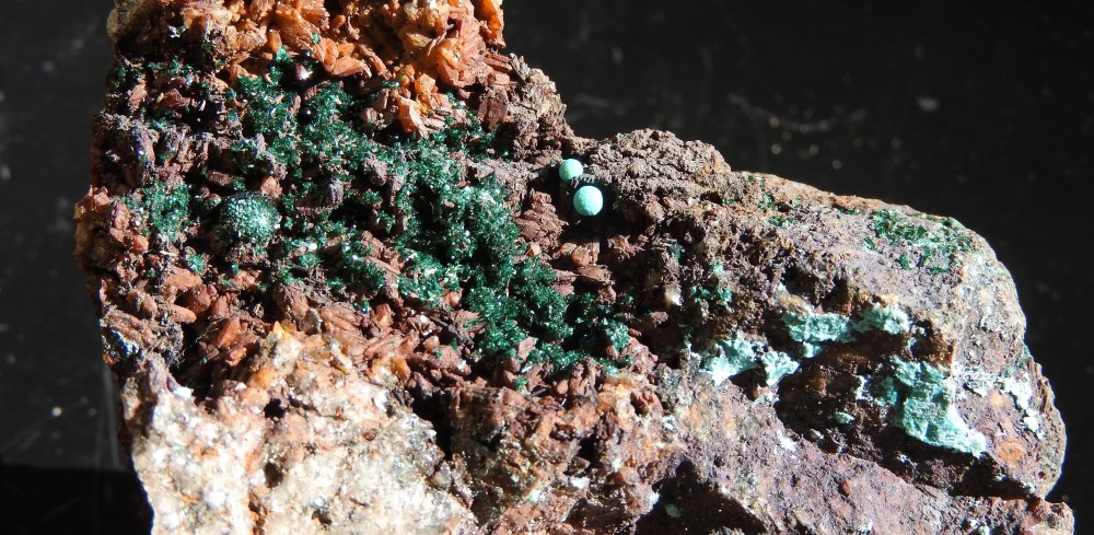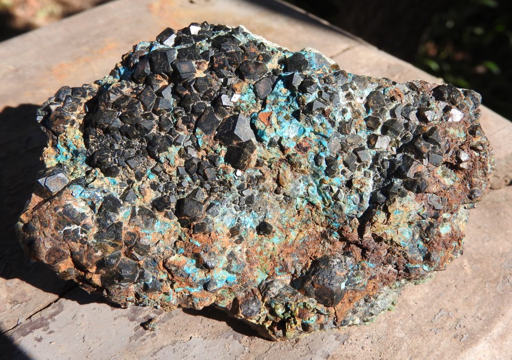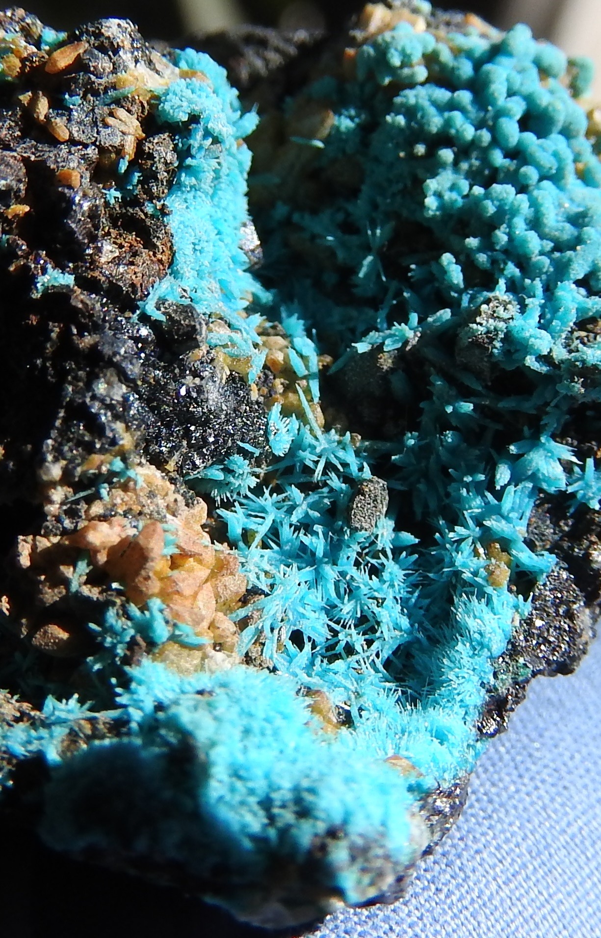 2-   celle-ci fait 10 x 7.5 cm, le cristal du haut a 1 cm d'arête, association avec calcite, chrysocolle, et peut être  cuprite, à moins que ce ne soit du fer,