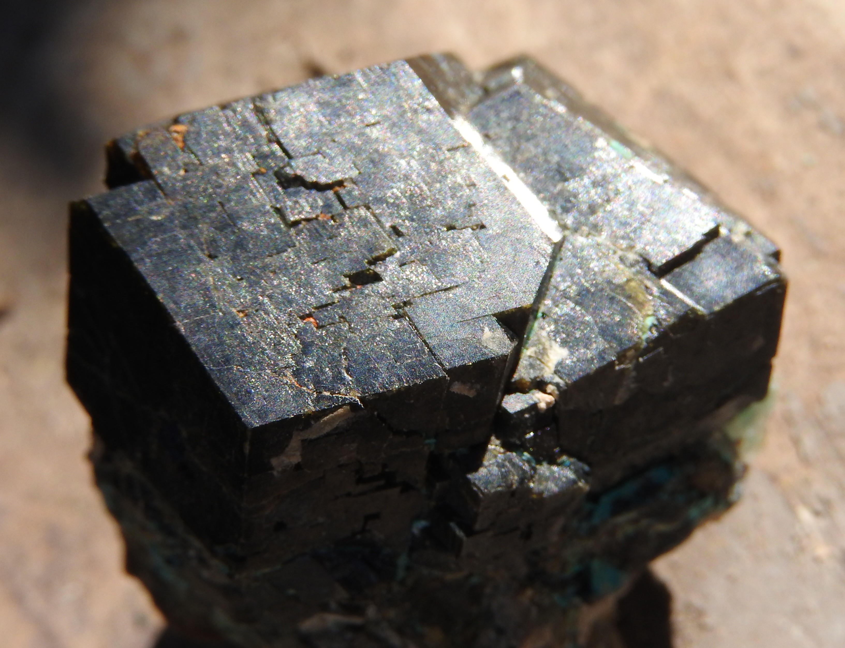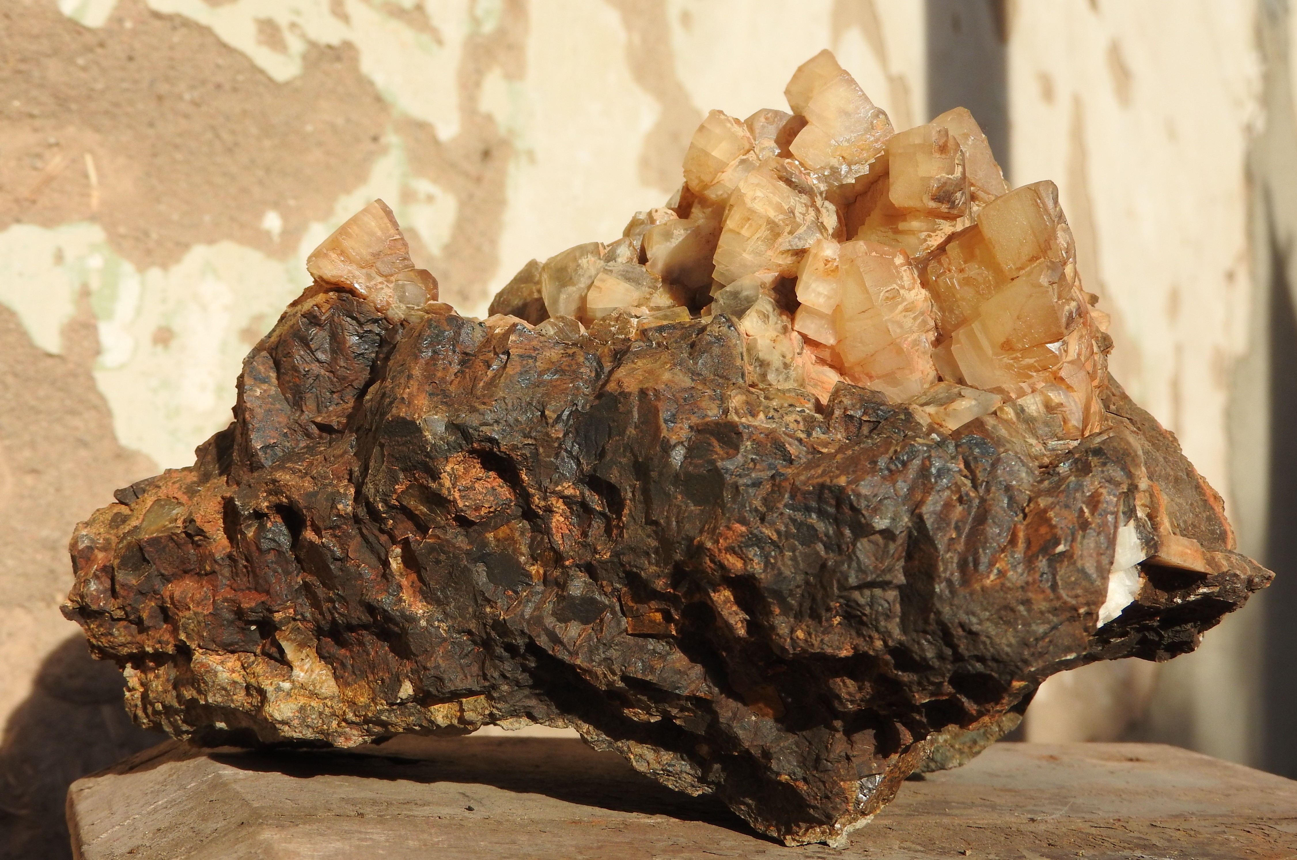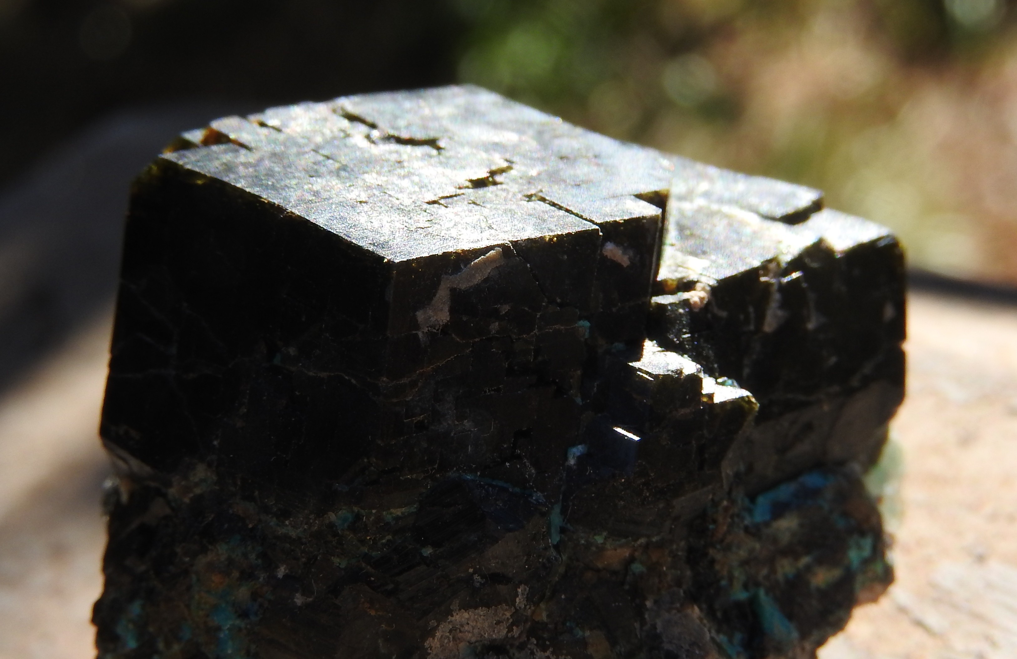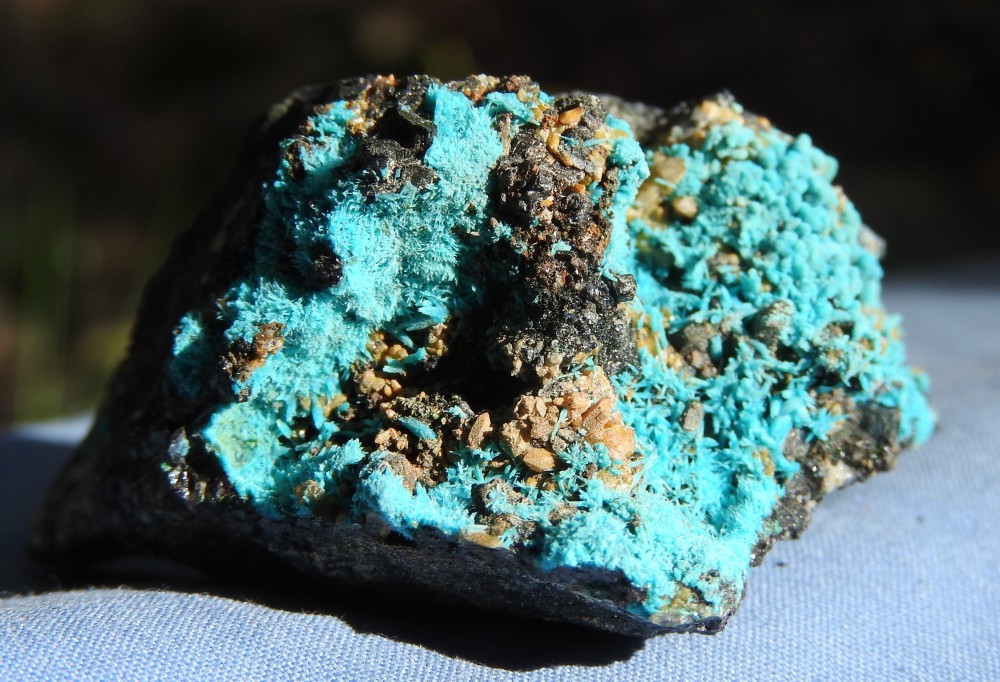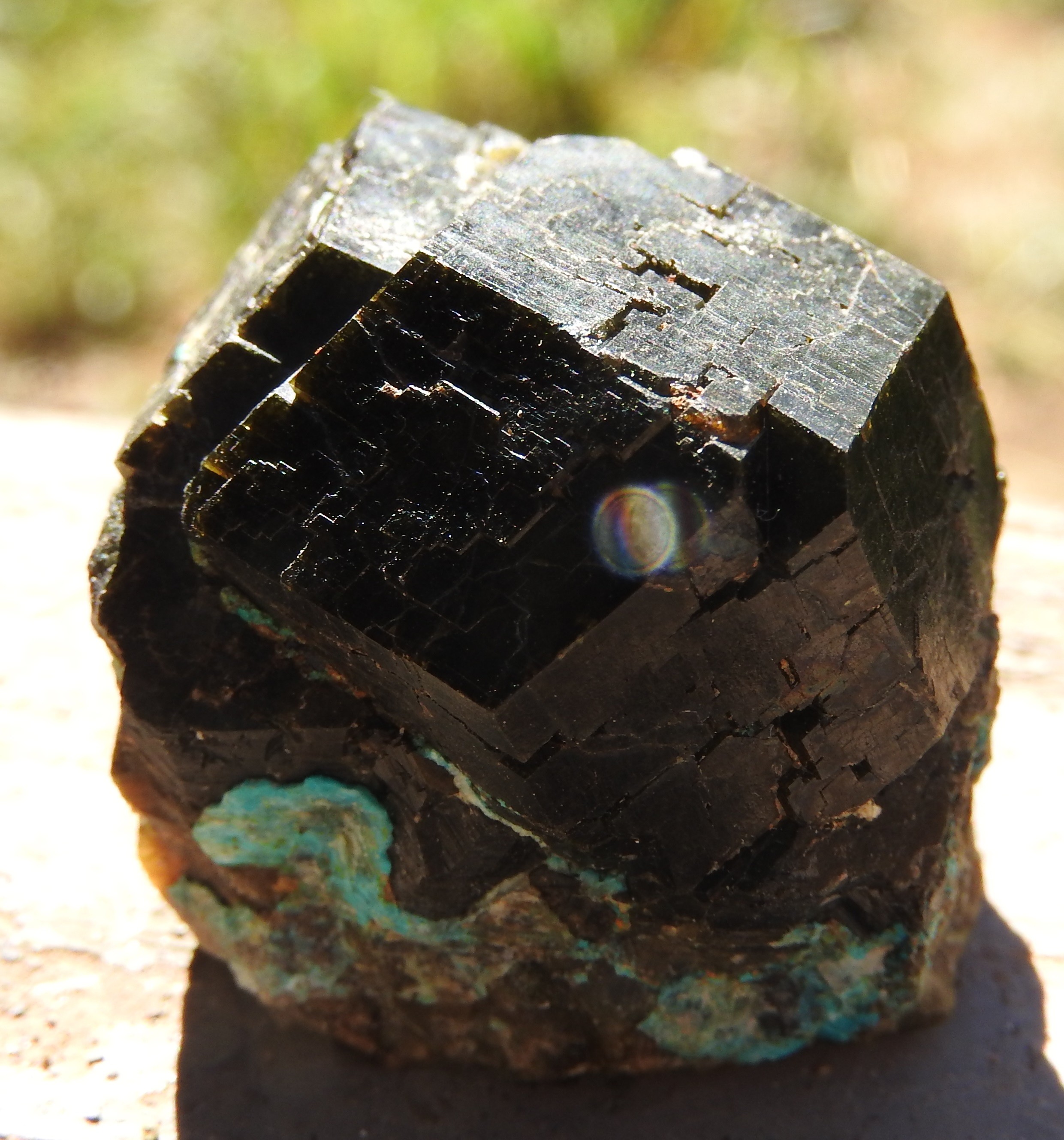 2-   celle-ci fait 10 x 7.5 cm, le cristal du haut a 1 cm d'arête, association avec calcite, chrysocolle, et peut être  cuprite, à moins que ce ne soit du fer,