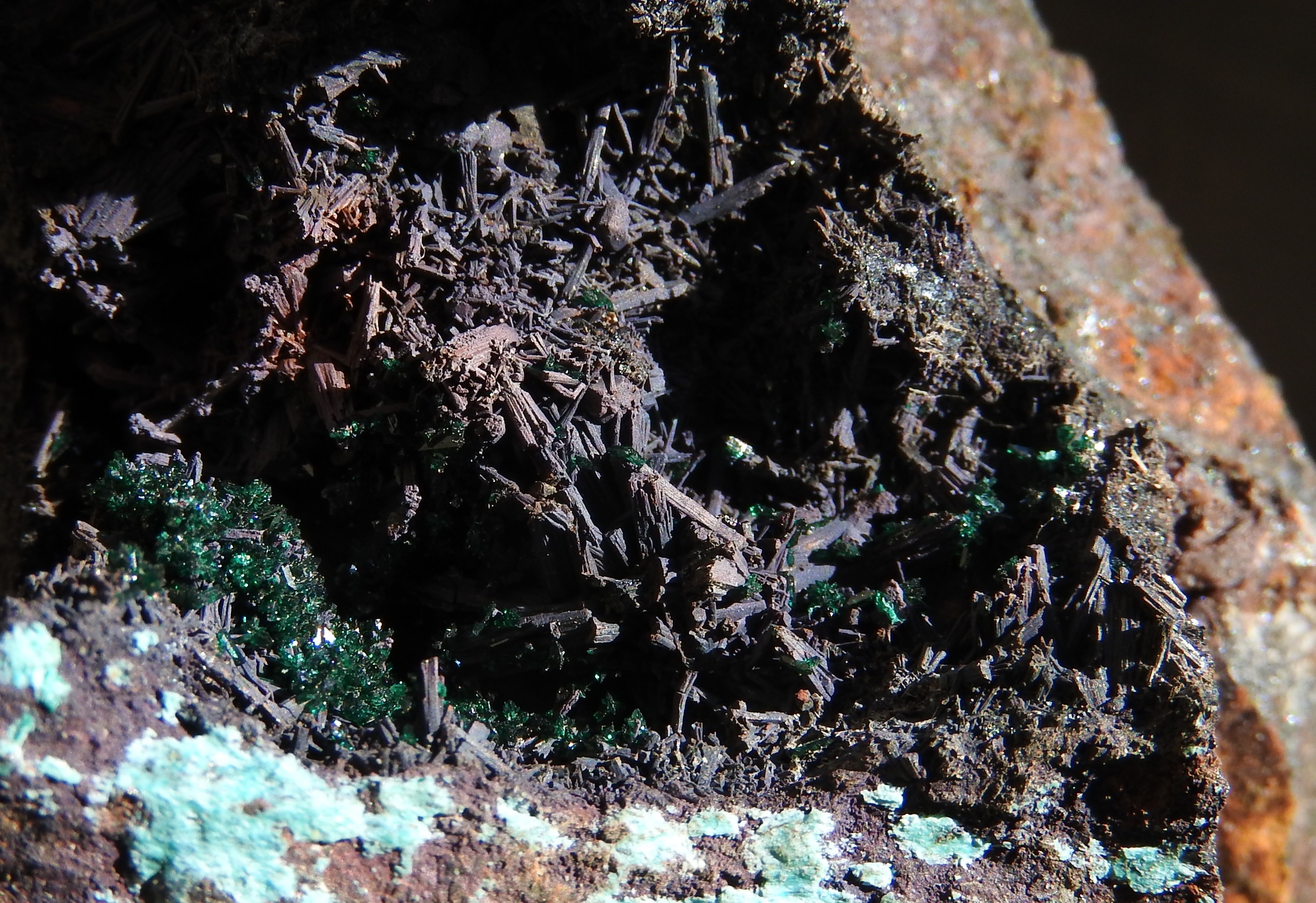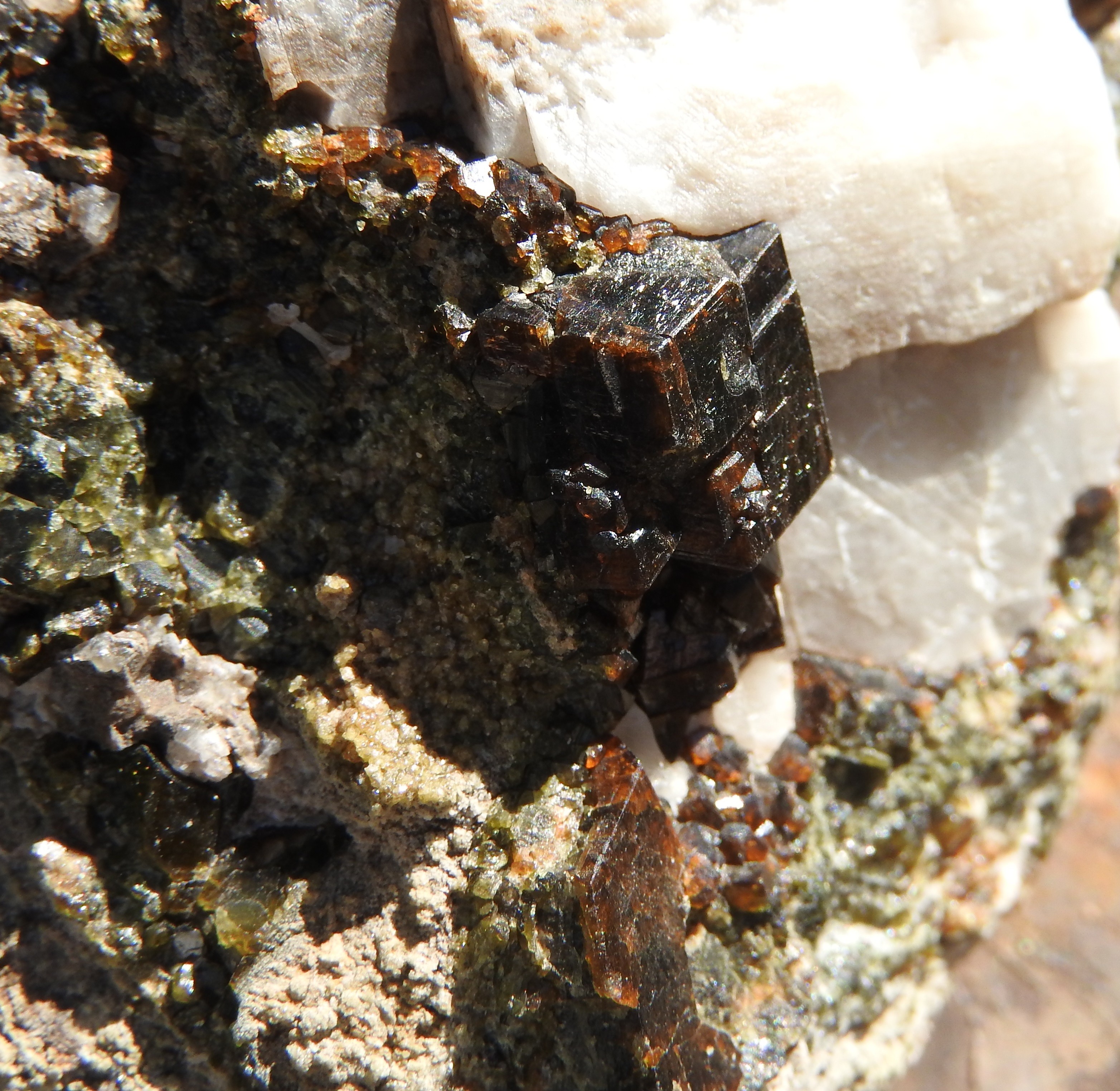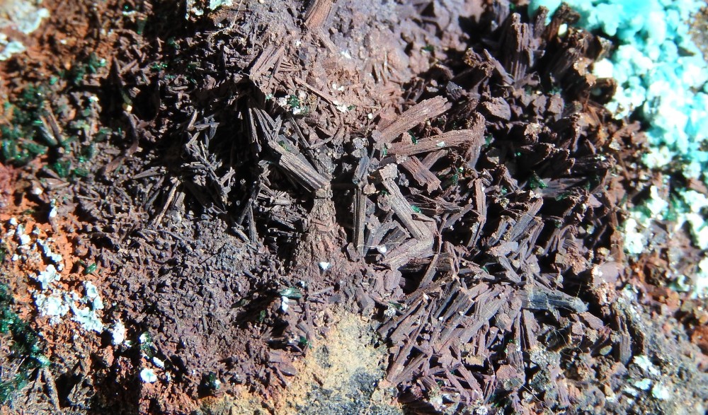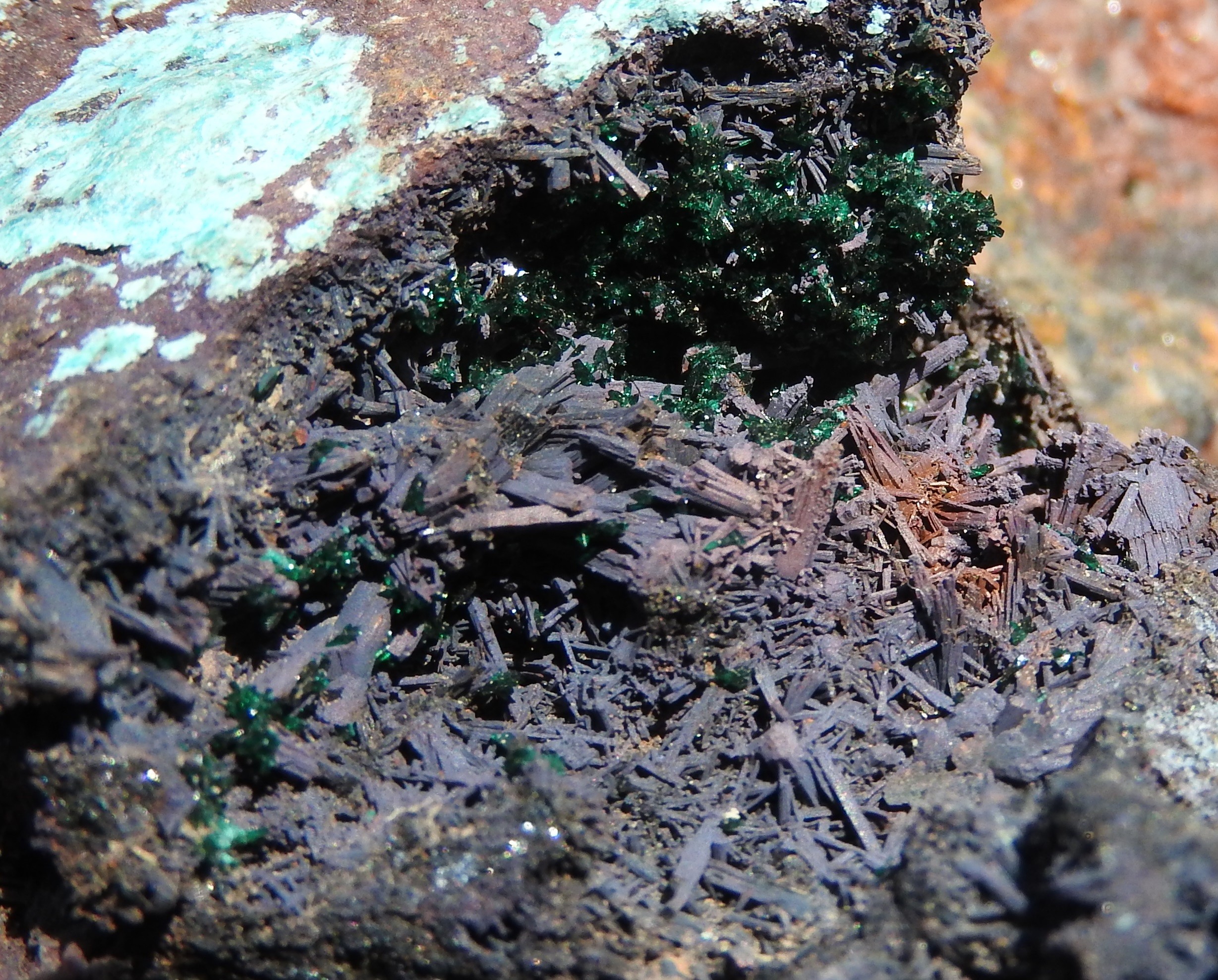 9-   association grenats, chrysocolle, calcédoine, hématite (derriere) et p'etre bien cuprite.... arête 1 cm,