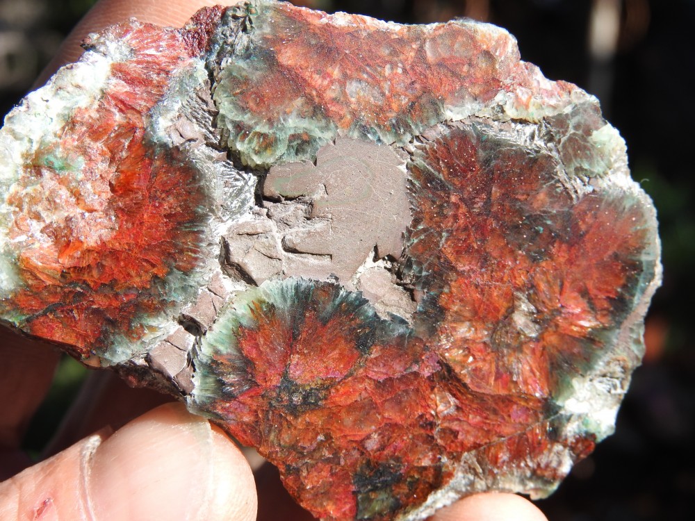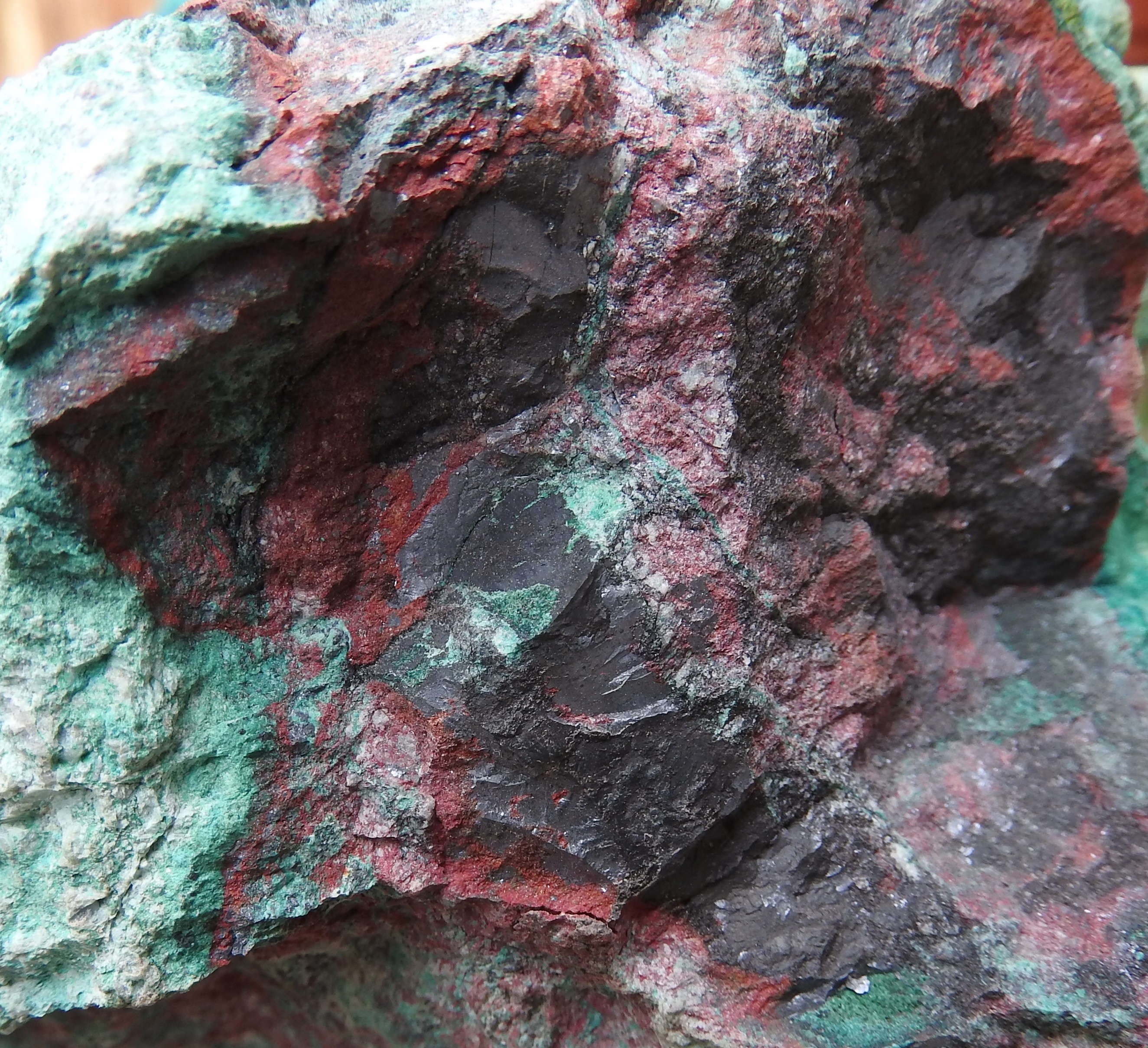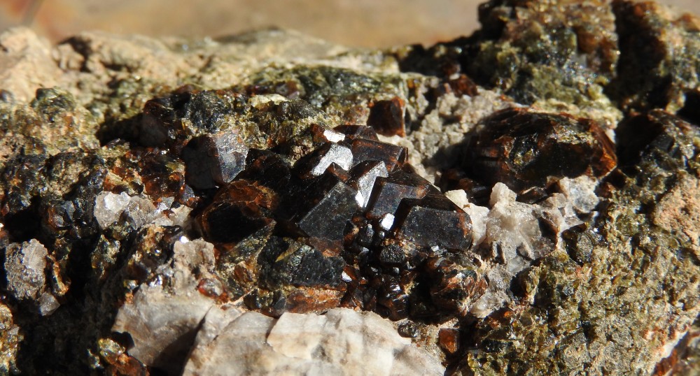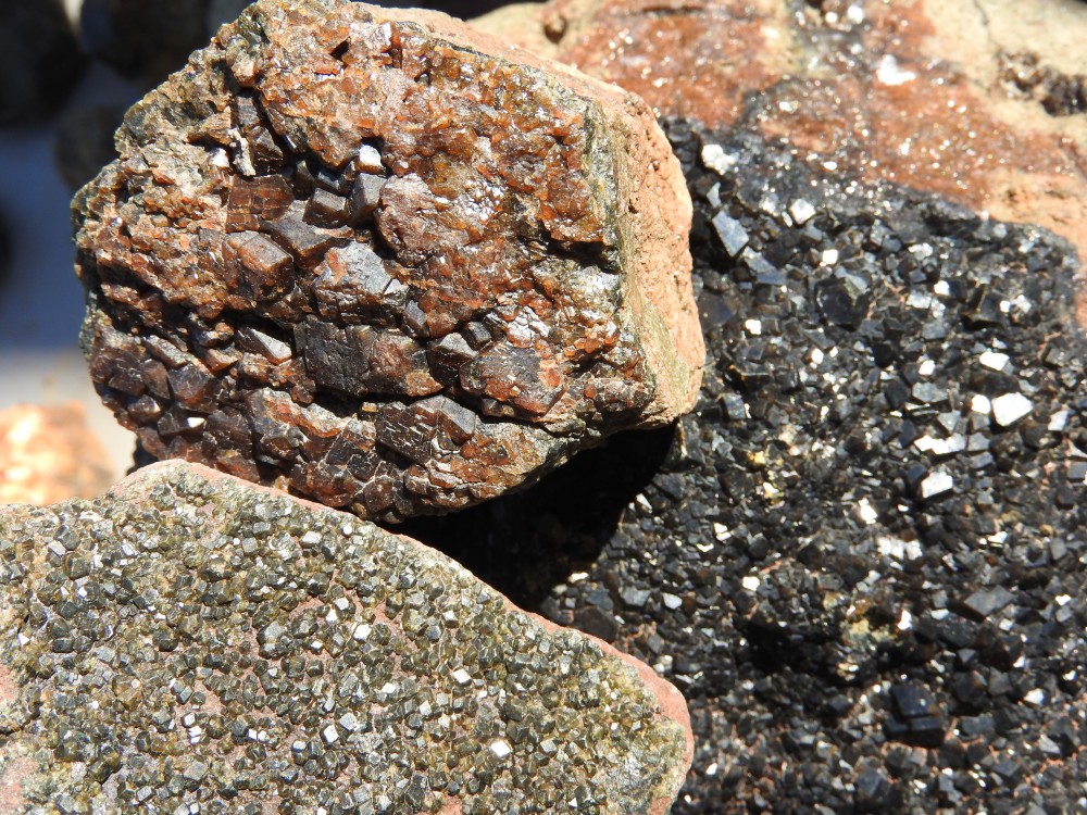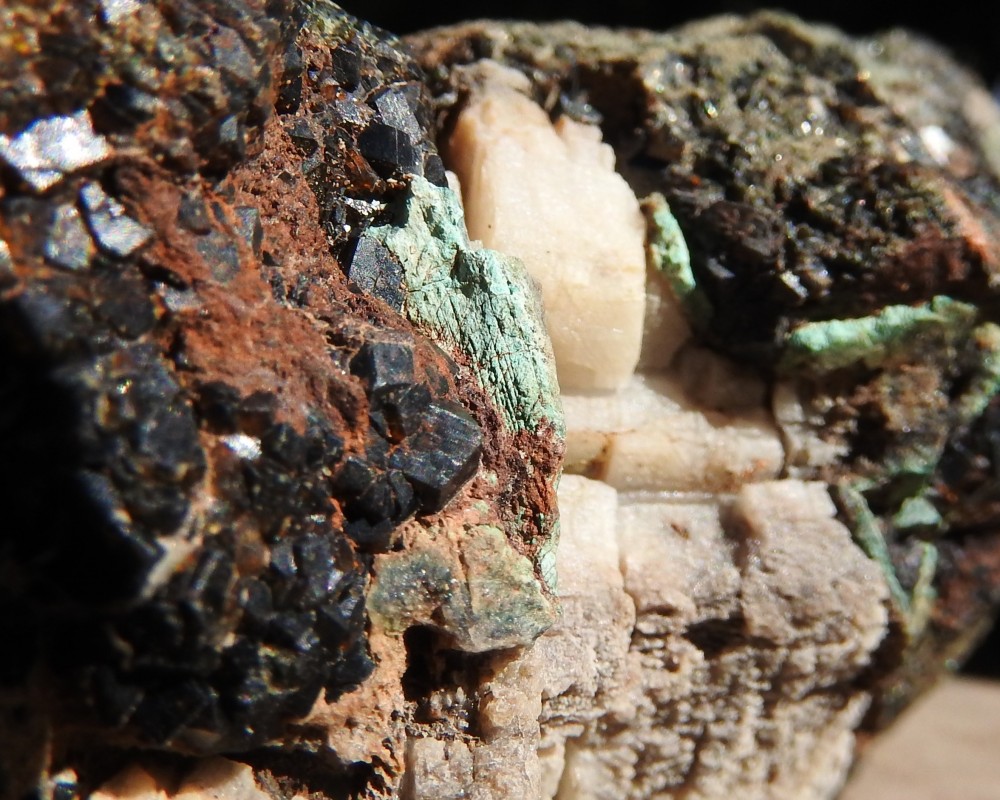 9-   association grenats, chrysocolle, calcédoine, hématite (derriere) et p'etre bien cuprite.... arête 1 cm,