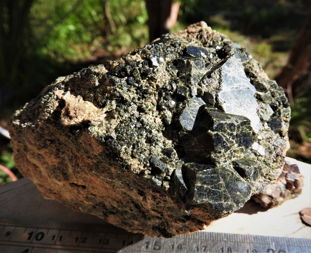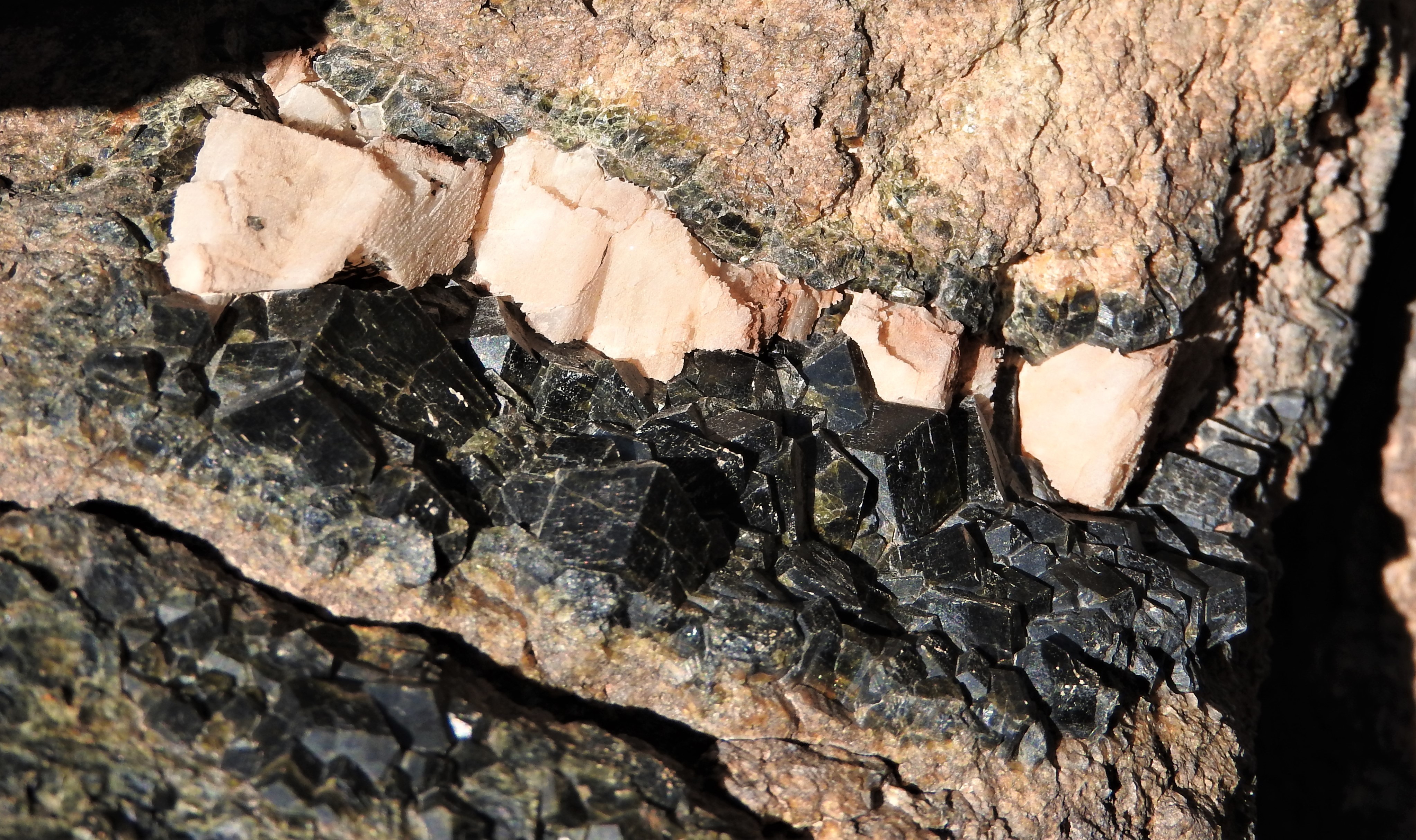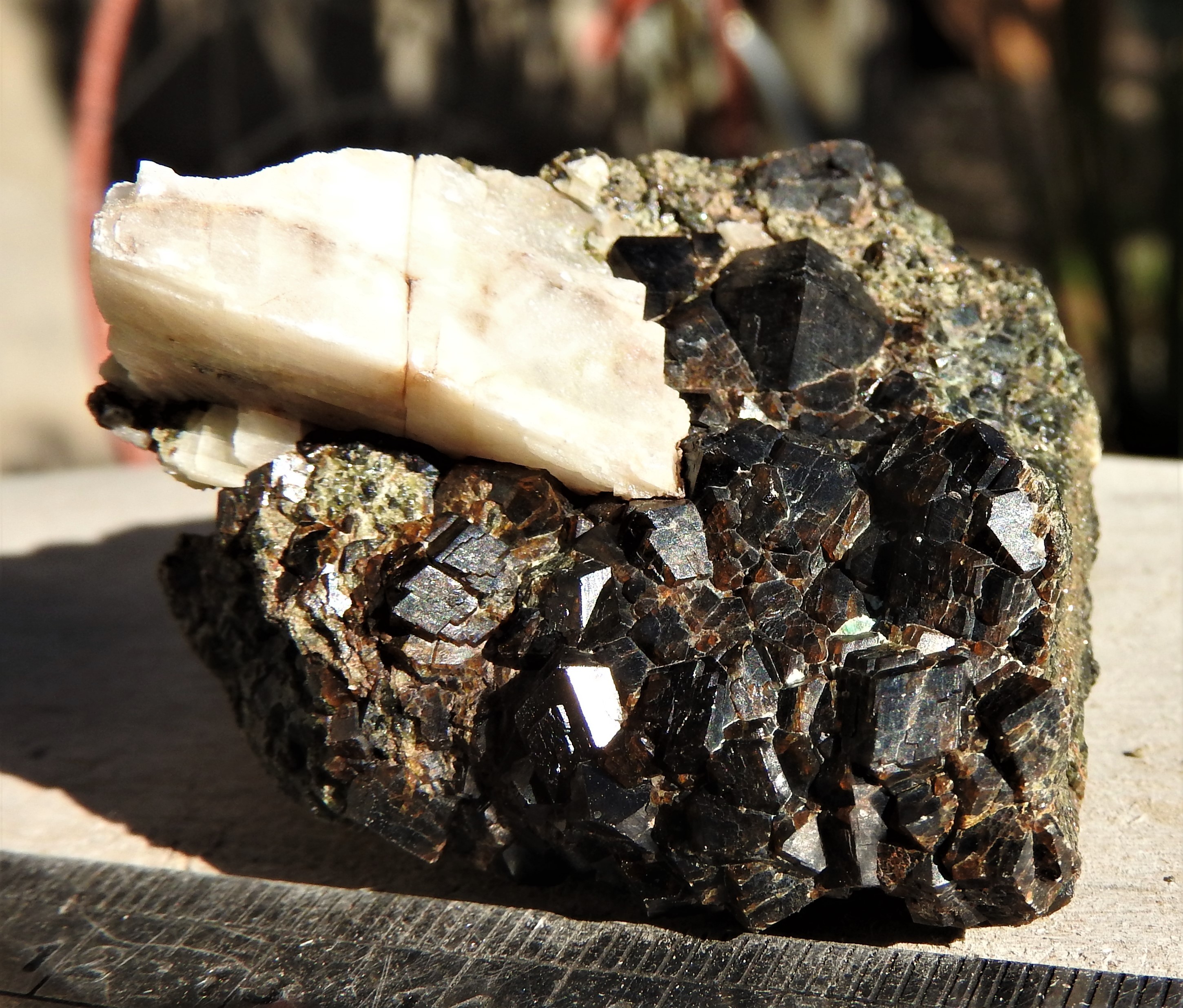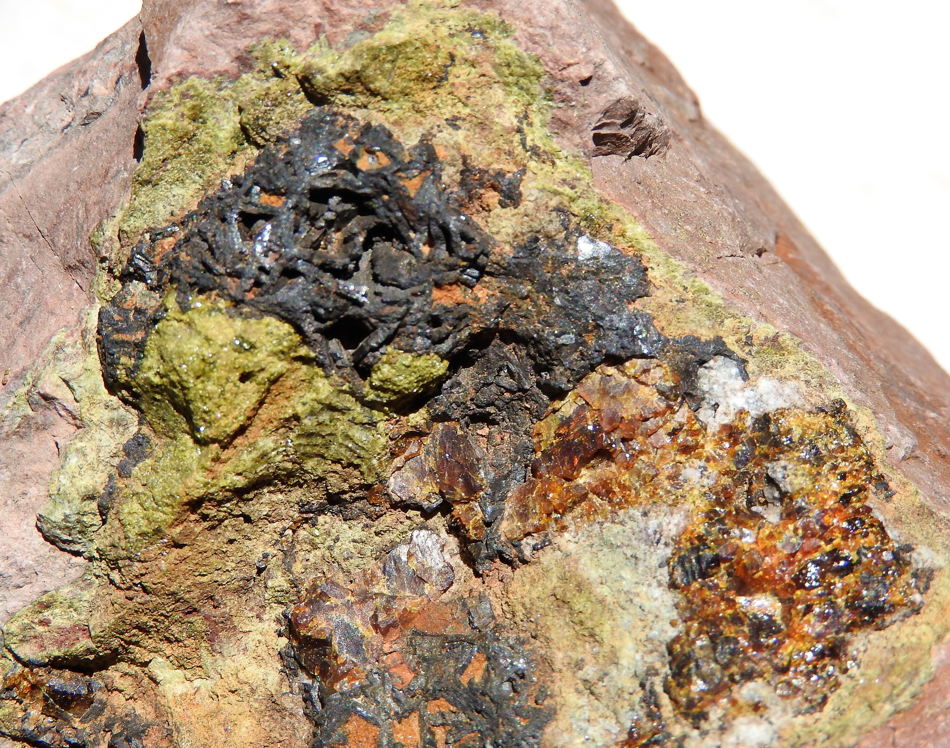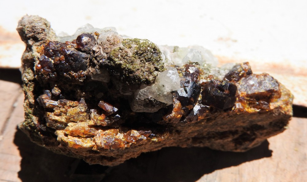 Sur ces photos : accompagnant le grenat et l'épidote, ne serait-ce pas du côté du diopside qu'il faille chercher pour les cristaux aplatis verts-noirs en haut de l'image ?