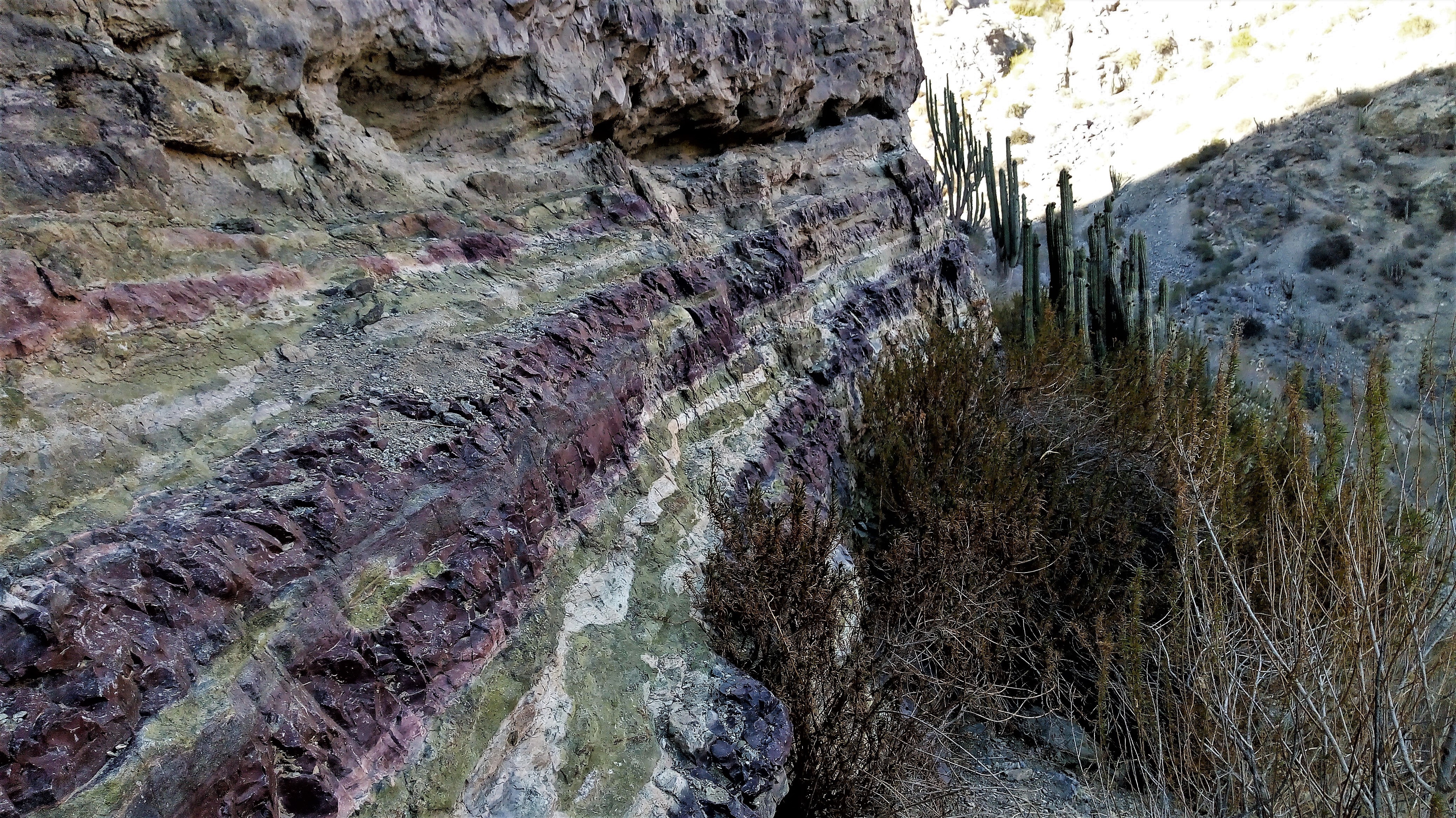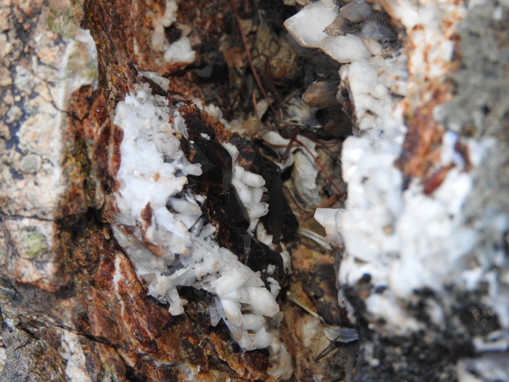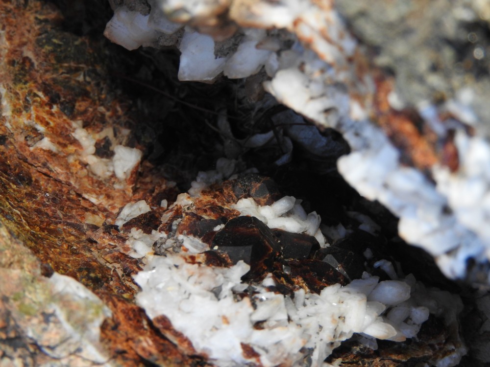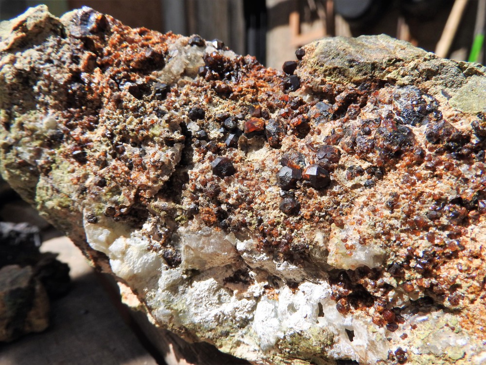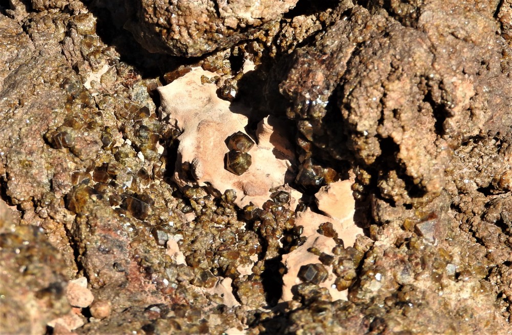 je suis toujours à l'ombre, la vue est sympa et une veine de grenats  affleure entre ces couches ,  comme ci-dessous,, dans les cavités  dues à l'érosion ,